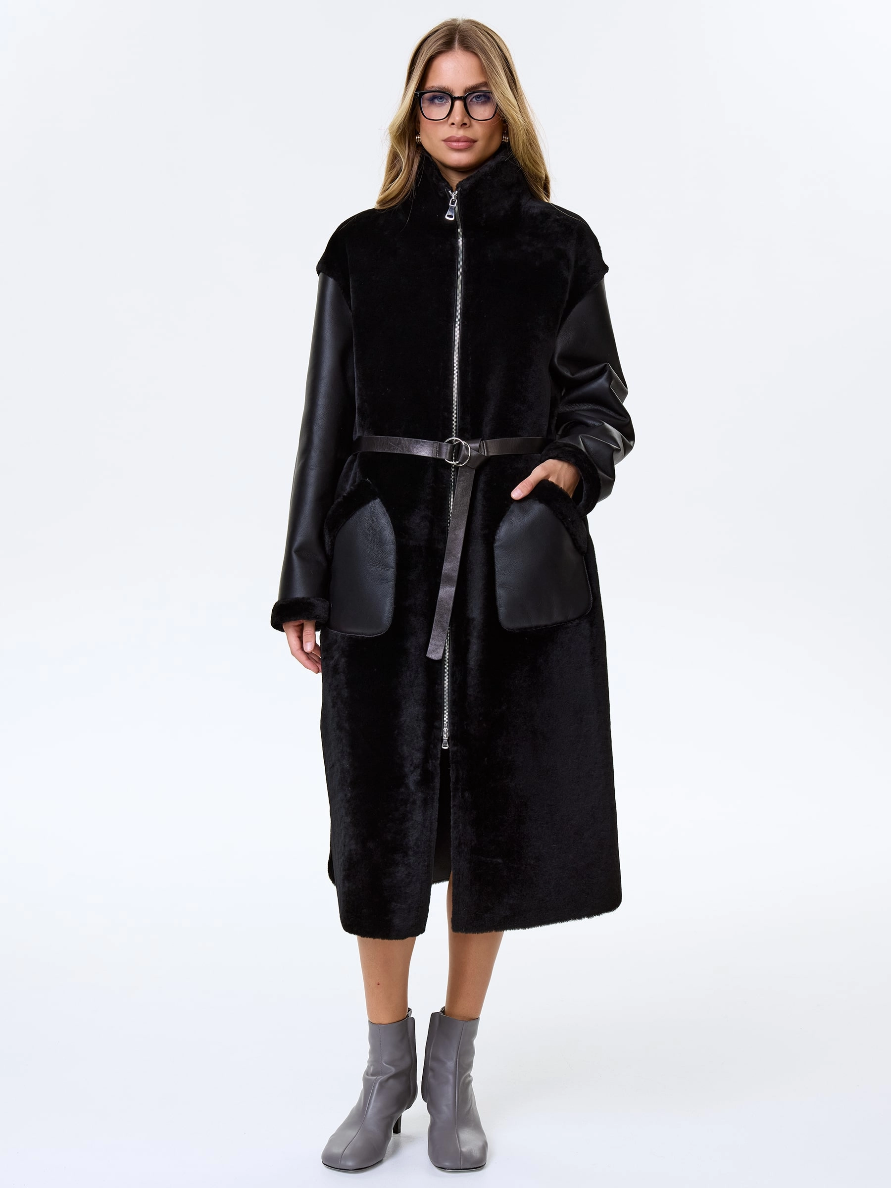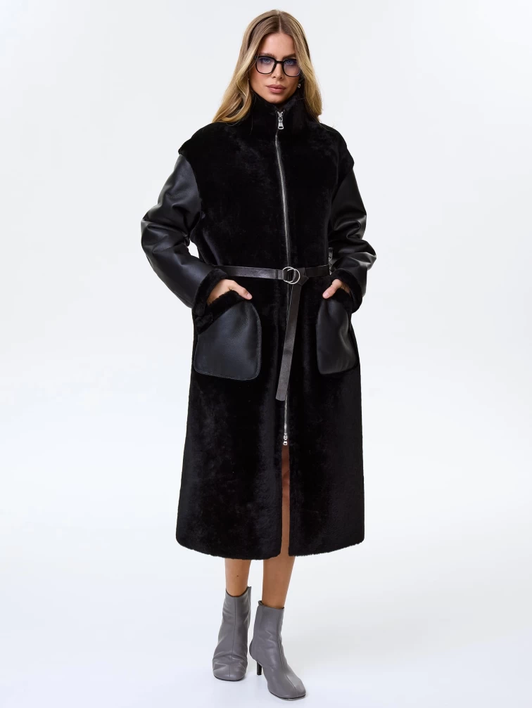 Товар длинное женское пальто из натуральной овчины премиум класса 2050, черное, размер 46, артикул 64310 выполнен из овчина "мерино" с застежкой молния. Рассчитан на сезон: осень-зима. Длина изделия 116 см, силуэт свободный.
