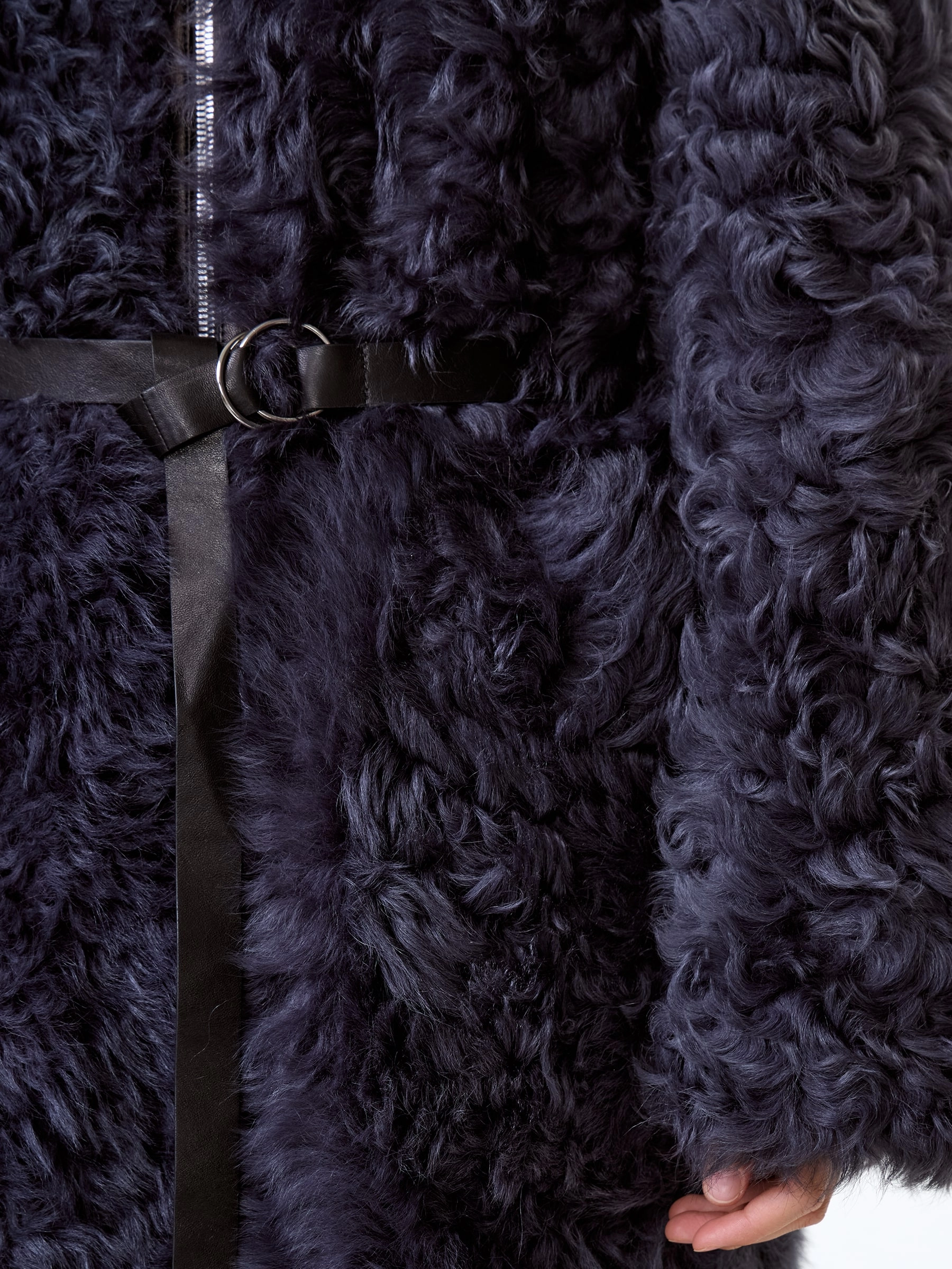 Длинное пальто свободного кроя пошили из шелковистой овчины тиградо снаружи и кожаной изнанкой. Воротник стойка, два врезных боковых кармана. Изменить силуэт поможет кожаный пояс. Изделие застегивается двухзамковой молнией.