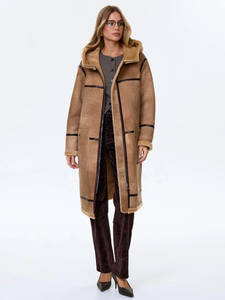 Длинное женское пальто с капюшоном из натуральной овчины премиум класса 2061, светло-коричневое, размер 44, артикул 64440