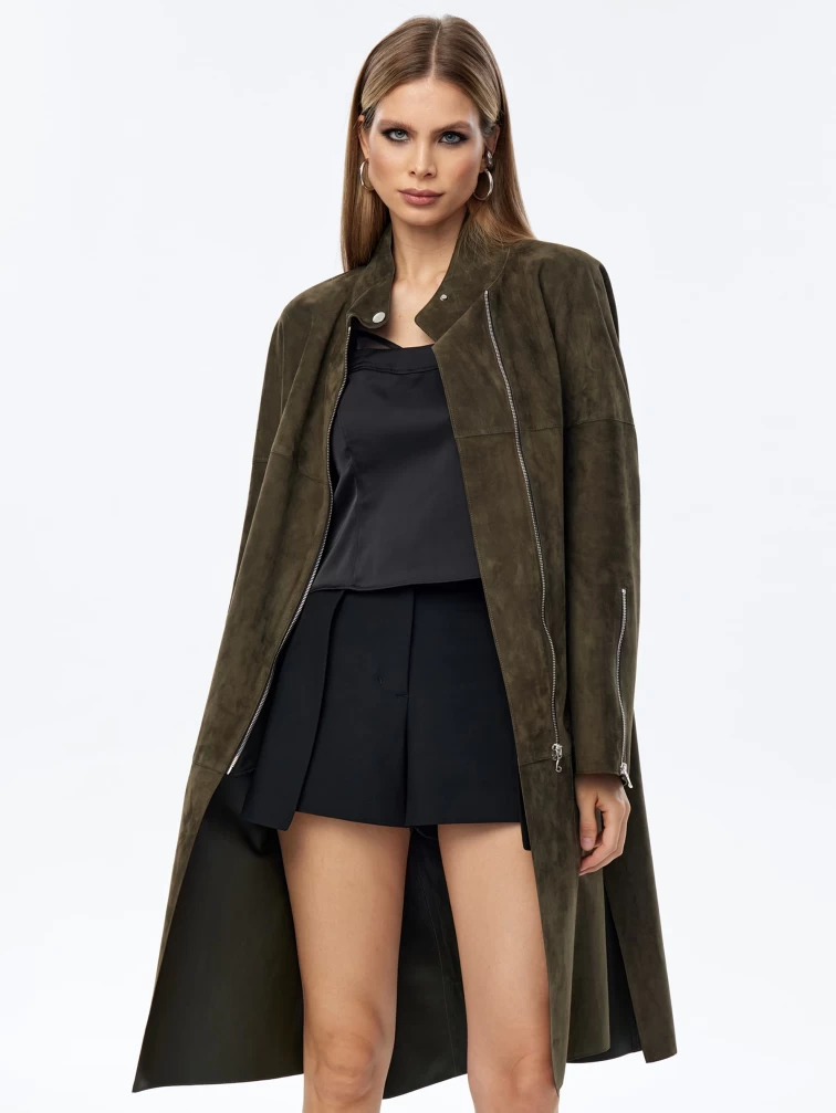 Товар длинный замшевый плащ оверсайз для женщин премиум класса 3041з, оливковый, размер 54, артикул 23580 выполнен из натуральной замши с застежкой молния. Рассчитан на сезон: весна-лето. Длина изделия 105 см, силуэт оверсайз.