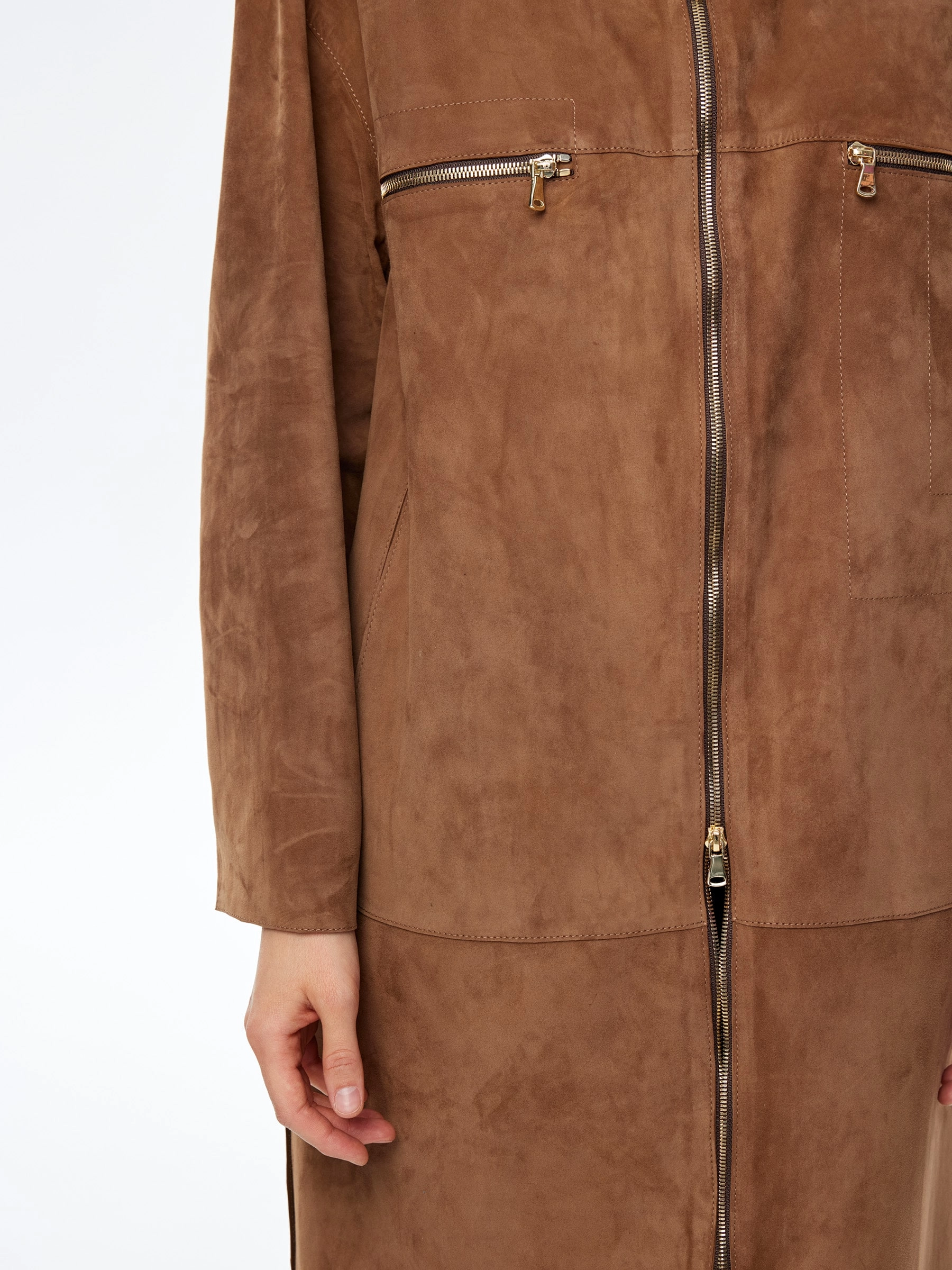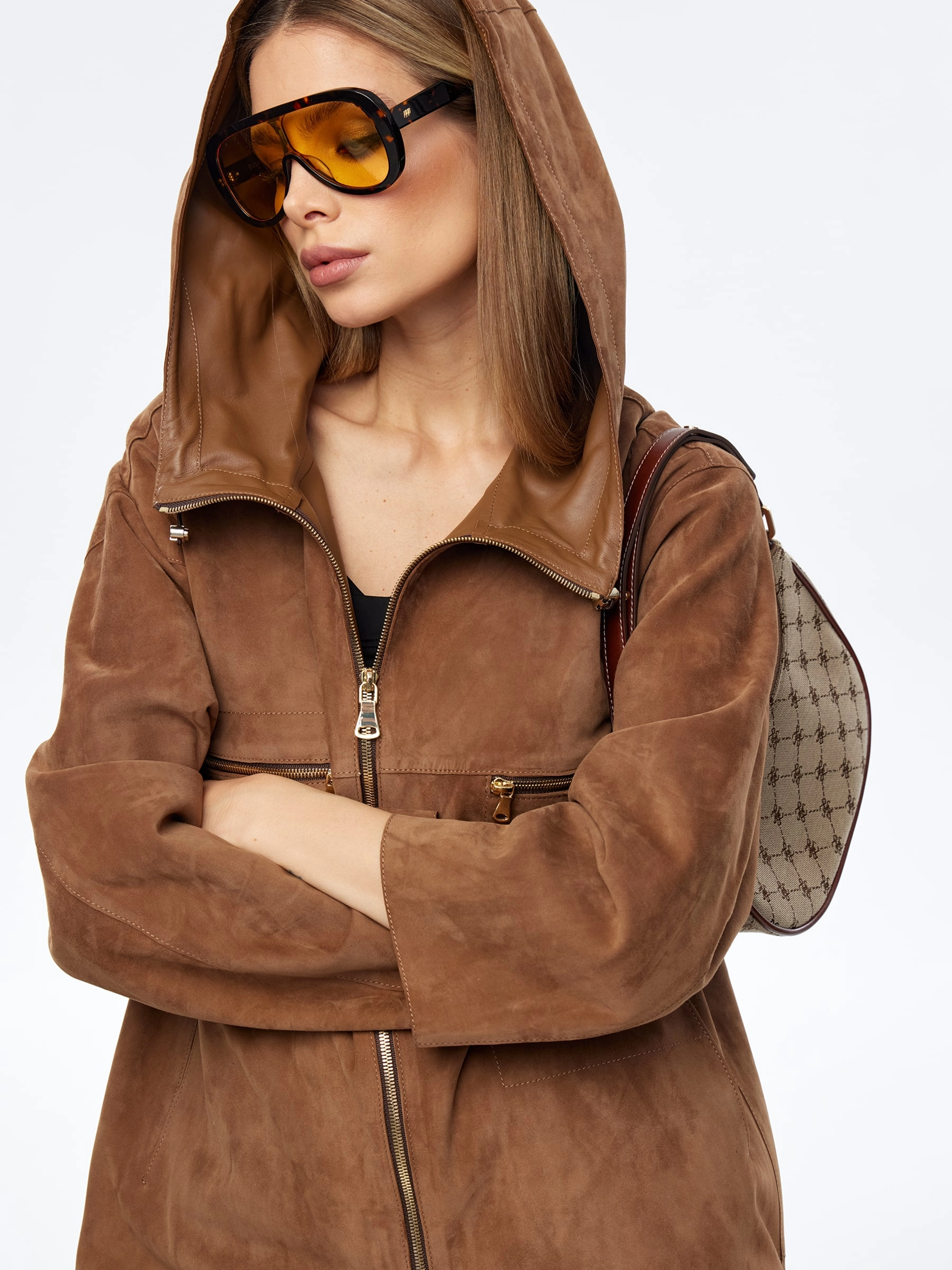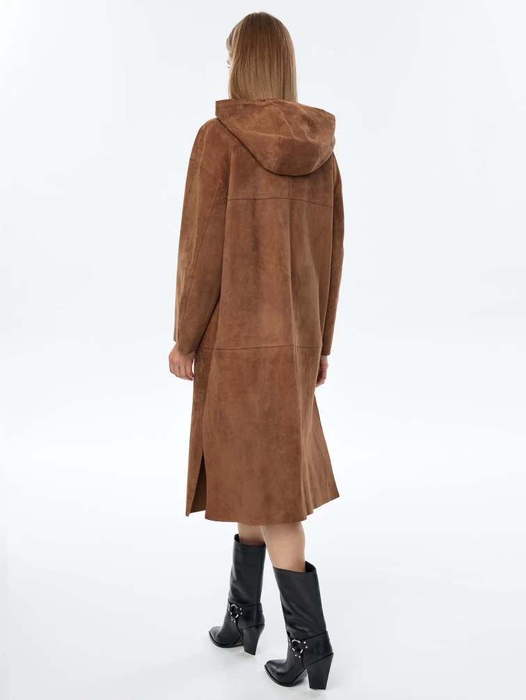 Создавая плащ свободного силуэта, мастера использовали тонкую натуральную замшу премиум класса. Модель комфортно садится по фигуре, не сковывает движения. За декор изделия с регулируемым капюшоном отвечают два небольших нагрудных кармана и боковые разрезы.