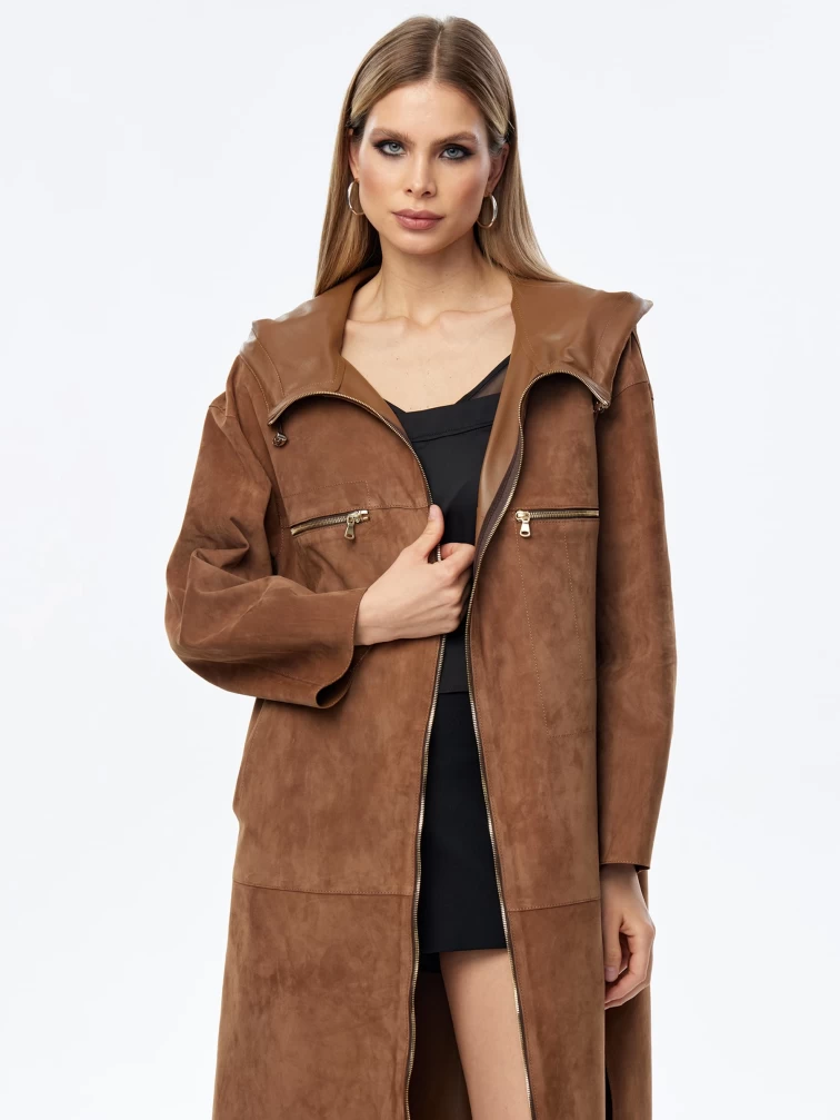 Товар длинный замшевый женский плащ оверсайз с капюшоном на молнии премиум класса 3058з, светло-коричневый, размер 52, артикул 23560 выполнен из натуральной замши с застежкой молния. Рассчитан на сезон: весна-лето. Длина изделия 110 см, силуэт оверсайз.