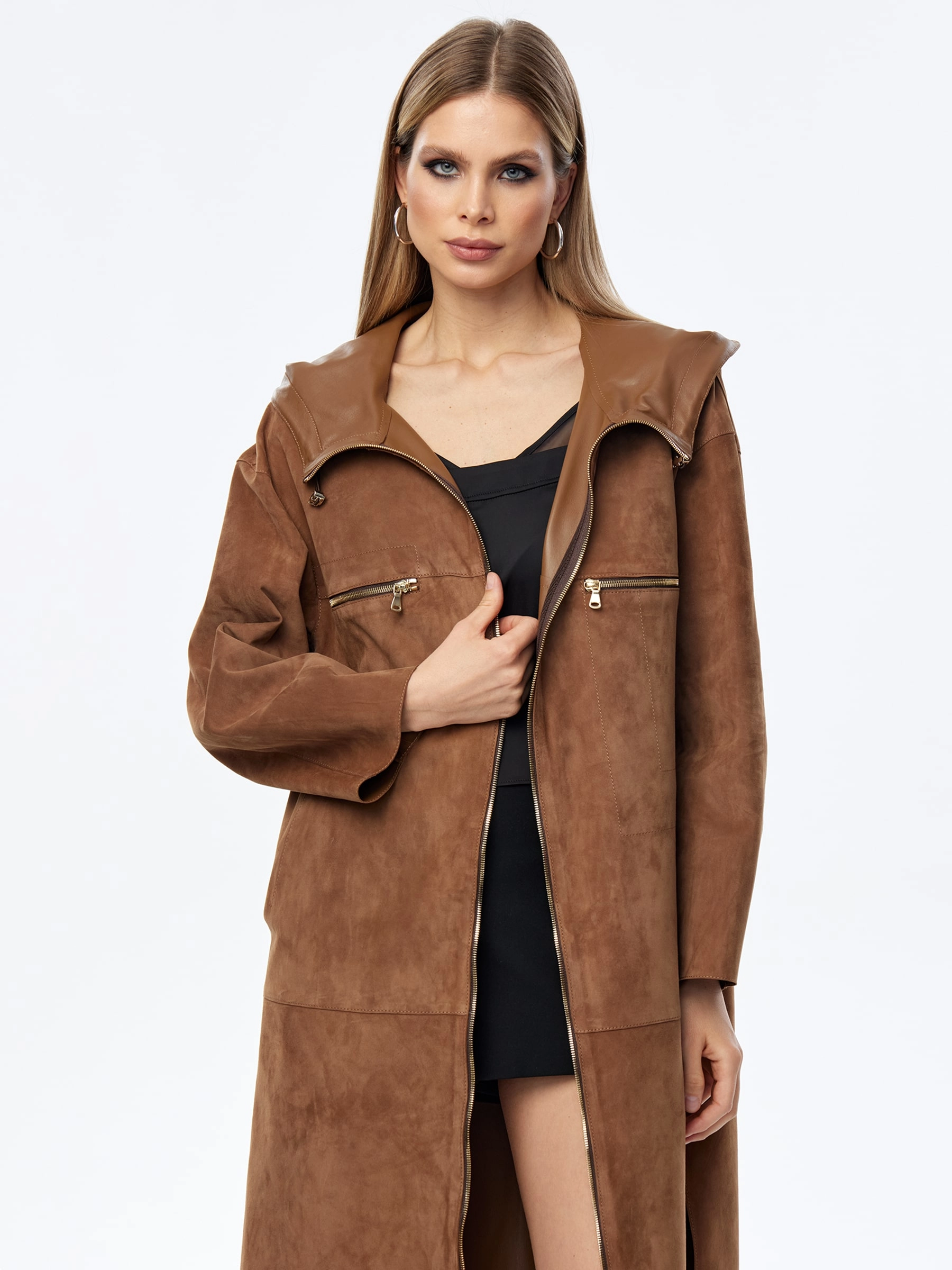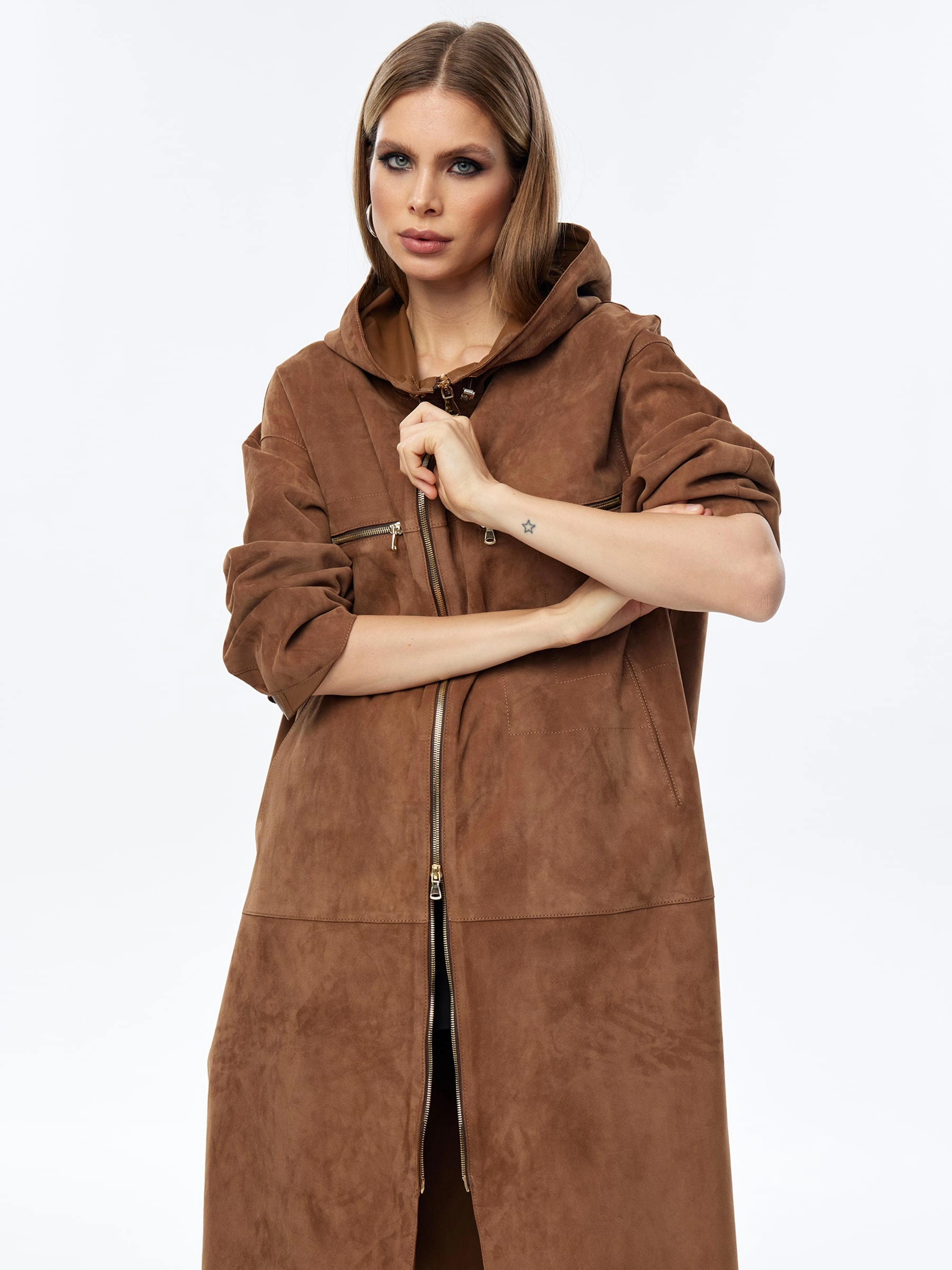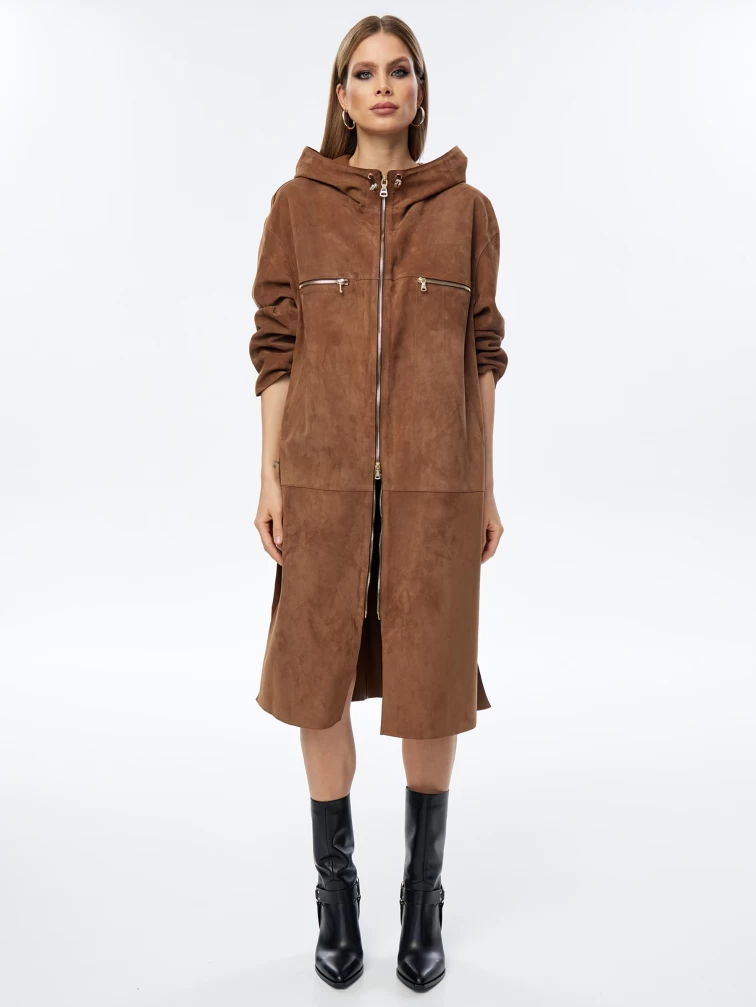 Длинный замшевый женский плащ оверсайз с капюшоном на молнии премиум класса 3058з, светло-коричневый, размер 52, артикул 23560