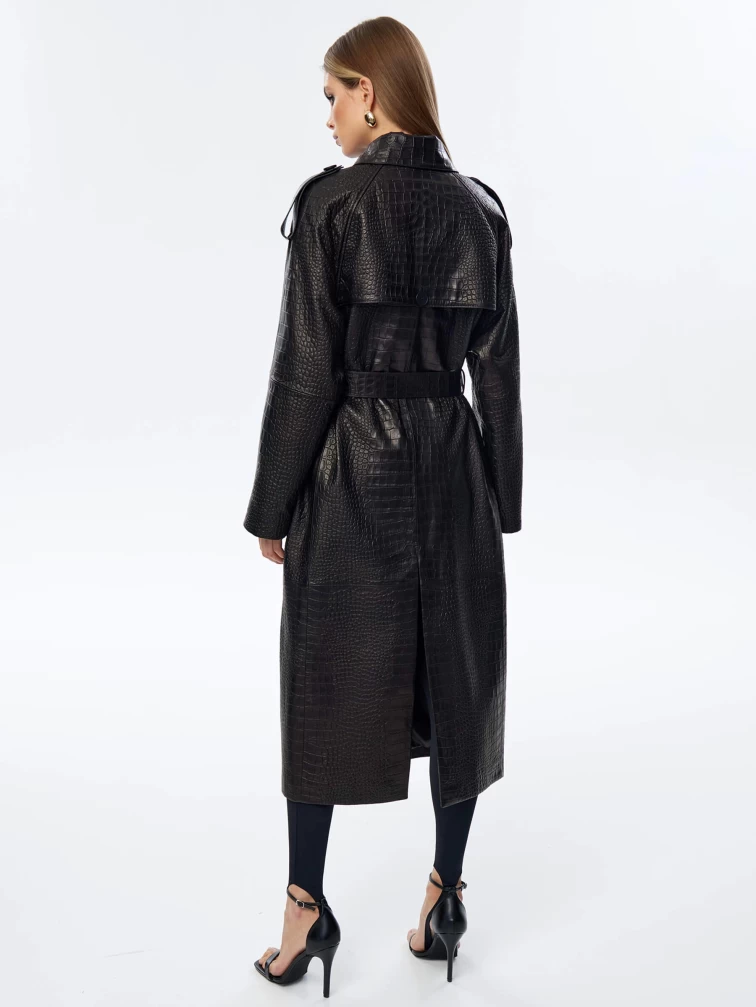 Длинный женский кожаный плащ с принтом под крокодила премиум класса 3071, черный, размер 54, артикул 23870
