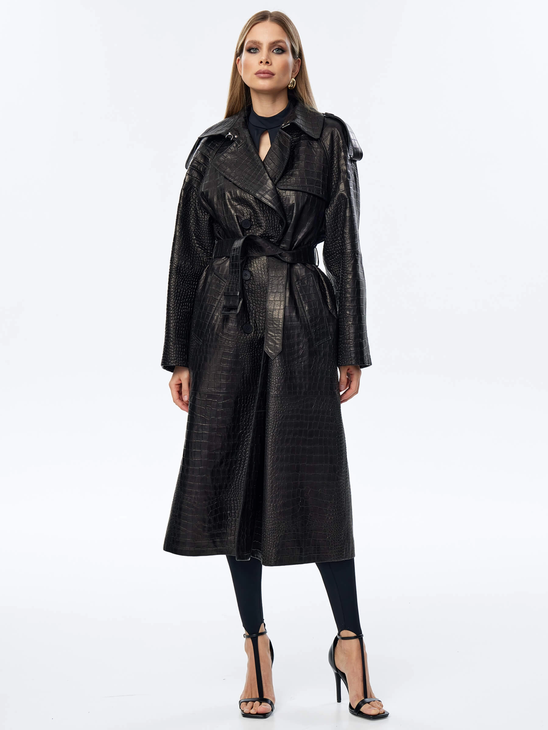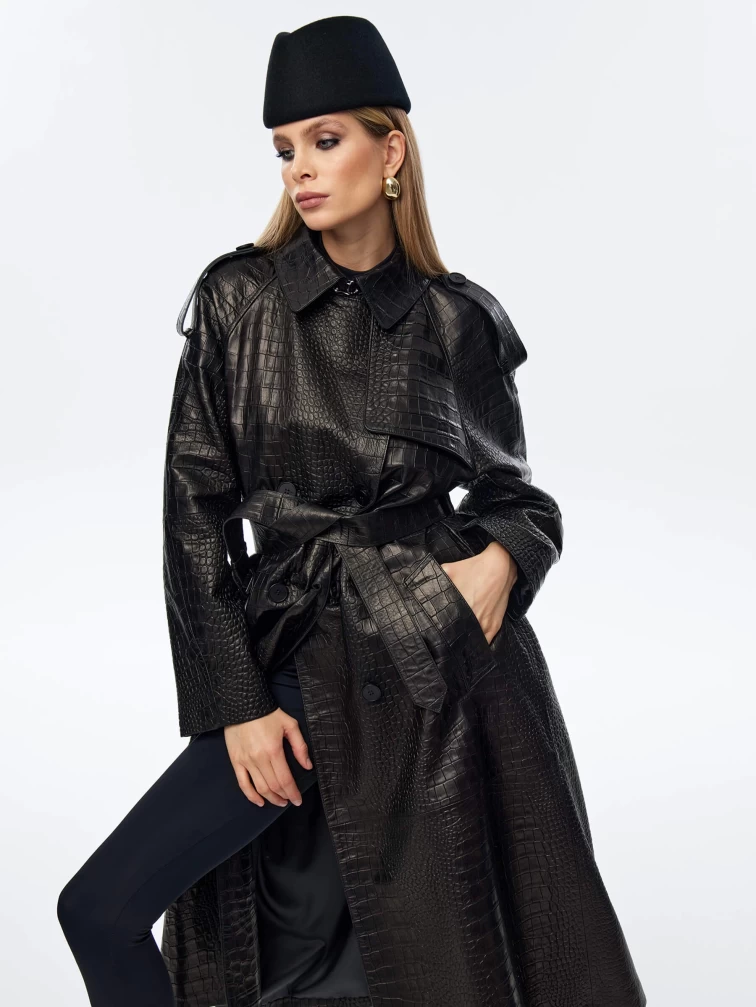 Длинный двубортный плащ выполнили из фактурной кожи премиум класса. Прямой крой, английский воротник, врезные боковые карманы. Изделие дарит не только комфорт, но и подчеркивает женственность. Модель с отлетной кокеткой и погонами дополнили широким кожаным поясом в тон.