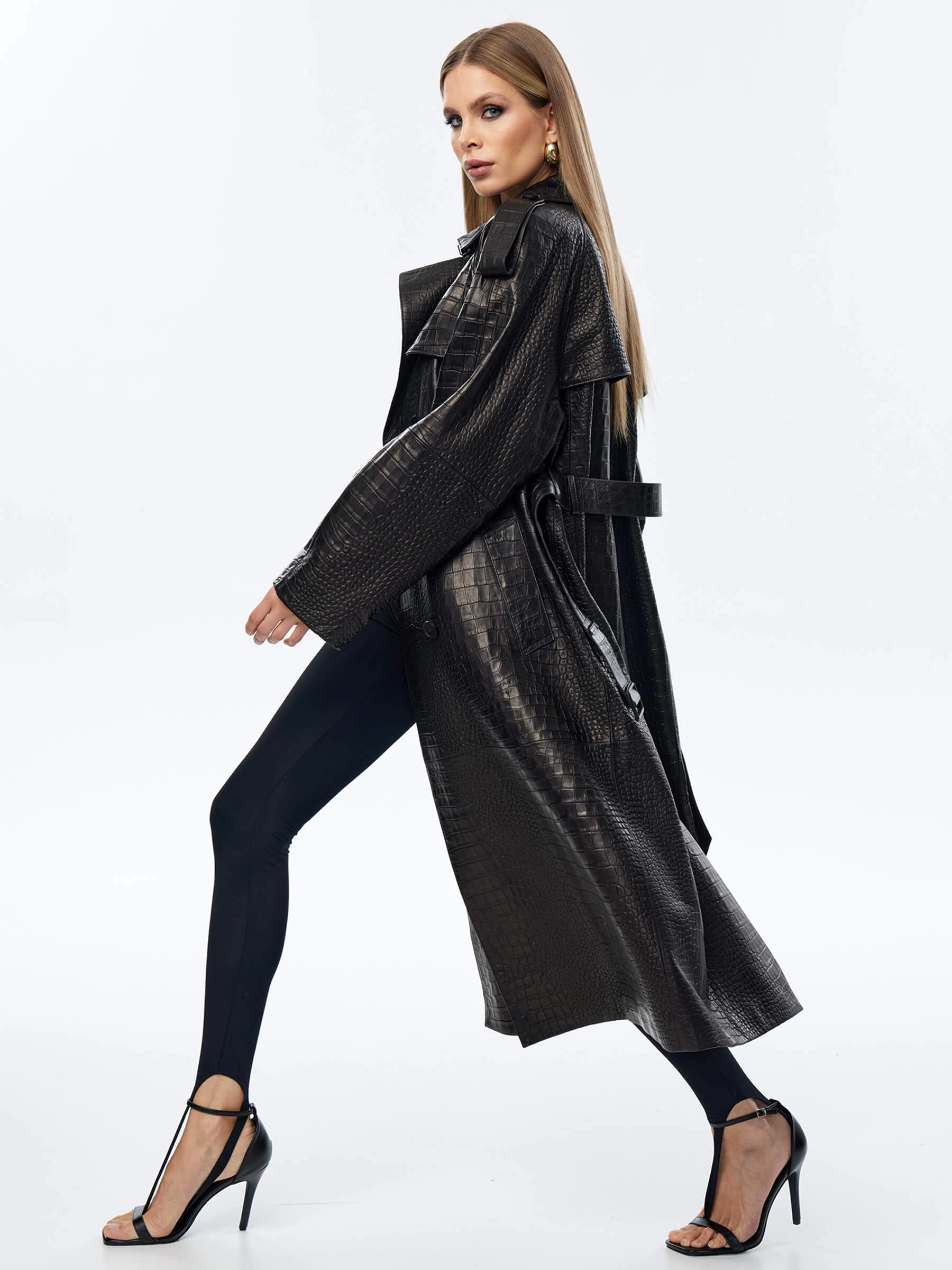 Товар длинный женский кожаный плащ с принтом под крокодила премиум класса 3071, черный, размер 54, артикул 23870 выполнен из натуральной кожи с застежкой пуговицы. Рассчитан на сезон: весна-осень. Длина изделия 120 см, силуэт свободный.
