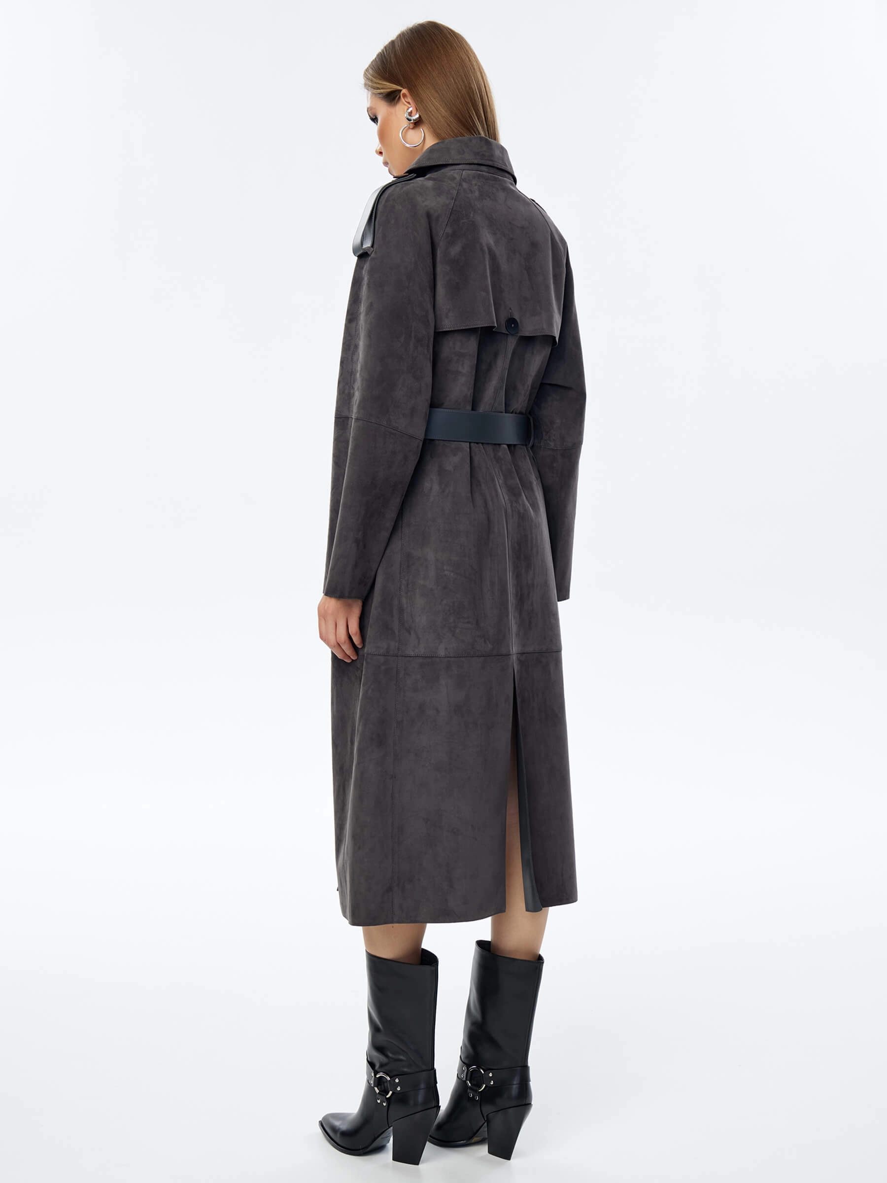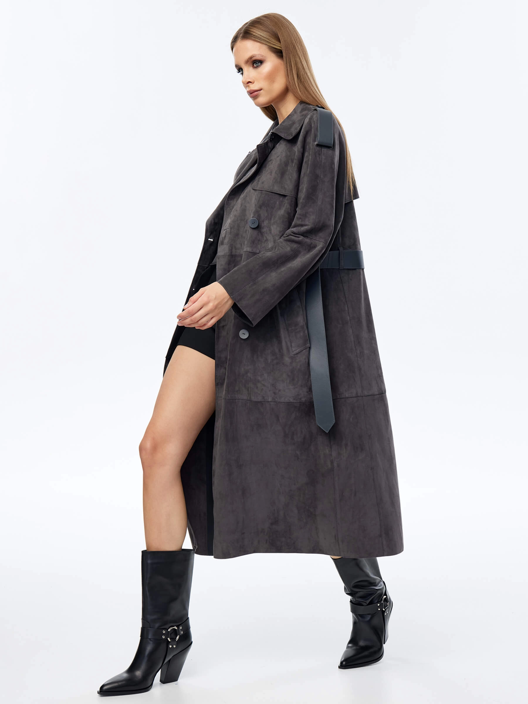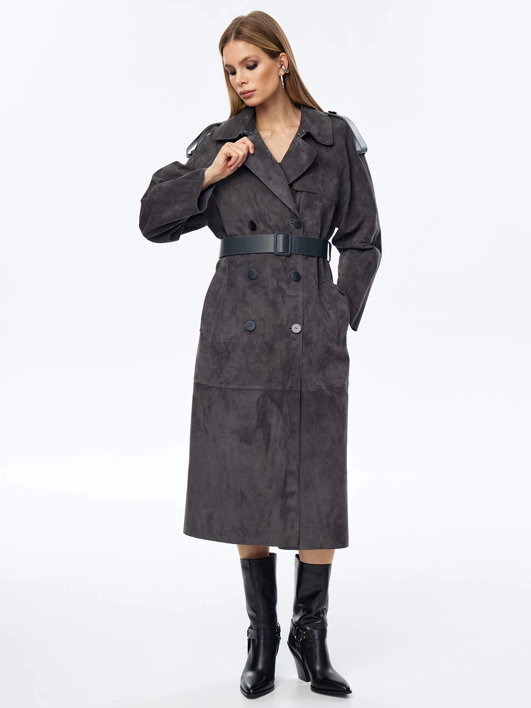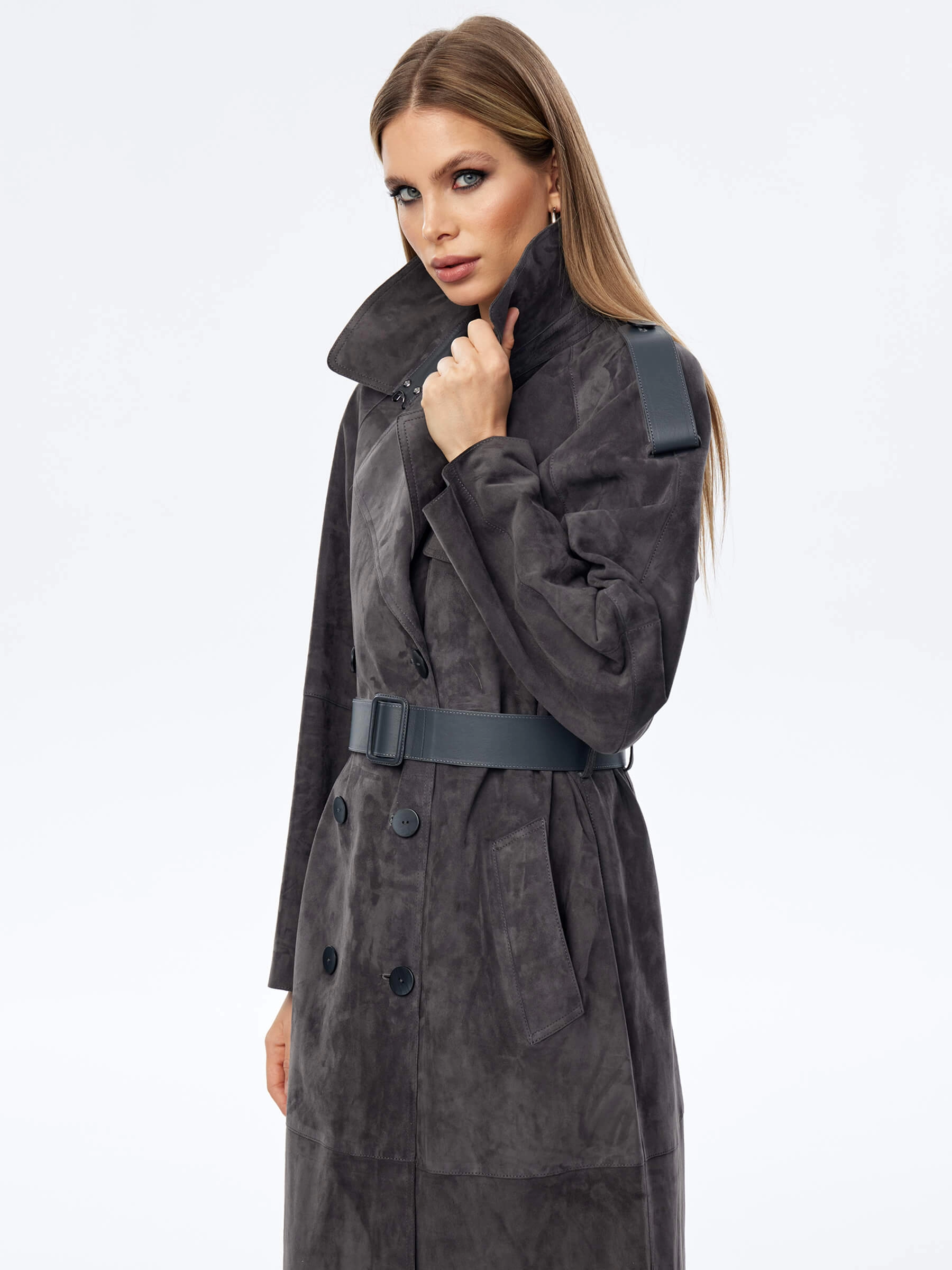 Длинный двубортный плащ выполнили из тонкой нежной замши. Прямой крой, английский воротник, врезные боковые карманы. Изделие дарит не только комфорт,но и подчеркивает женственность. Модель с отлетной кокеткой и погонами дополнили широким кожаным поясом в тон.