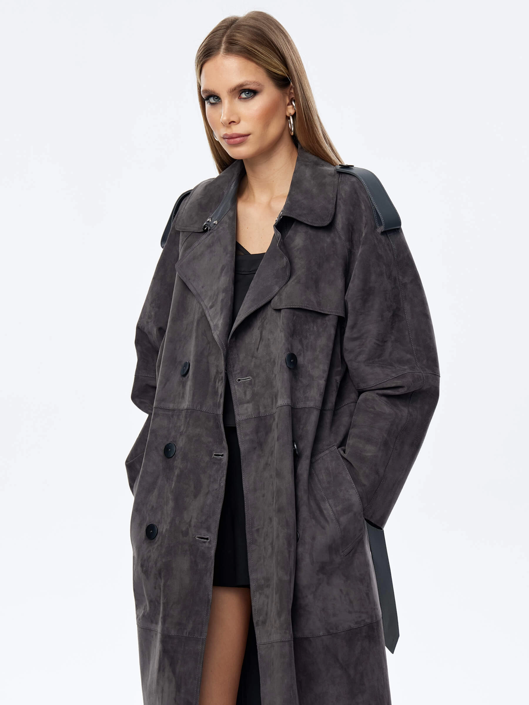Товар длинный женский замшевый плащ френч оверсайз премиум класса 3070з, темно-серый, размер 44, артикул 23850 выполнен из натуральной замши с застежкой пуговицы. Рассчитан на сезон: весна-лето. Длина изделия 120 см, силуэт прямой.