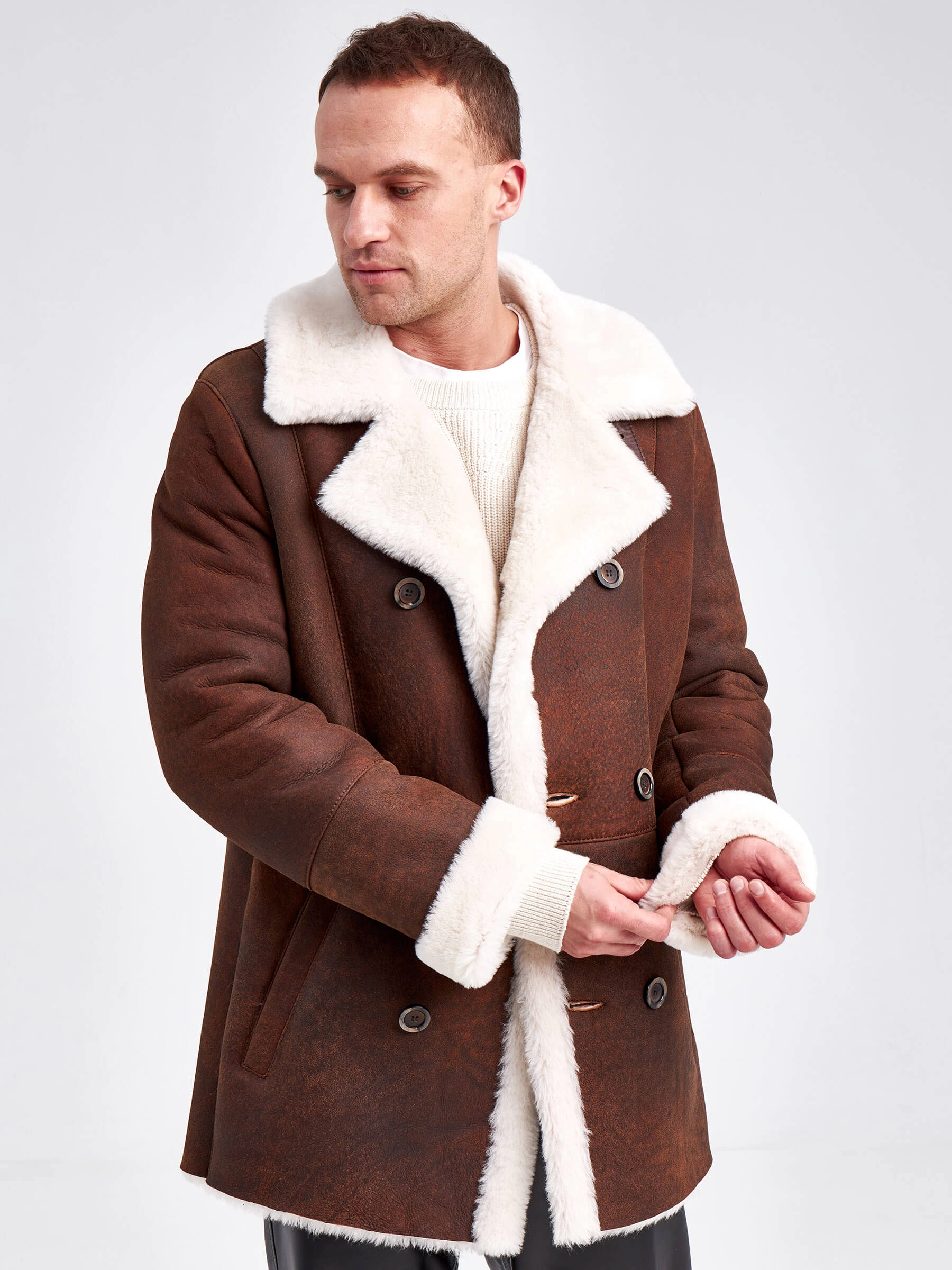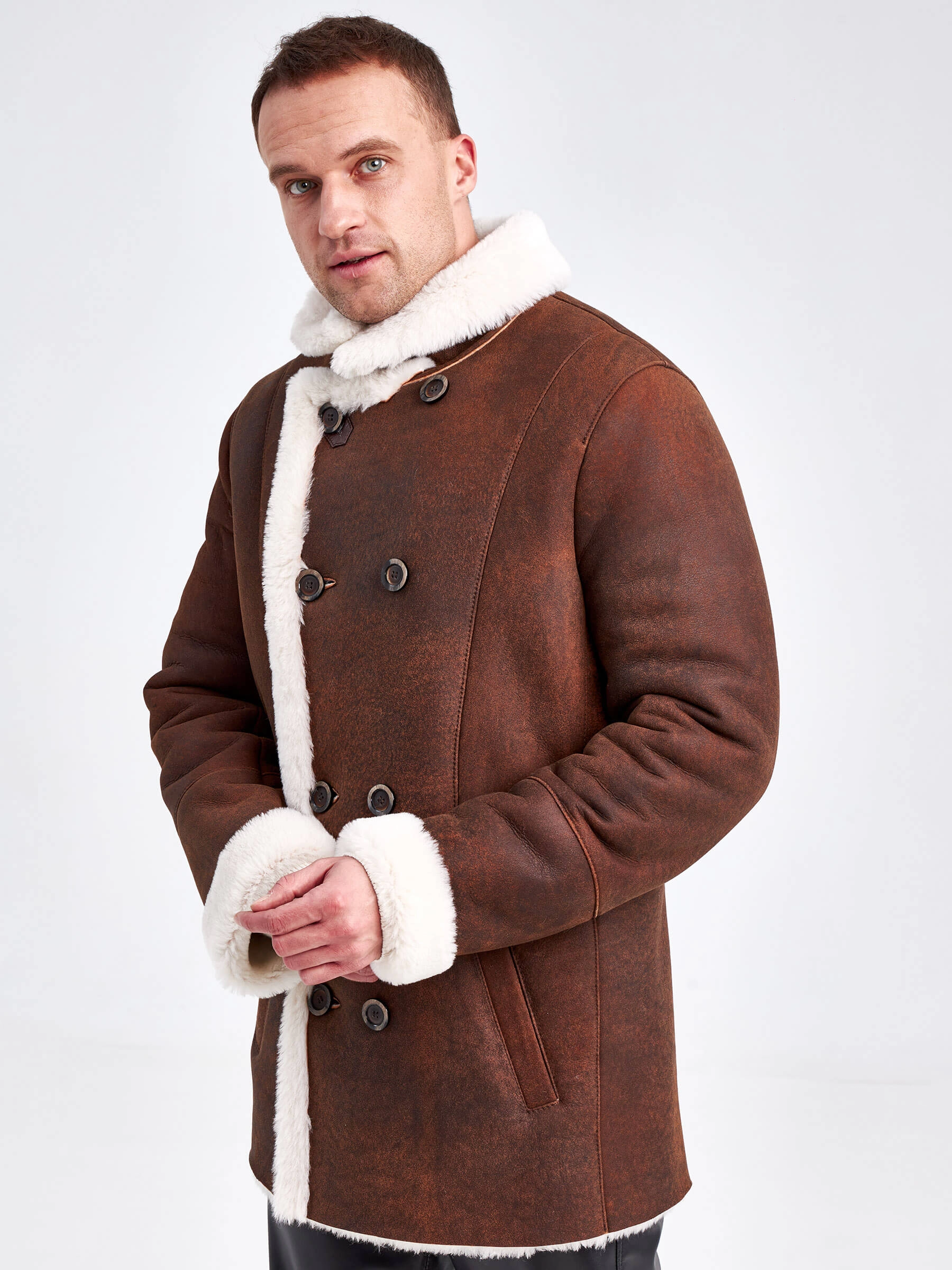 Стильная двубортная мужская дублёнка. Максимально густой мех прекрасно защитит от любого мороза. Новейшее устойчивое защитное покрытие. Длина рукавов регулируется манжетами-отворотами. Предусмотрены внутренние карманы для документов. Чёткая, выверенная посадка по фигуре. Минимальный вес. Безупречная работа наших портных. Премиальный уровень.