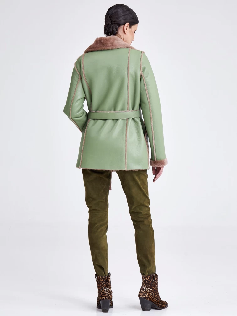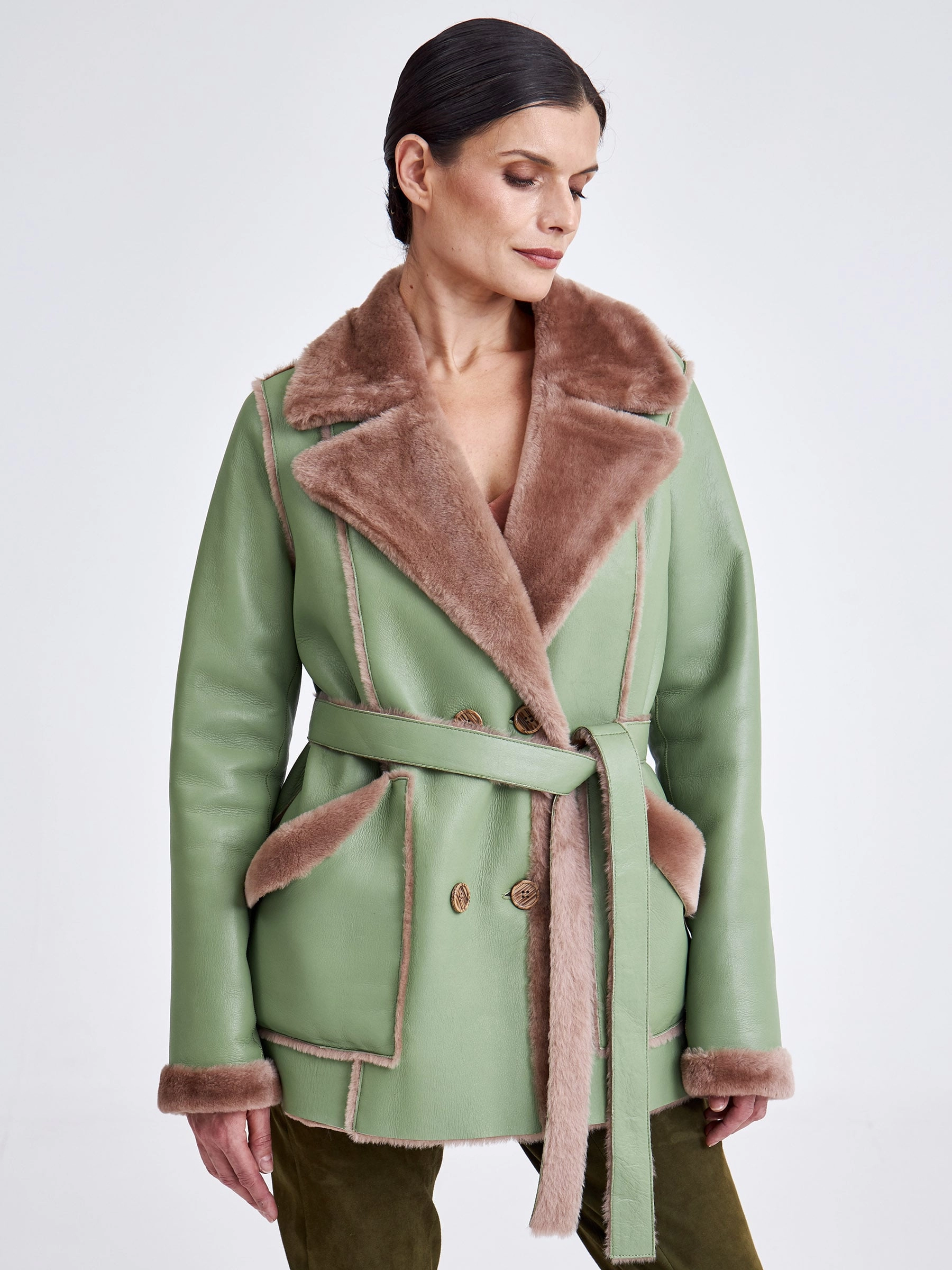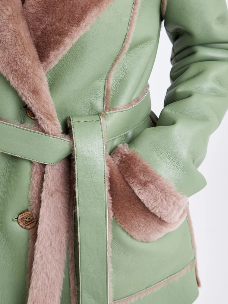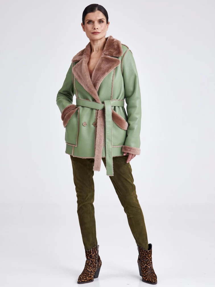 Для создания двубортной дубленки использовали мягую тонкую овчину.Вещь получилась легкой и пластичной. Внутренняя сторона хорошо сохраняет тепло. Прямой силуэт, английский воротник. Завершили модель двумя большими карманами с меховым отворотом и длинным поясом.На первый план выходит качество и комфортная посадка.