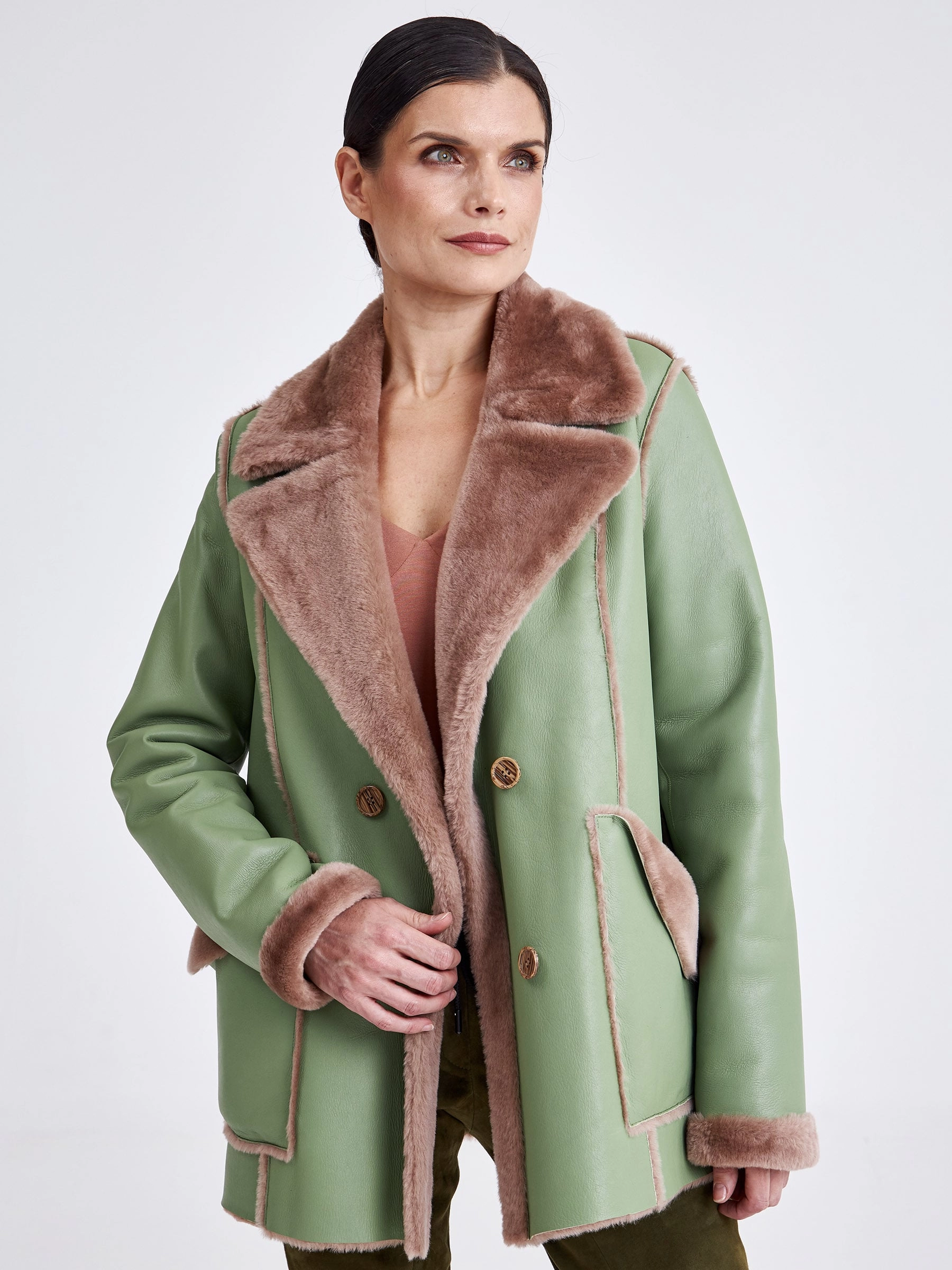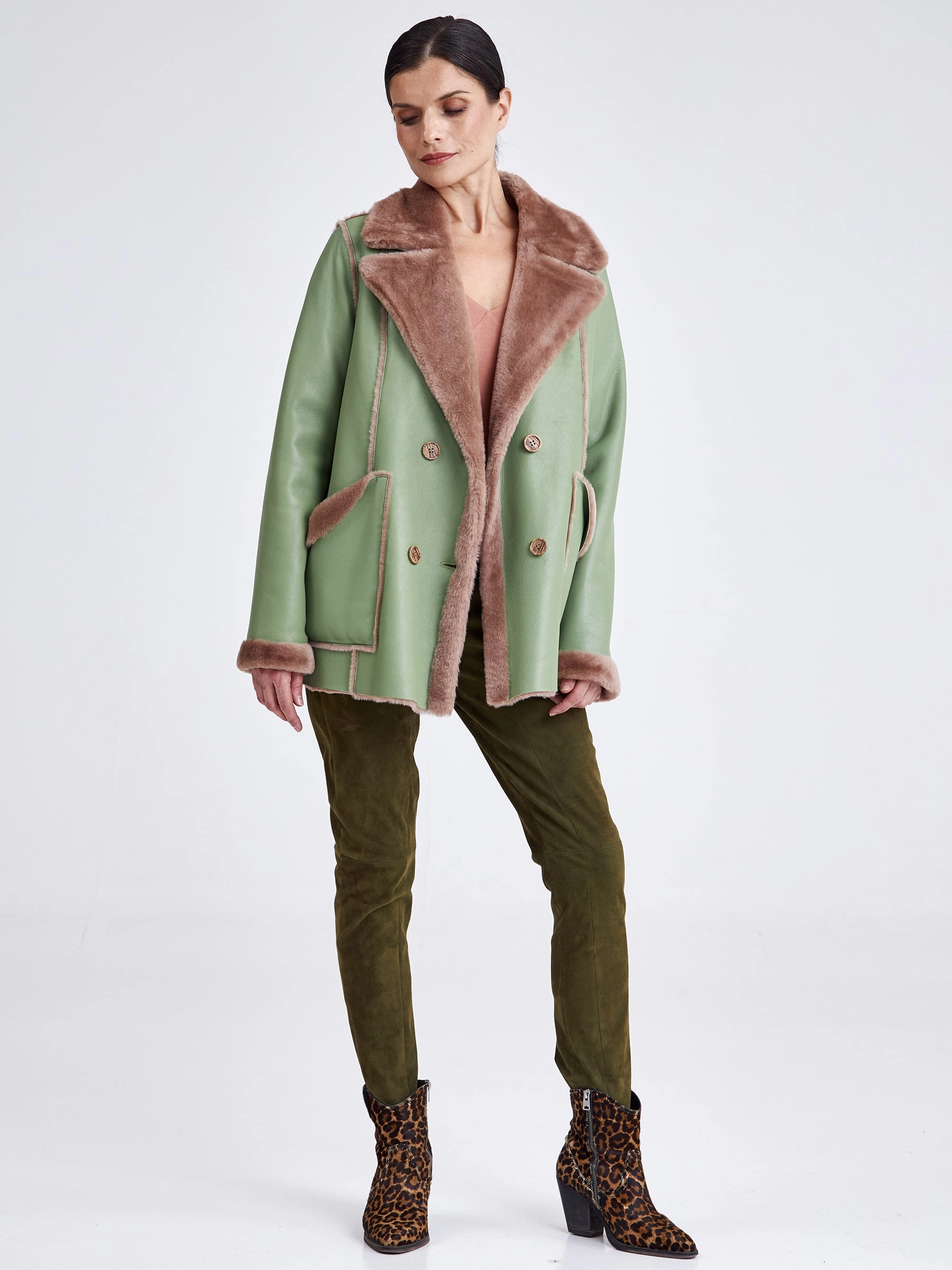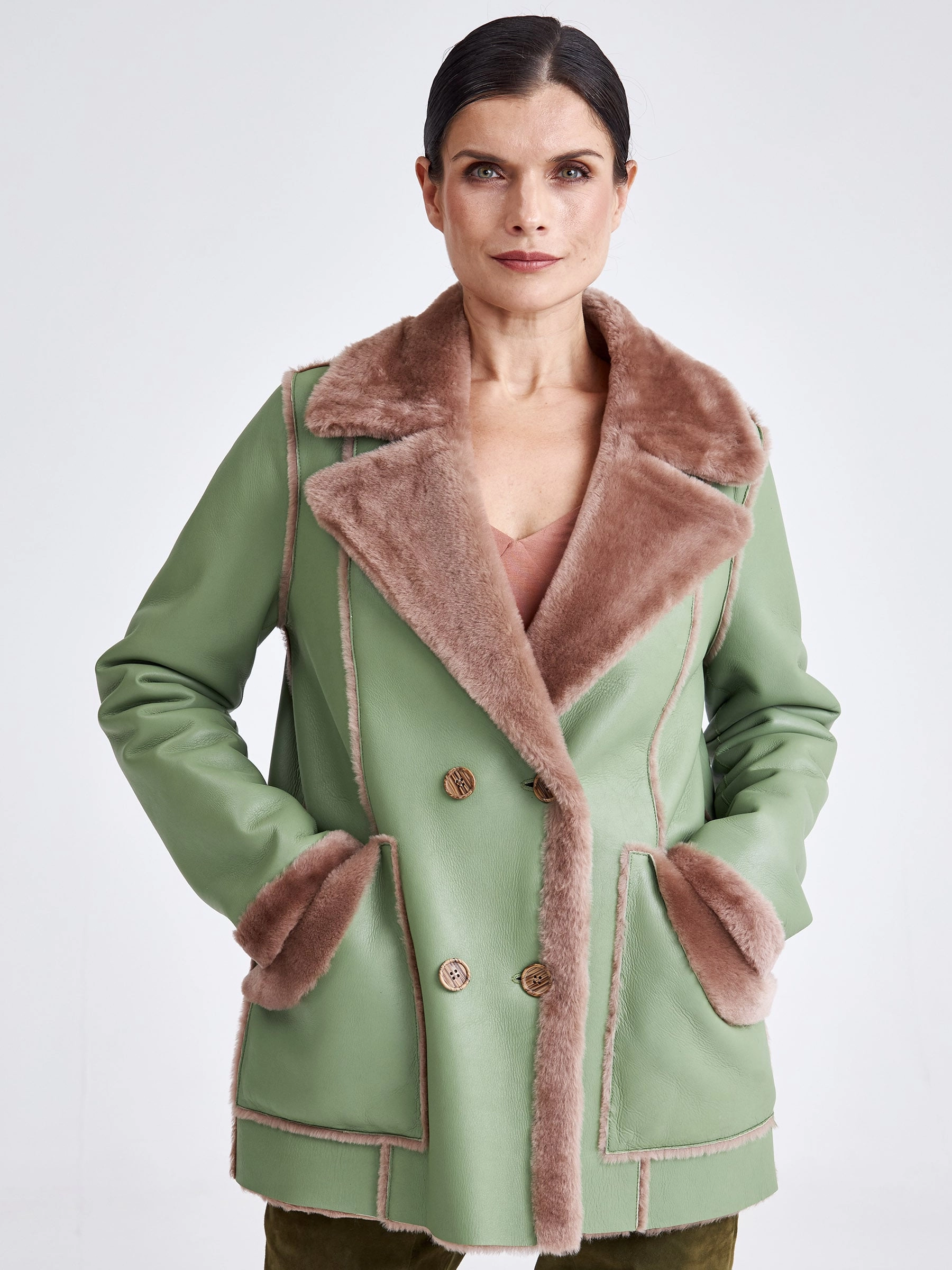 Двубортная короткая женская дубленка премиум класса 2010, оливковая, размер 48, артикул 62640
