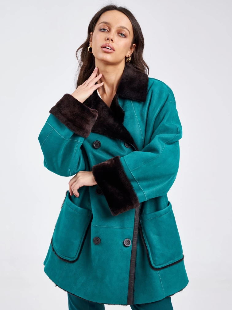 Короткая двубортная дубленка выполнена из нежнейшей шелковистой овчины.Свободный крой, английский воротник, два крупных накладных кармана. Модель получилась легкой и теплой.