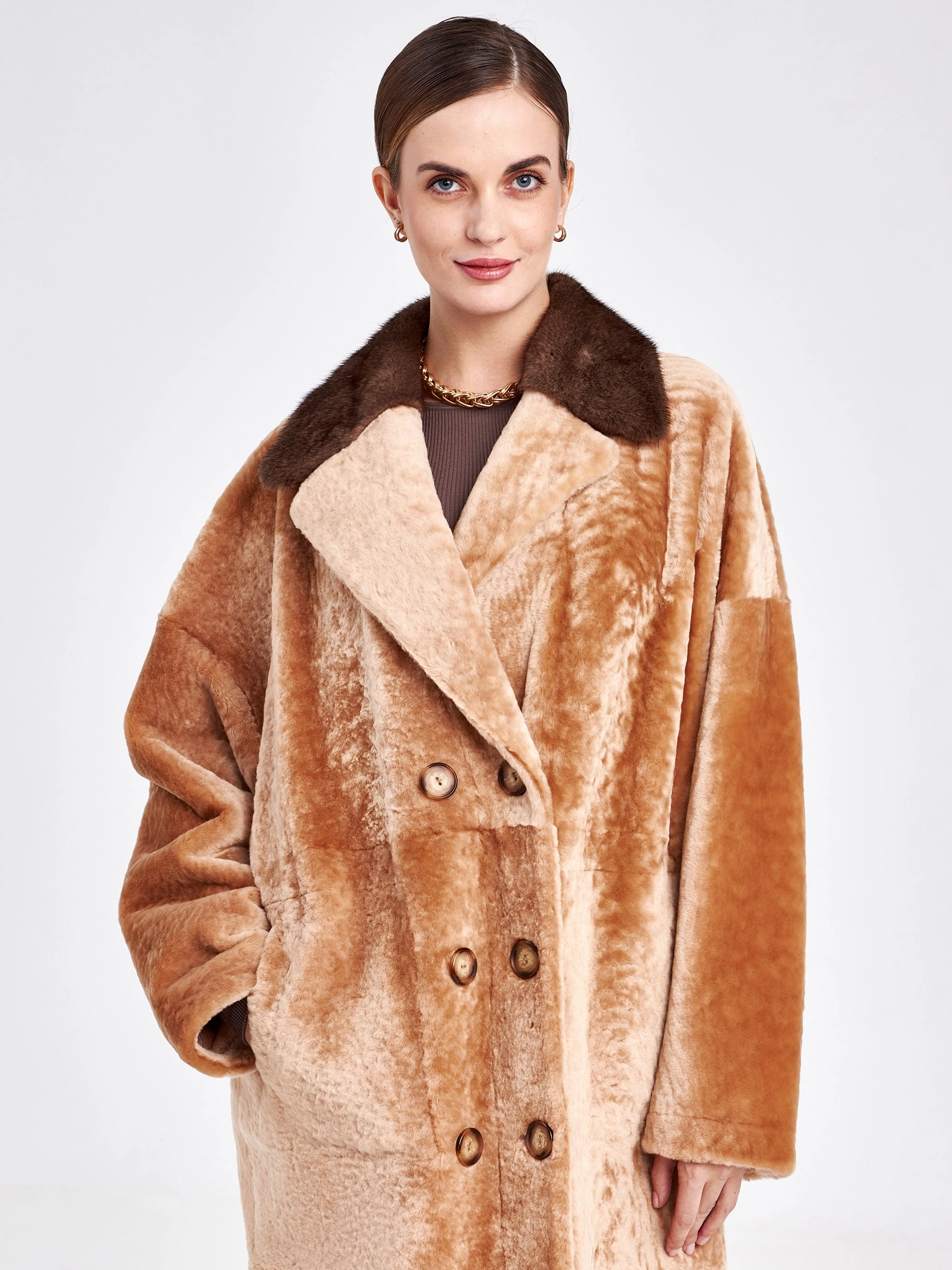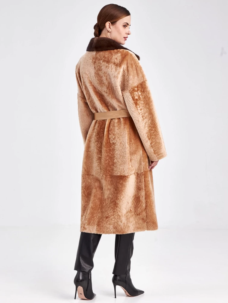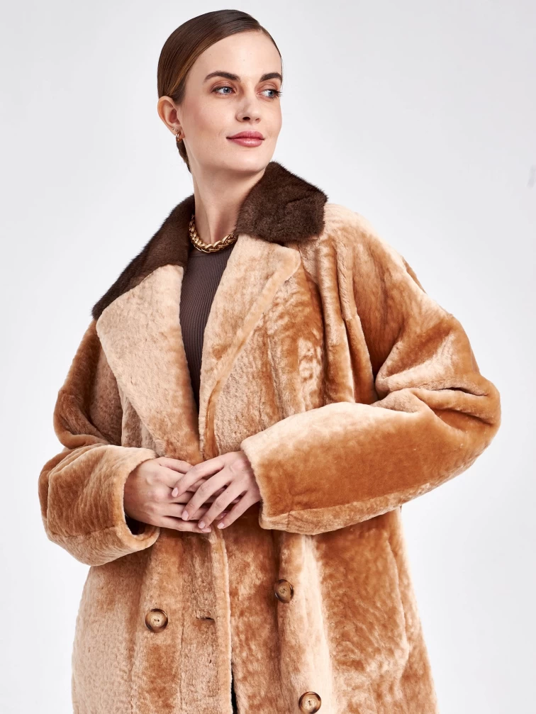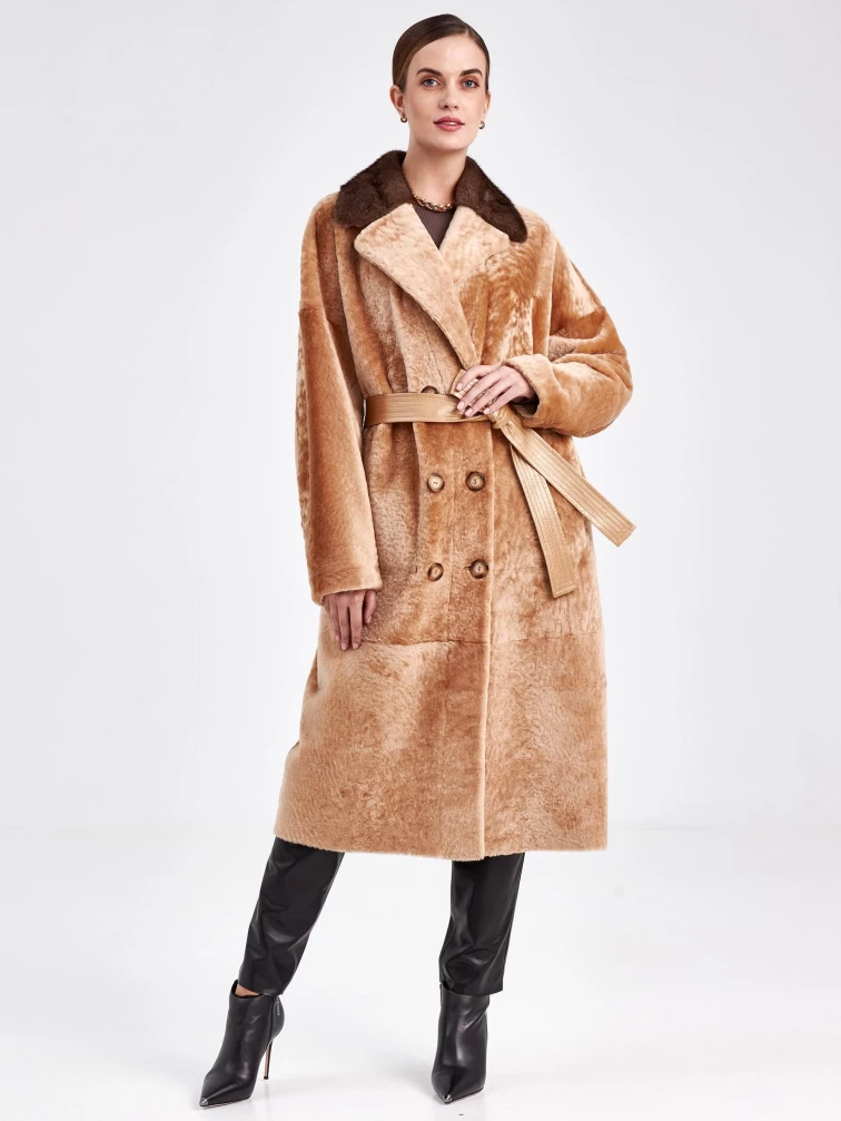 Двубортная двусторонняя женская дубленка из астрагана с мехом норки премиум класса 2017, бежевая, размер 46, артикул 62760