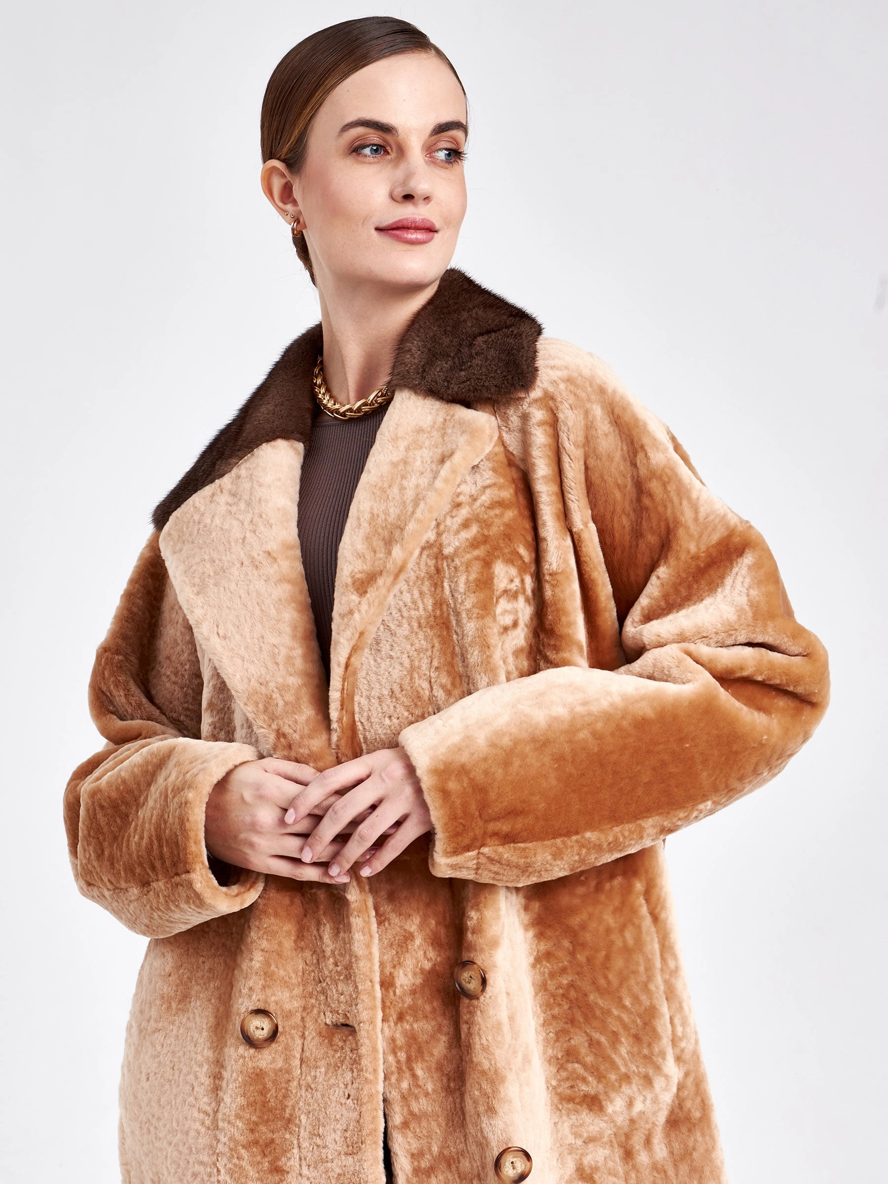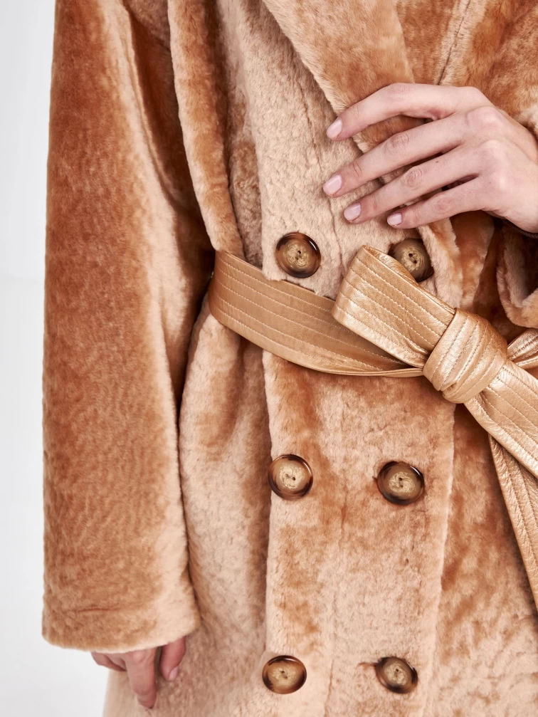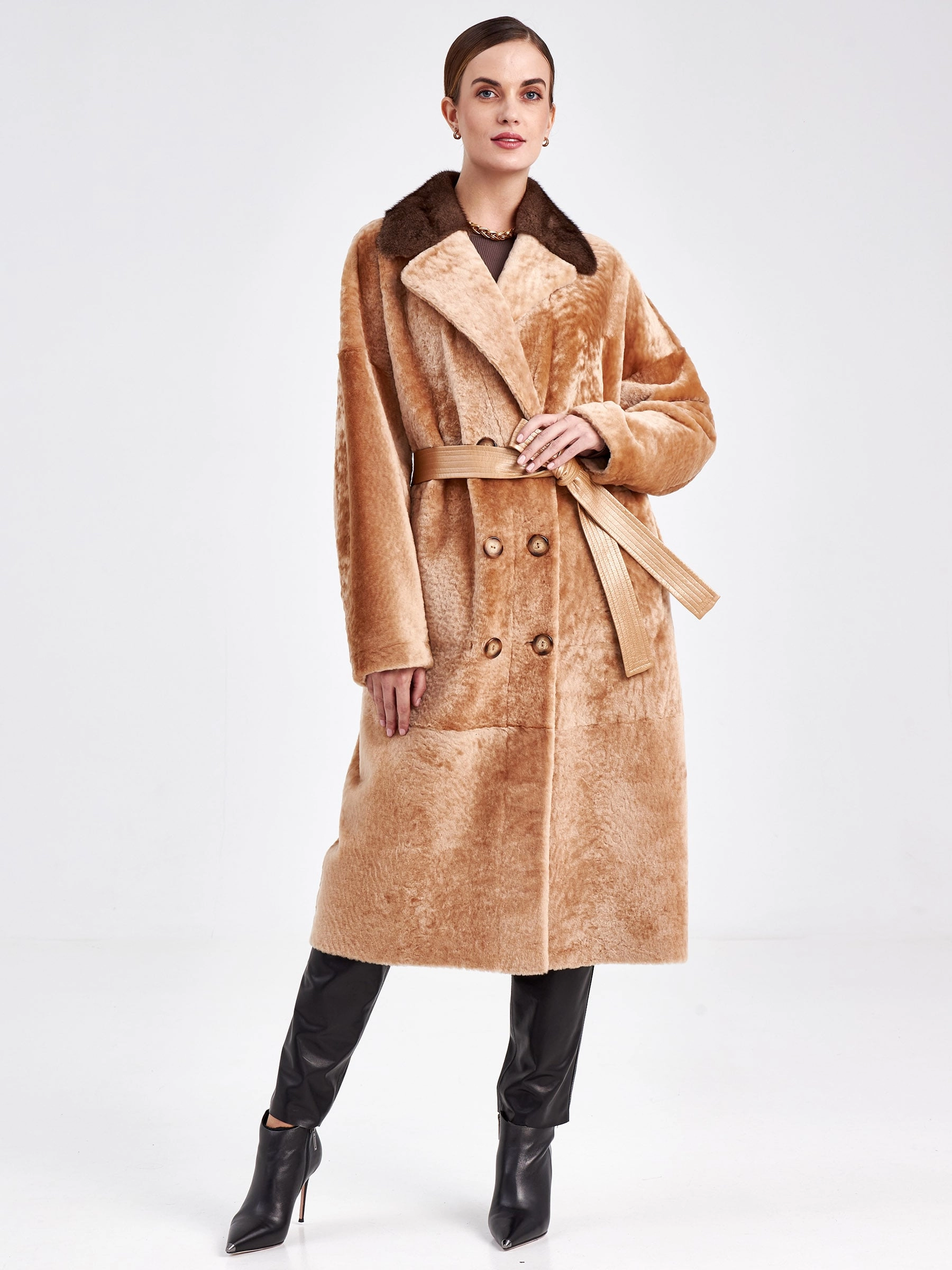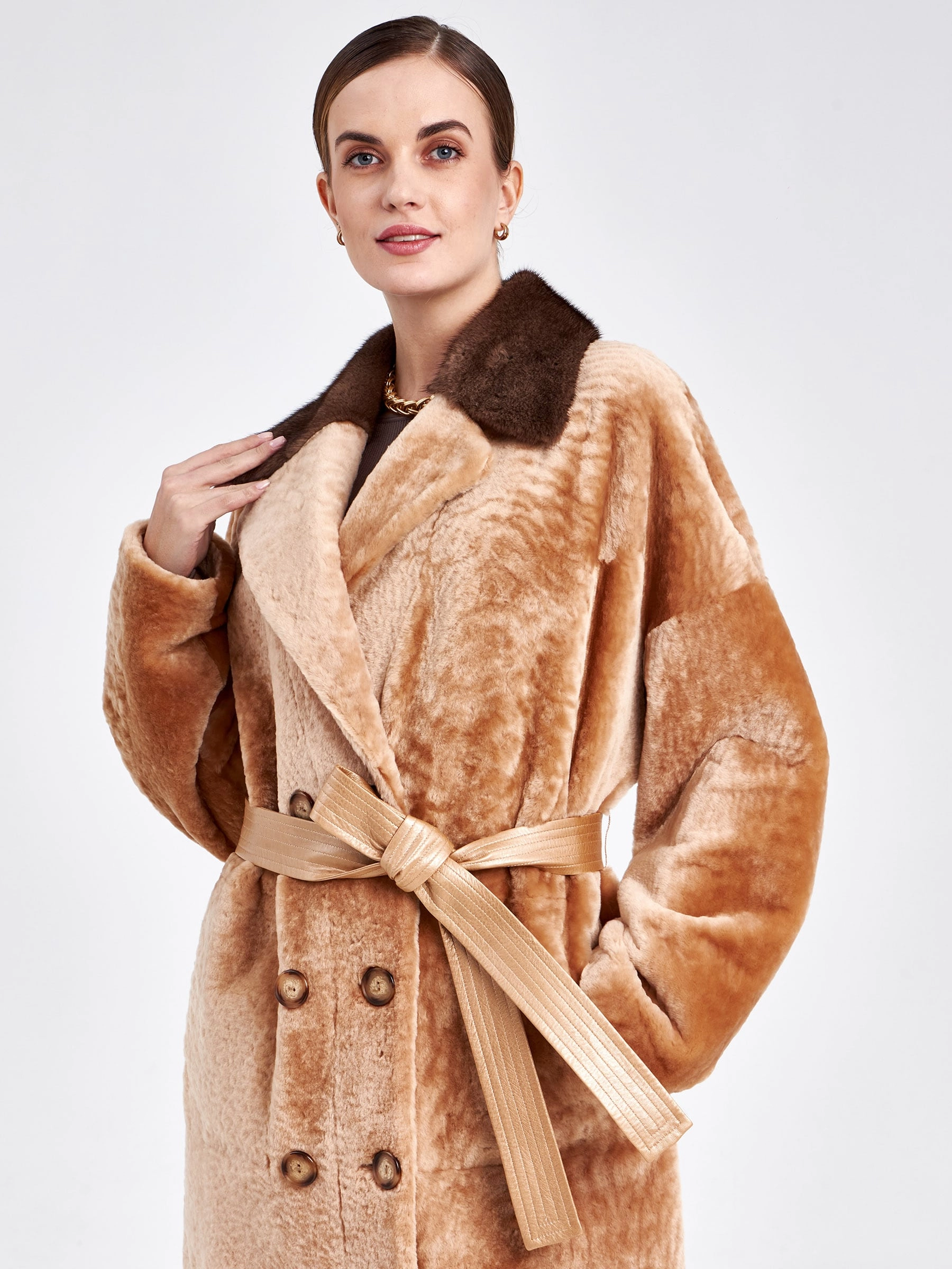 Двубортную модель с широкими лацканами прямого кроя выполнили из мягкой плотной овчины с гладкой фактурой в серебристом цвете с одной стороны и густым мехом хаки с другой. За счет материала и особенных швов изделие можно легко трансформировать в шубу. Застежка-пуговицы. Воротник из меха норки. Контрастный бежевый пояс из натуральной кожи послужил дополнением к изделию.