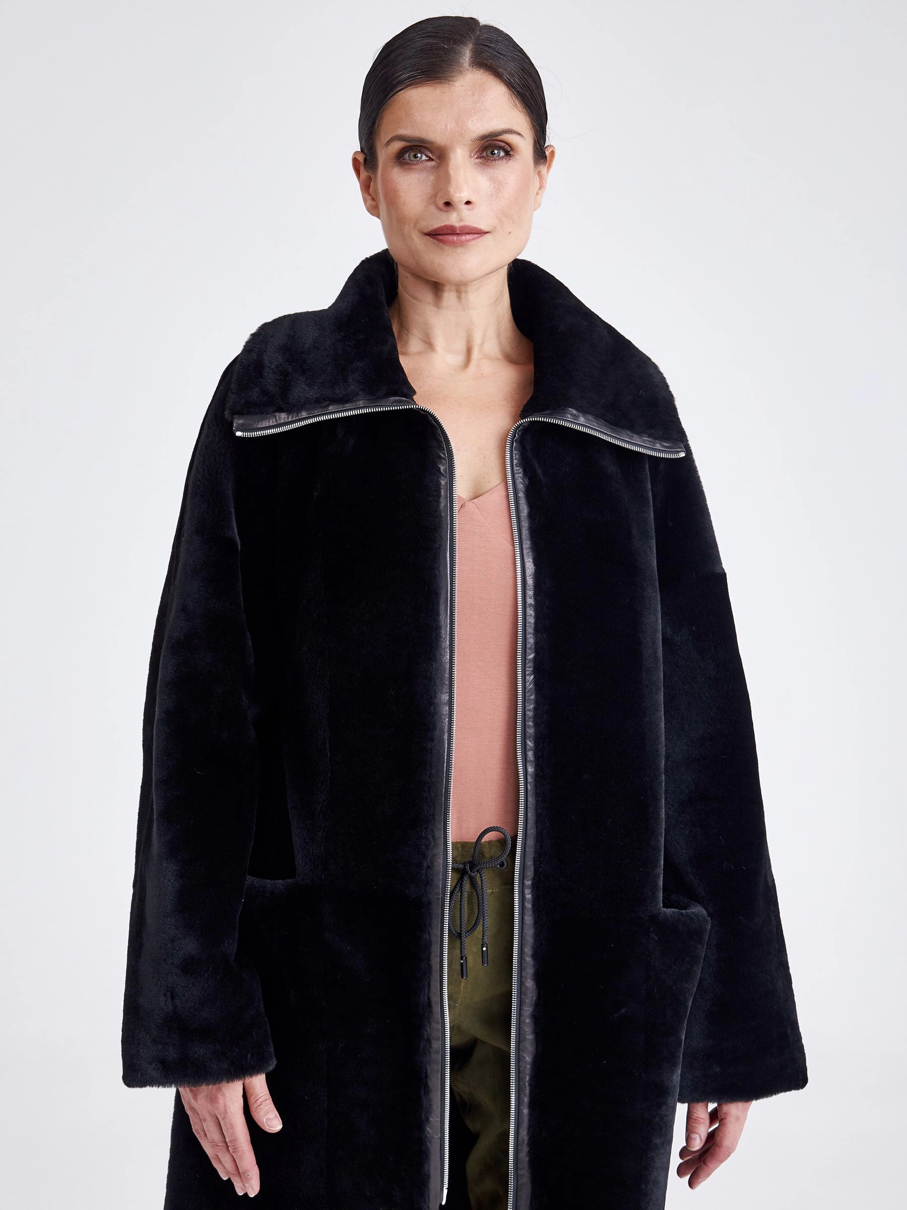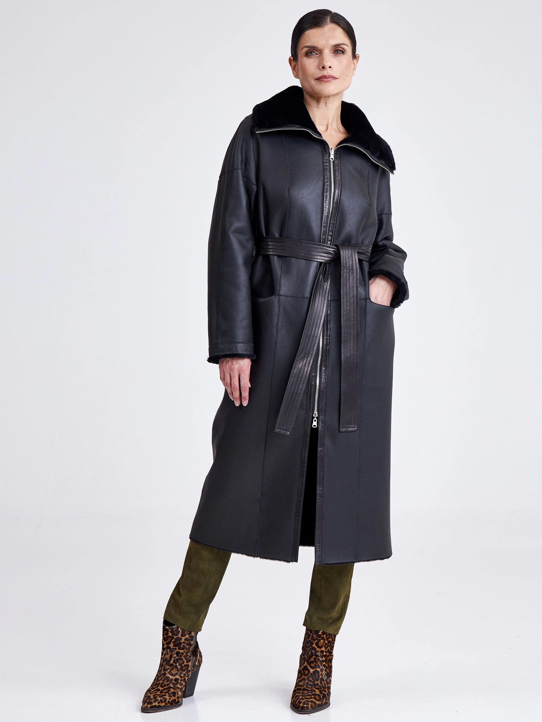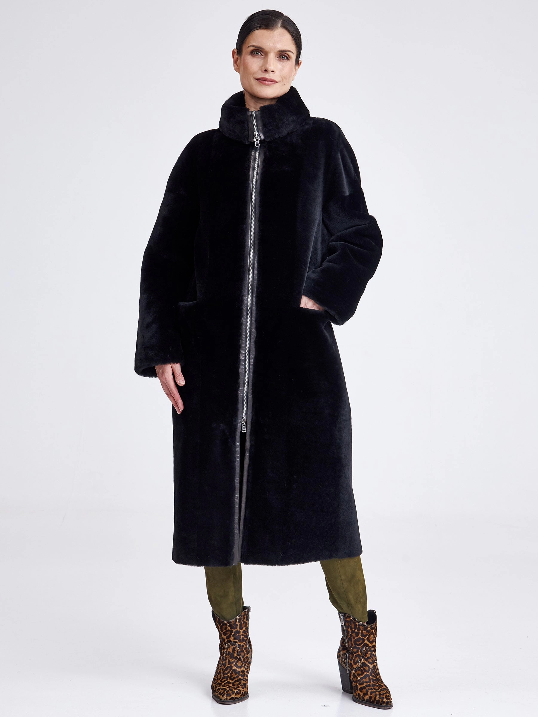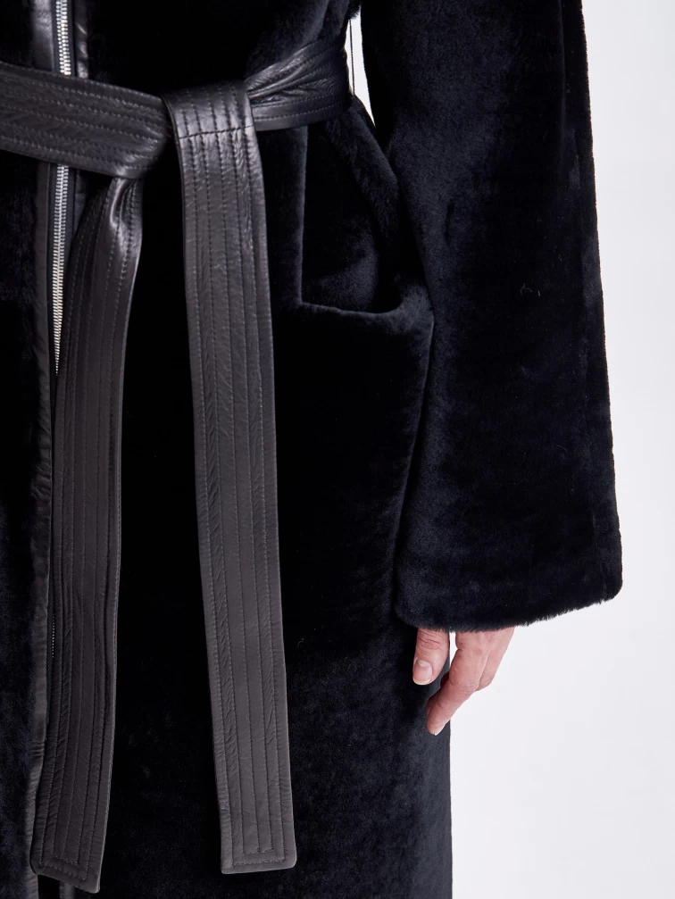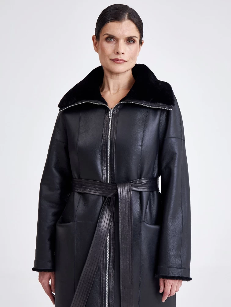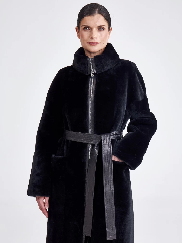 Для пошива двухсторонней модели, мастера выбрали мягкую плотную овчину.Внутренняя сторона хорошо сохраняет тепло,гладкая лицевая не боится мокрого снега и холодного ветра. Прямой силуэт-можно изменить с помощью широкого кожаного пояса.Застежка-молния двухзамковая. Высокий воротник -стойка легко трансформировается в отложной. Идеальная посадка по фигуре.