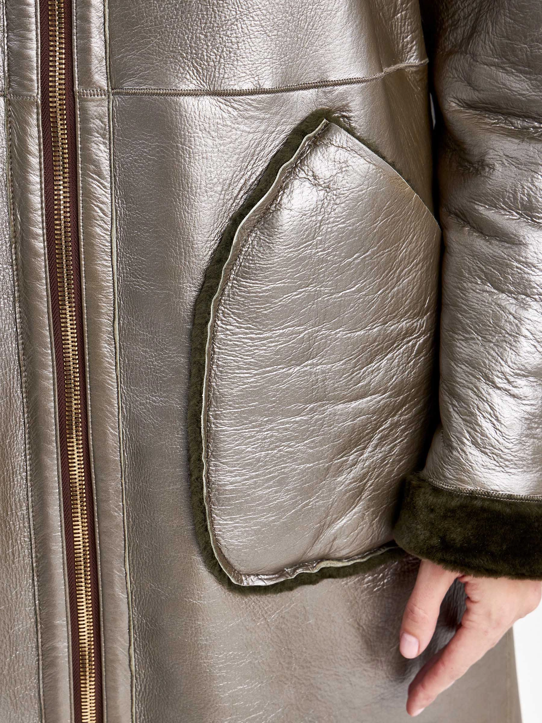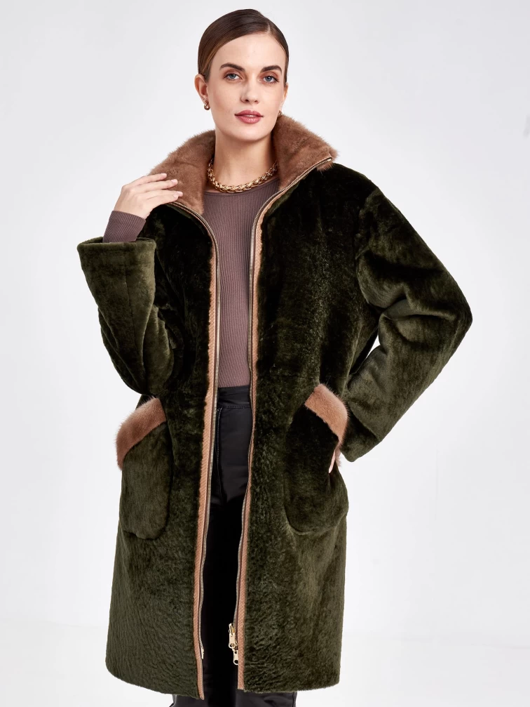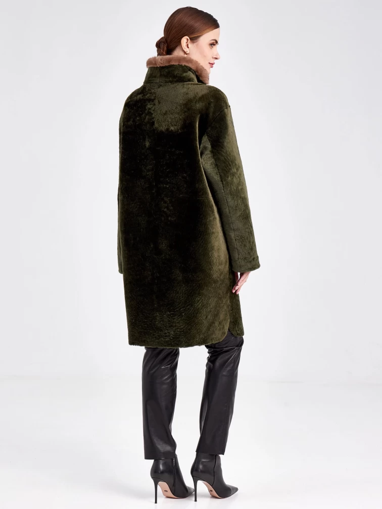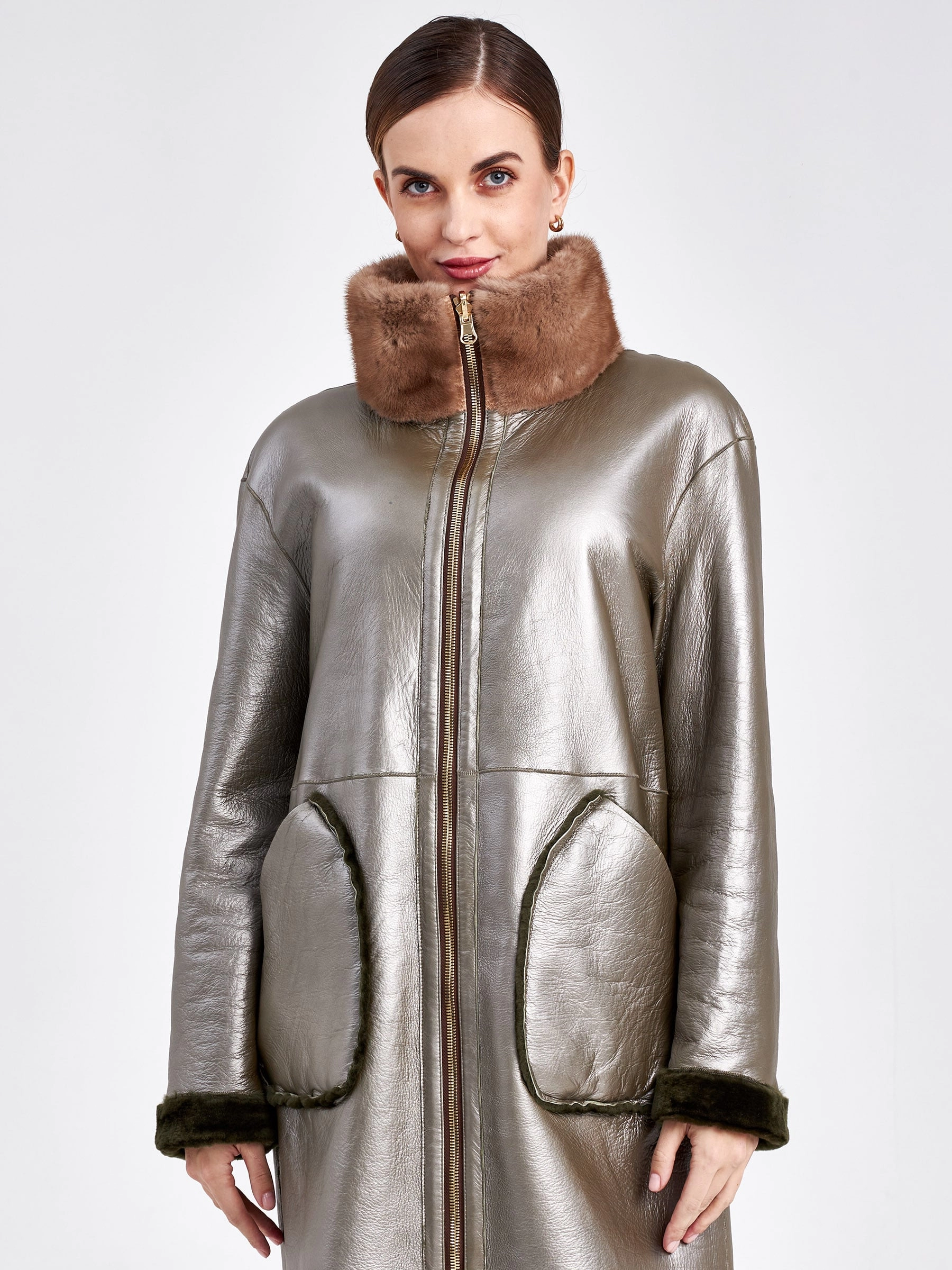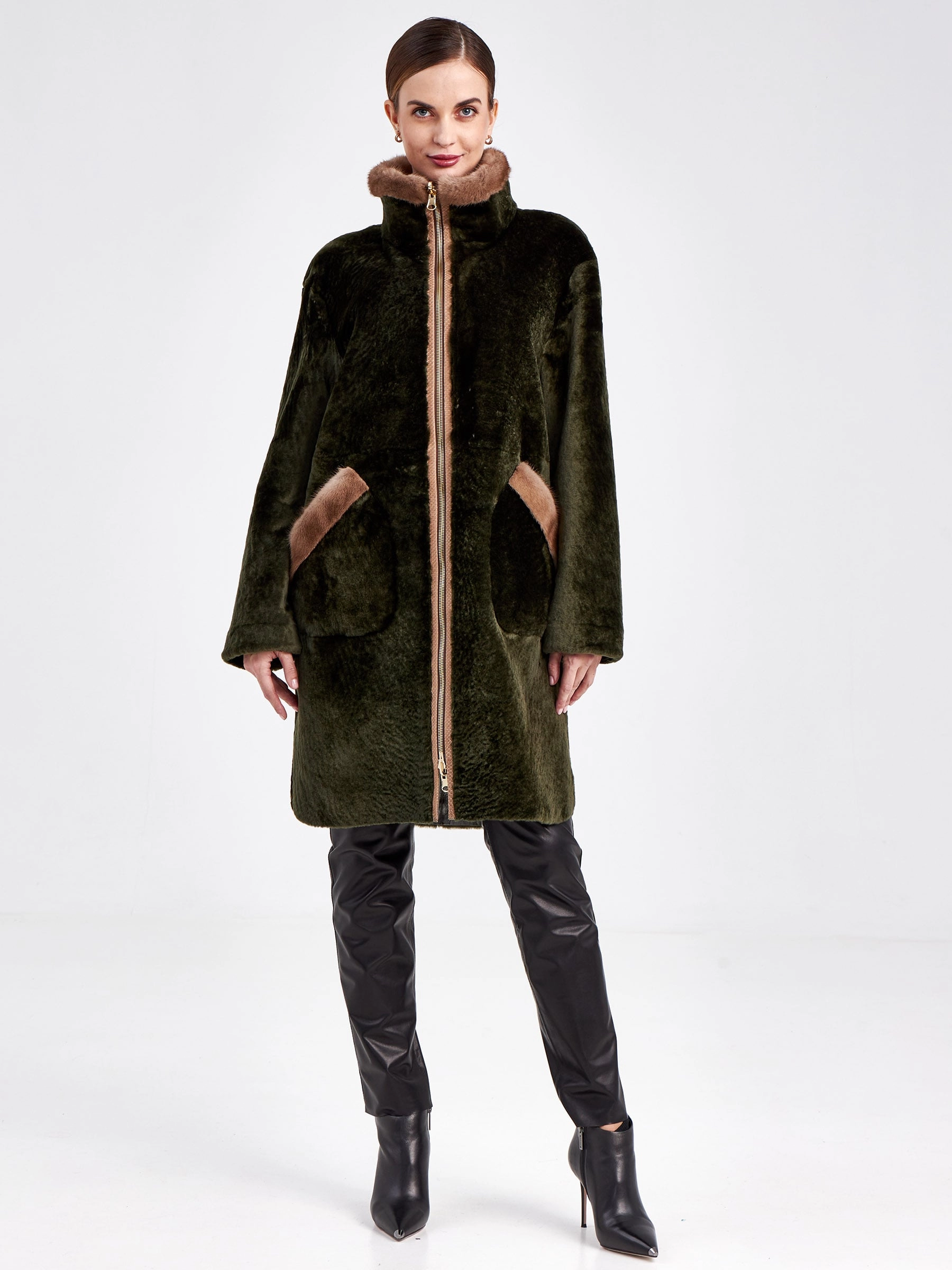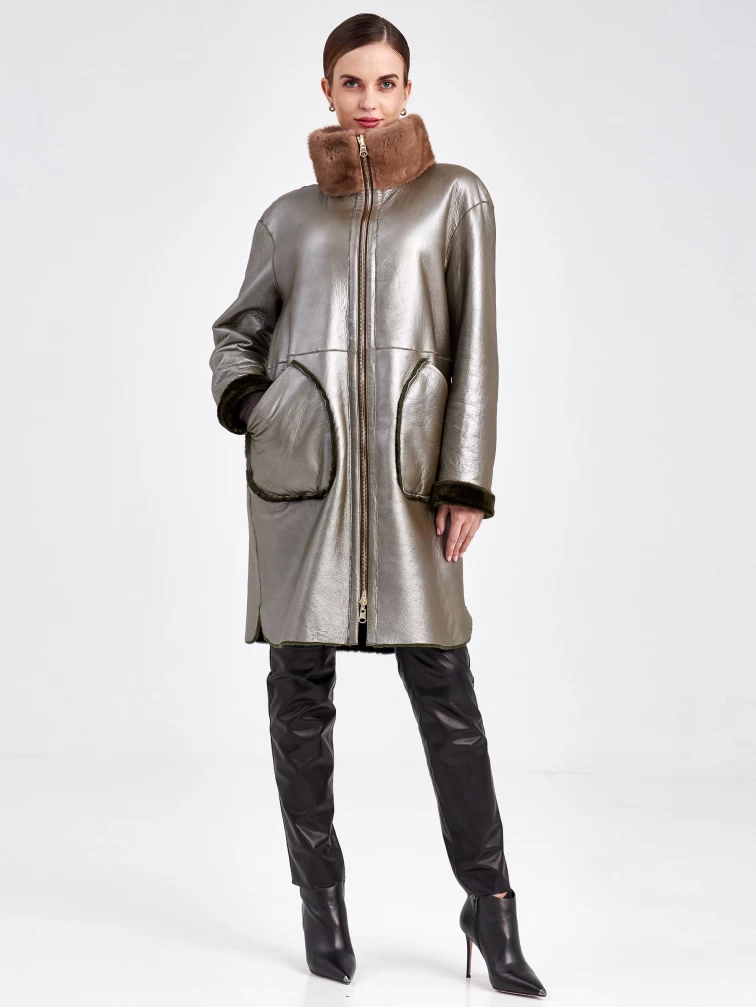 Товар женская двусторонняя дубленка из астрагана с мехом норки премиум класса 2018, хаки, размер 50, артикул 62771 выполнен из овчина "мерино" с застежкой молния. Рассчитан на сезон: осень-зима. Длина изделия свыше 90 см, силуэт прямой.