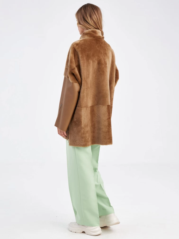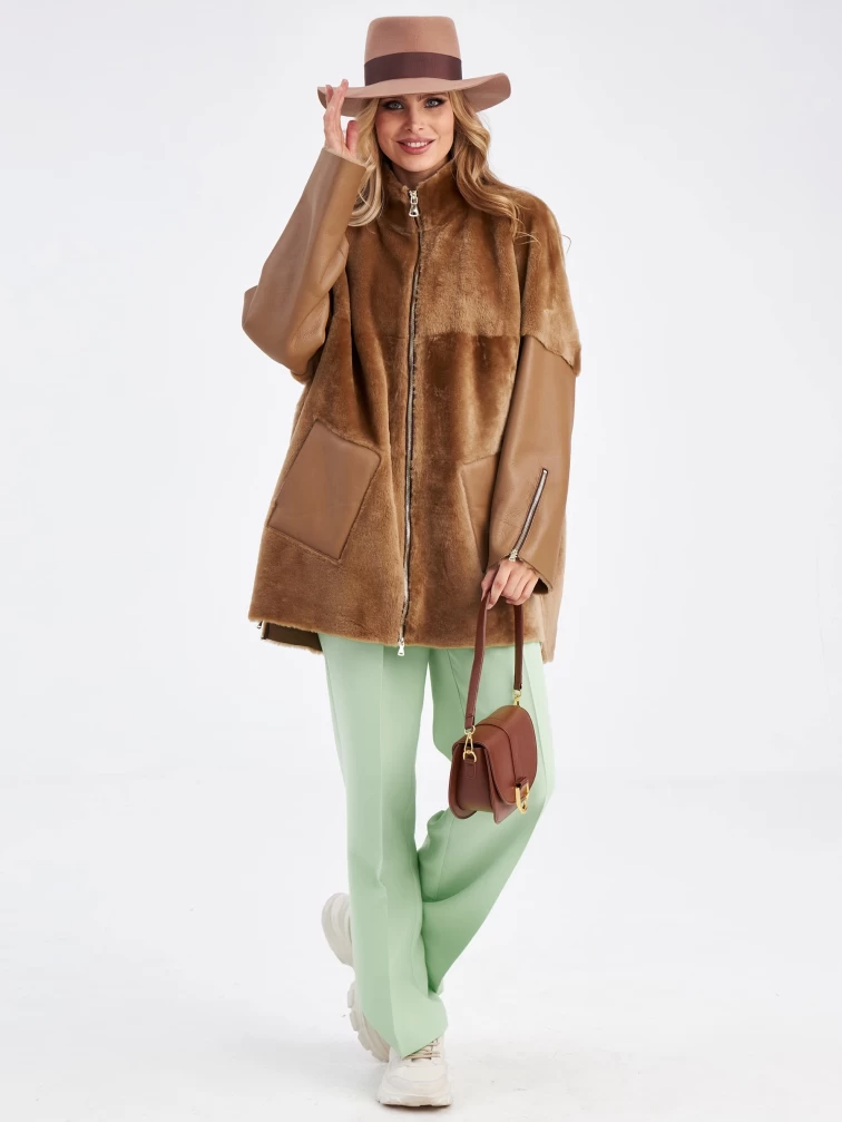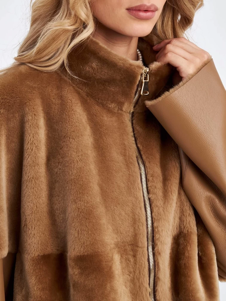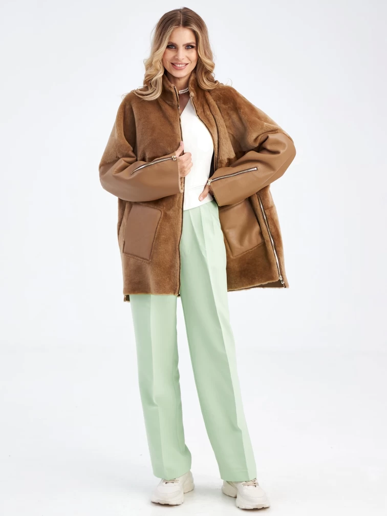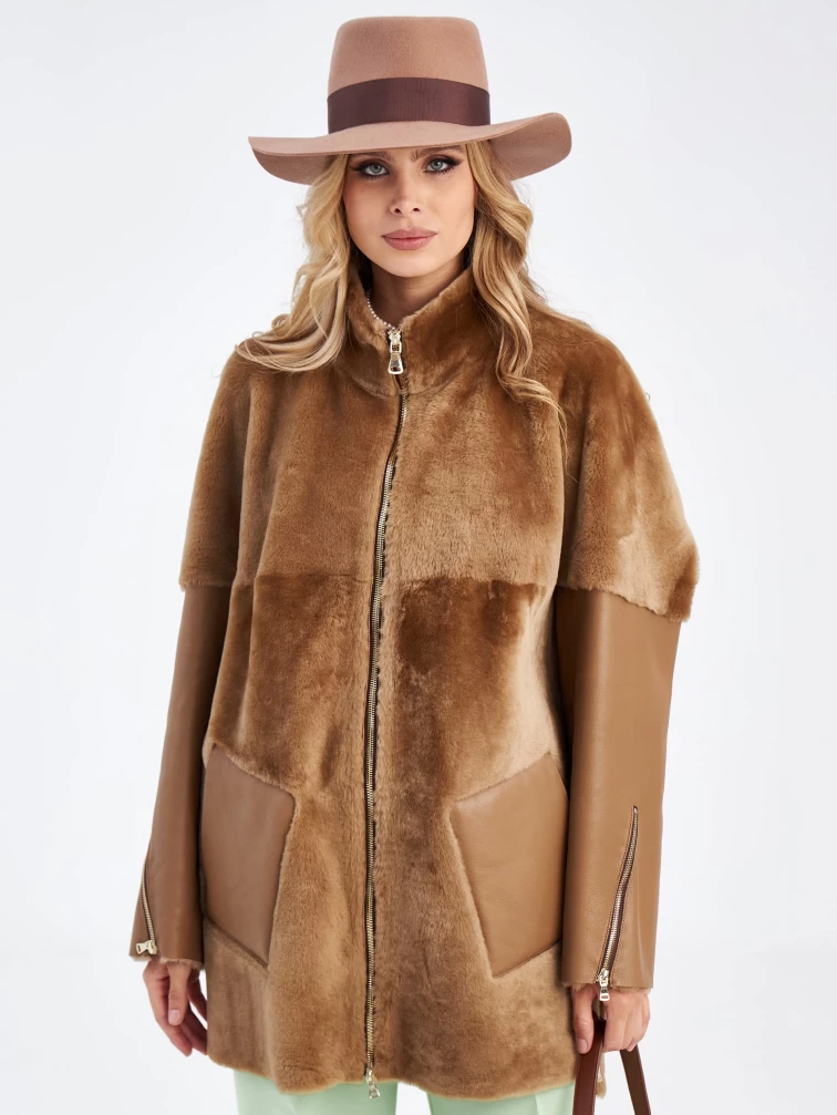Для пошива дубленки использовали мягкую тонкую овчину в комбинации с гладкой кожаной фактурой. На ощупь материала она получилась легкой и теплой. Два боковых разреза, как и само изделие застегиваются крупными молниями в цвете золото.