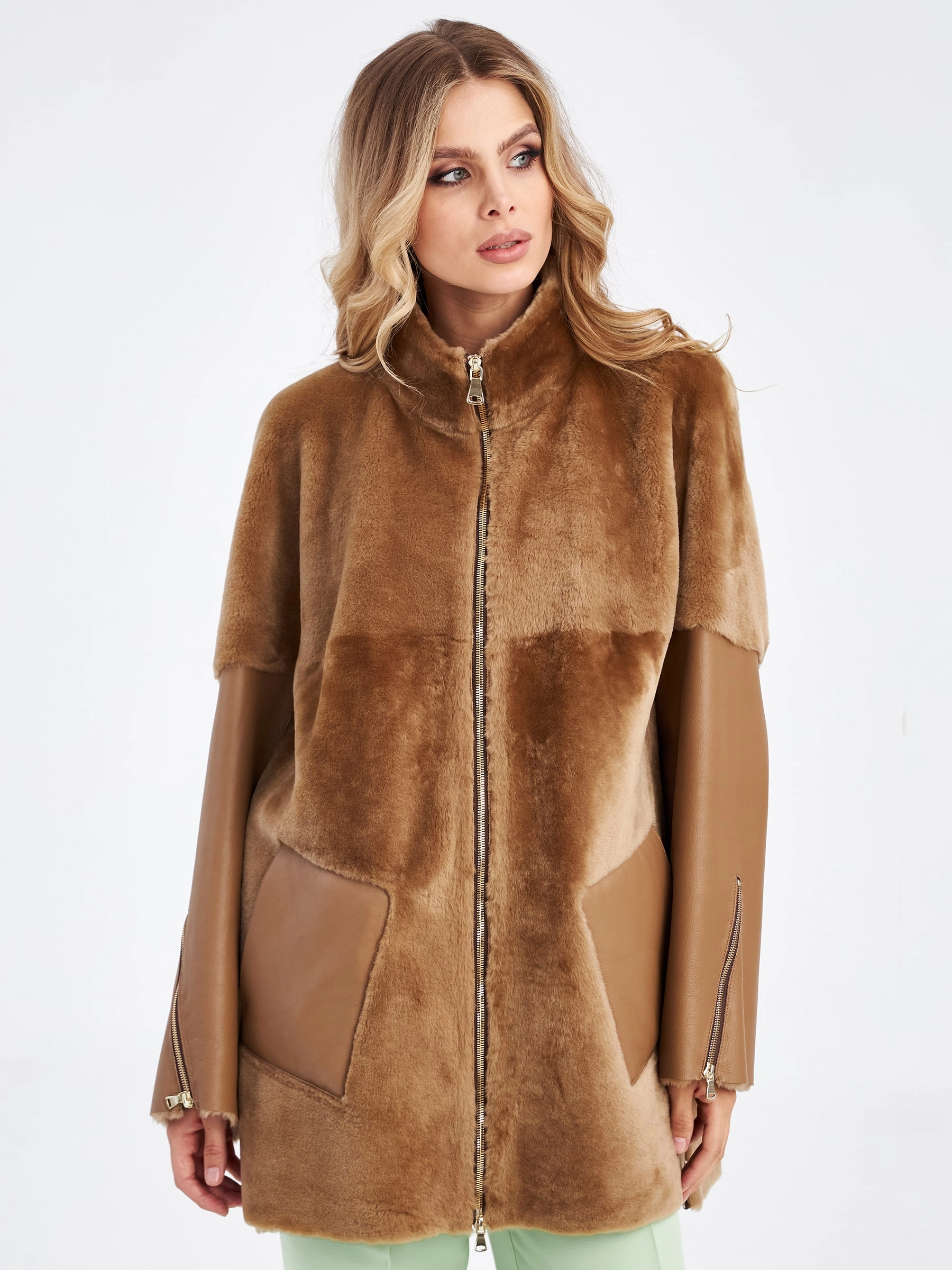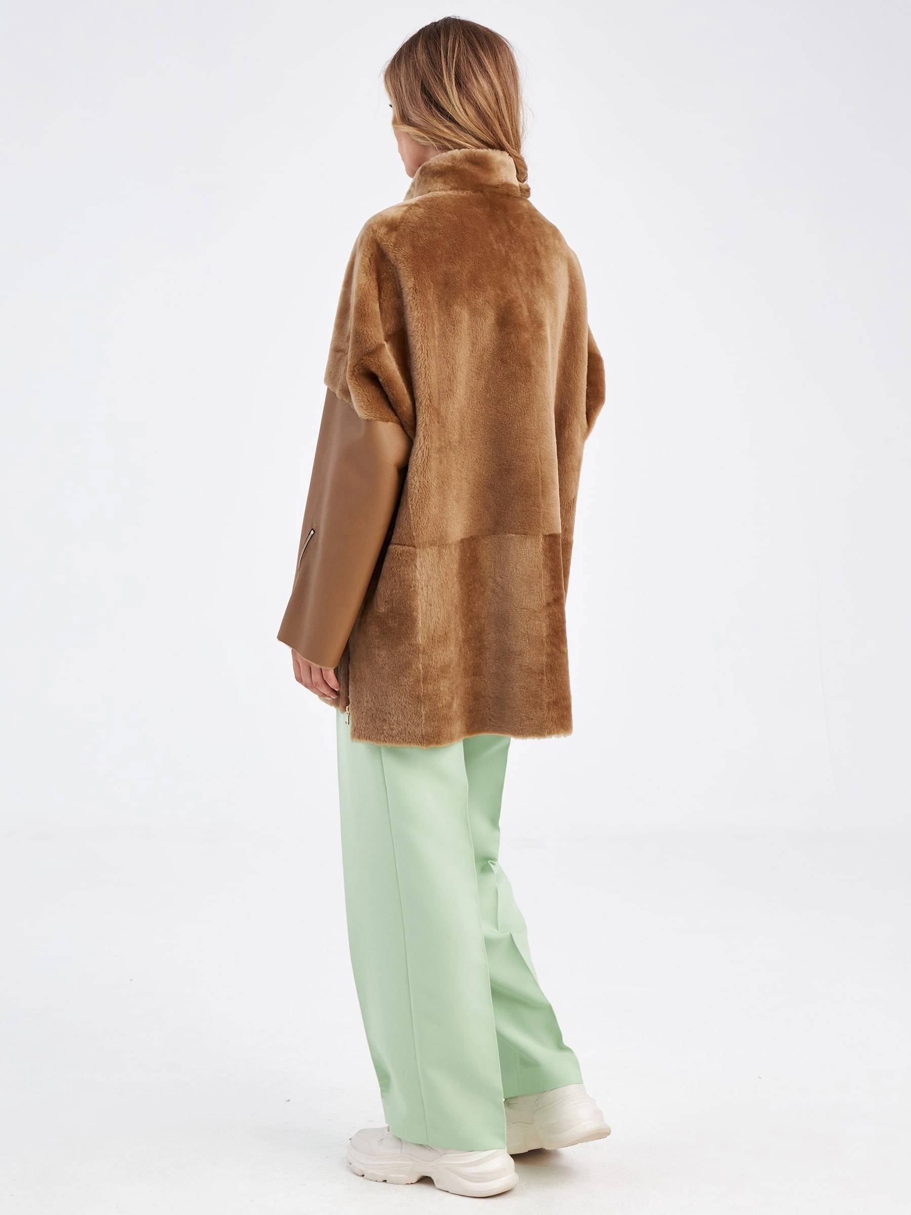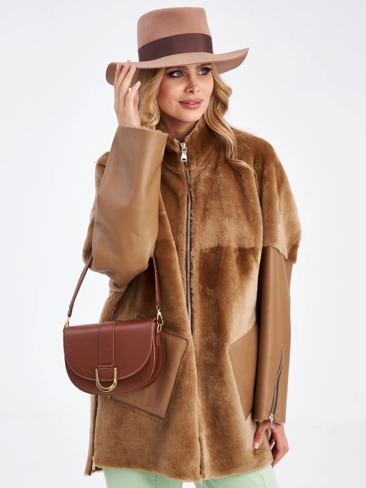 Для пошива дубленки использовали мягкую тонкую овчину в комбинации с гладкой кожаной фактурой. На ощупь материала она получилась легкой и теплой. Два боковых разреза, как и само изделие застегиваются крупными молниями в цвете золото.