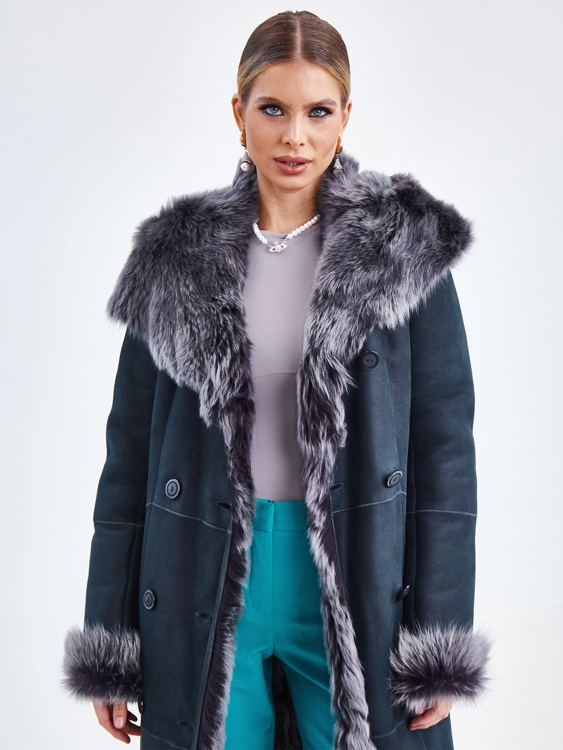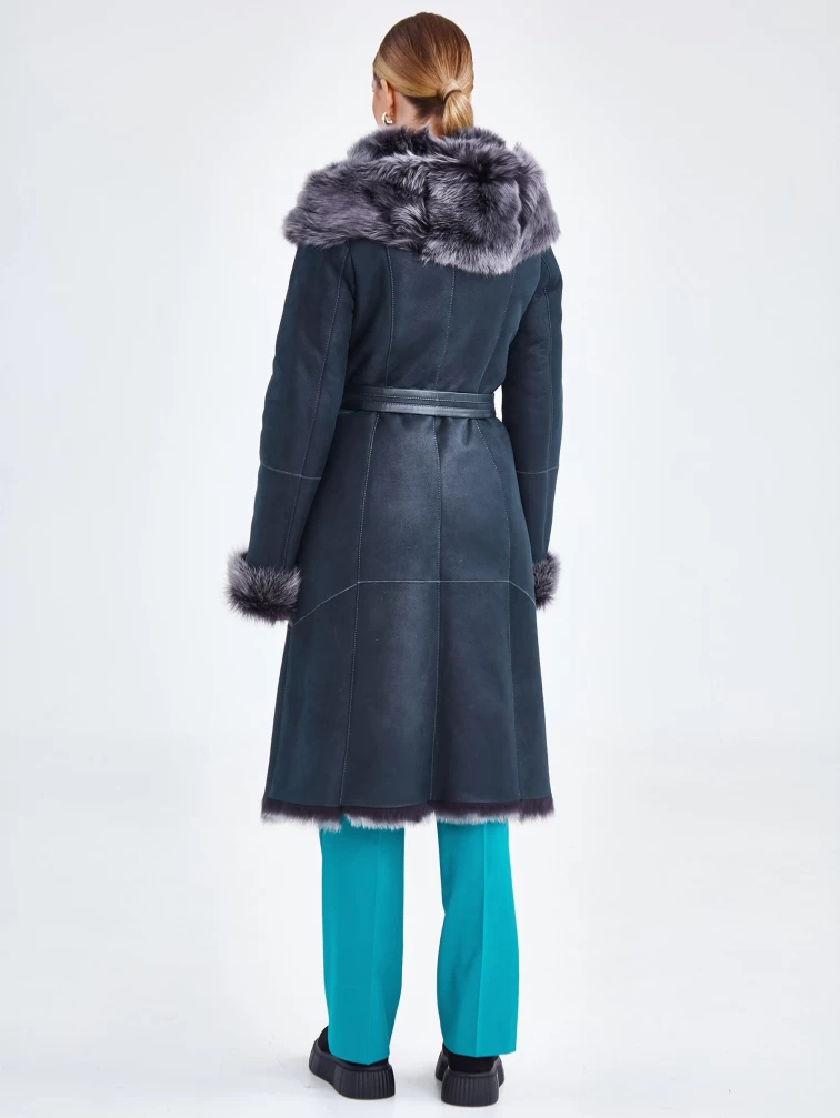 Товар двубортная женская дубленка из тосканы с капюшоном премиум класса 134, синяя, размер 44, артикул 62851 выполнен из овчина "тоскана" с застежкой пуговицы. Рассчитан на сезон: осень-зима. Длина изделия 110 см, силуэт полуприлегающий.