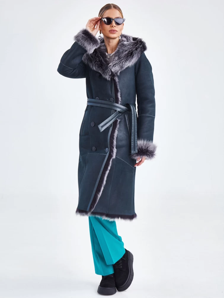 Двубортная женская дубленка из тосканы с капюшоном премиум класса 134, синяя, размер 44, артикул 62851