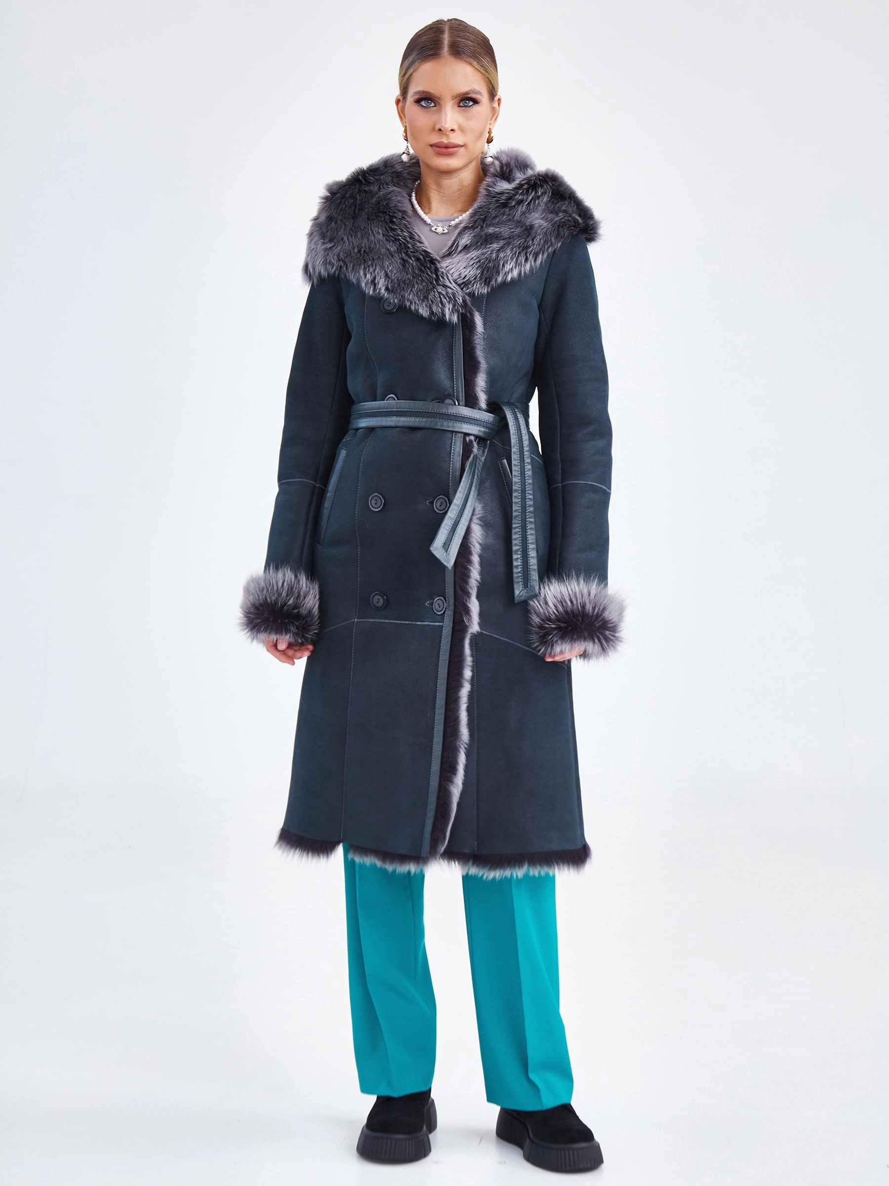 Теплая двубортная дубленка из нежнейшей тосканской овчины. Полуприлегающий силуэт классической длины. Объемный капюшон защитит от капризной погоды, а длинный пояс-лента элегантно подчеркнет талию.