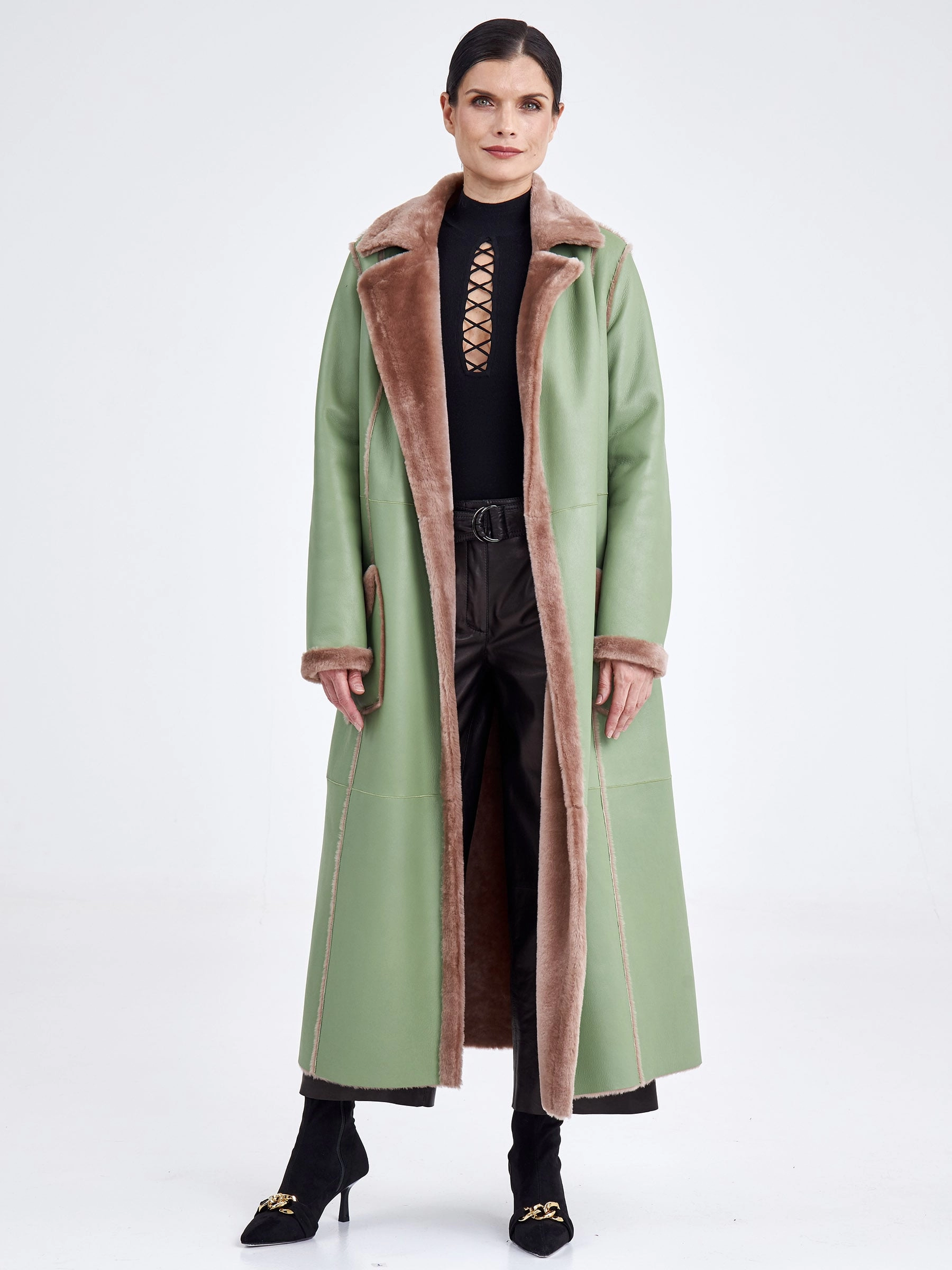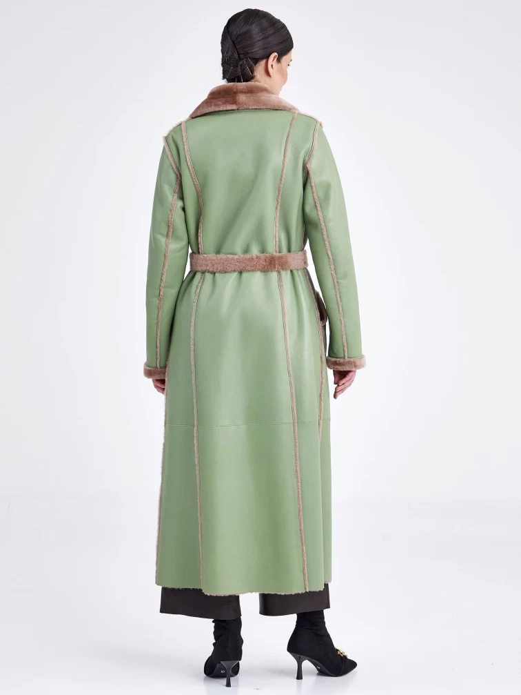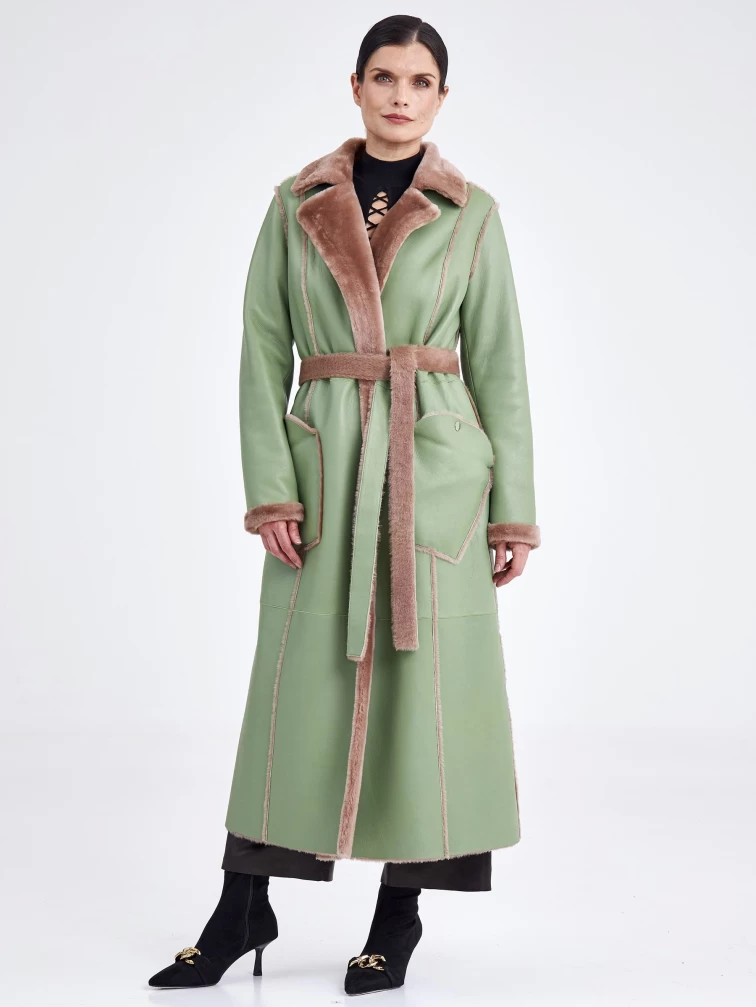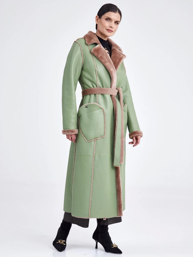 Стиль и комфорт читается буквально в каждом движении этой дубленки. Создавая модель, мастера использовали два цвета: внутренняя -мягкая и нежная овчина в бежевом оттенке, лицевая- в оливковым. Благодаря бережной выделки изделие получилось легким и теплым. В этой модели есть свой секрет: она не имеет абсолютно никаких застежок-просто запах и длинный пояс. Полуприлегающий силуэт, английский воротник и пара карманов с меховым отворотом застегивающихся на кнопки.