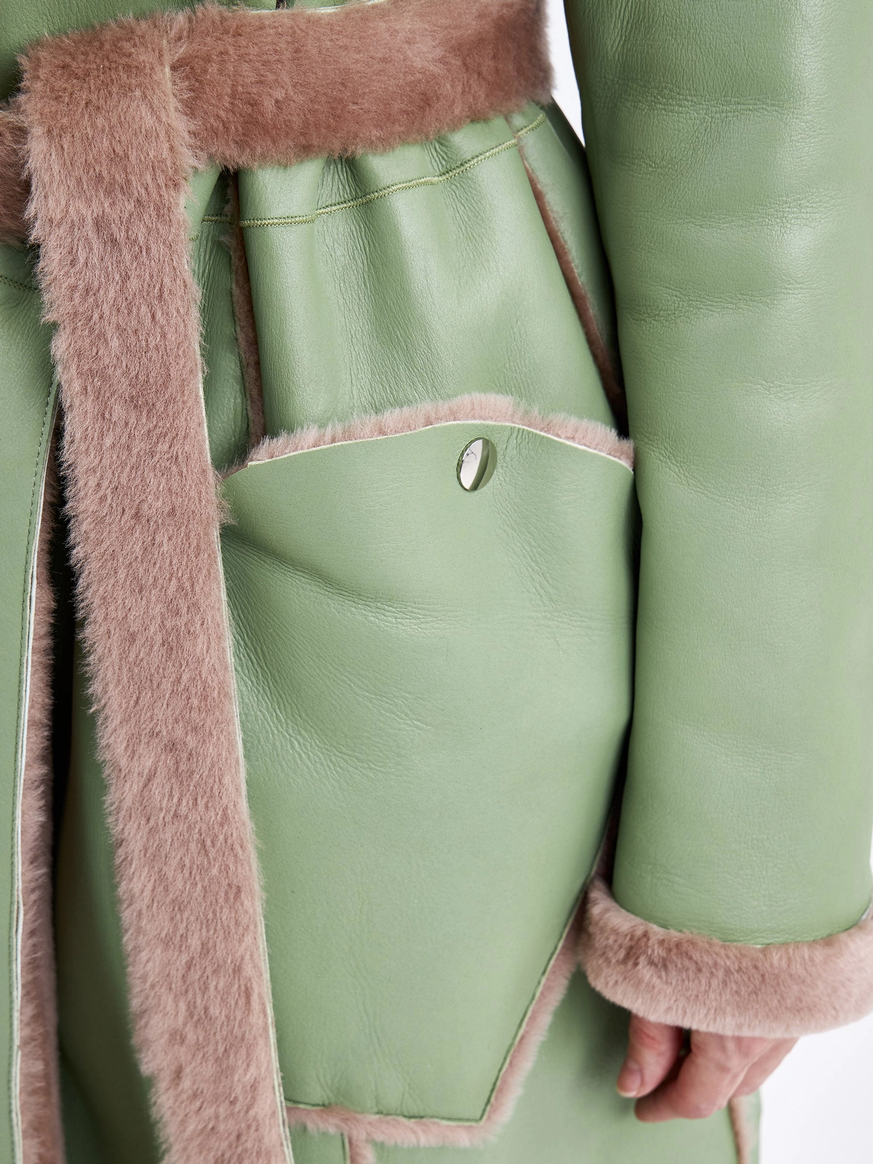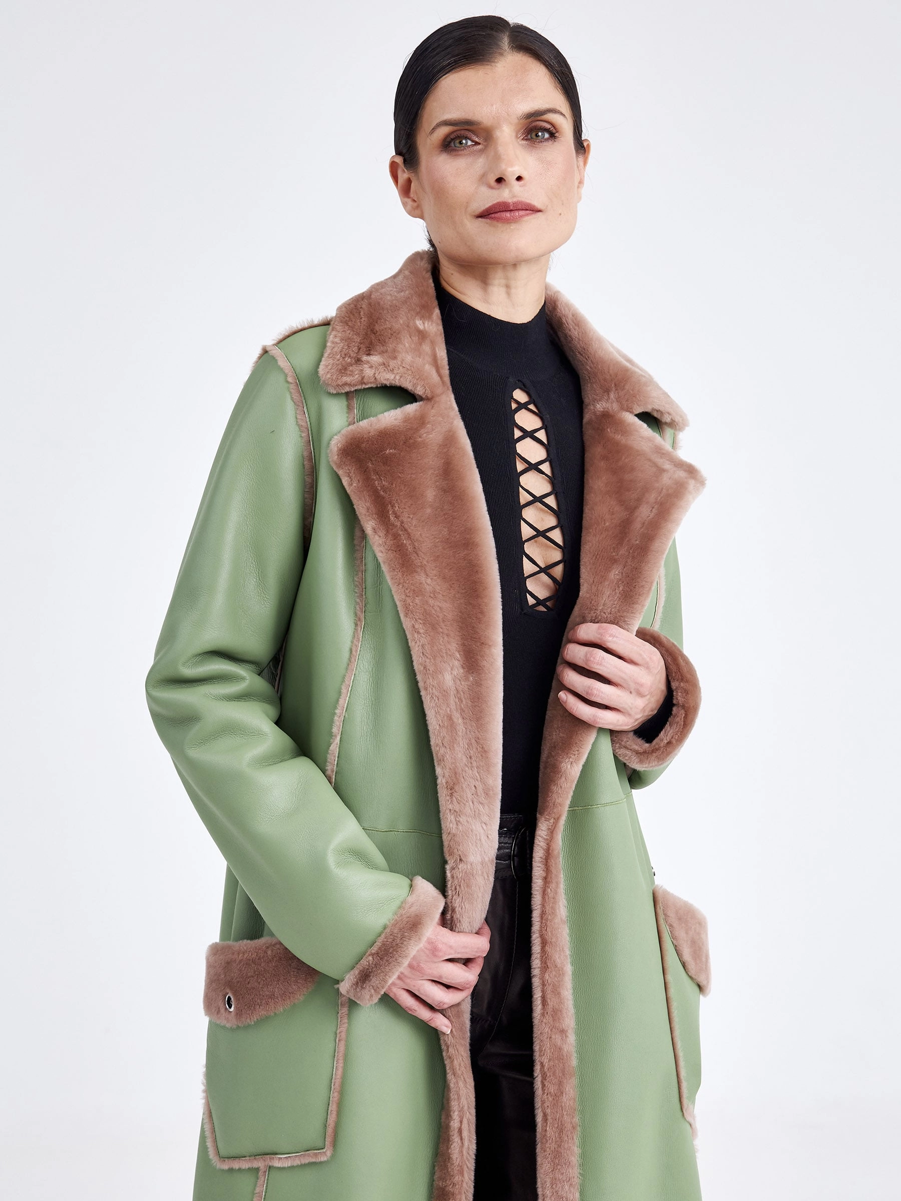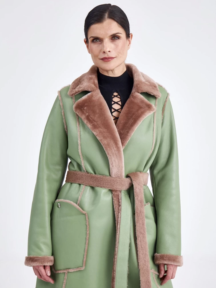 Стиль и комфорт читается буквально в каждом движении этой дубленки. Создавая модель, мастера использовали два цвета: внутренняя -мягкая и нежная овчина в бежевом оттенке, лицевая- в оливковым. Благодаря бережной выделки изделие получилось легким и теплым. В этой модели есть свой секрет: она не имеет абсолютно никаких застежок-просто запах и длинный пояс. Полуприлегающий силуэт, английский воротник и пара карманов с меховым отворотом застегивающихся на кнопки.