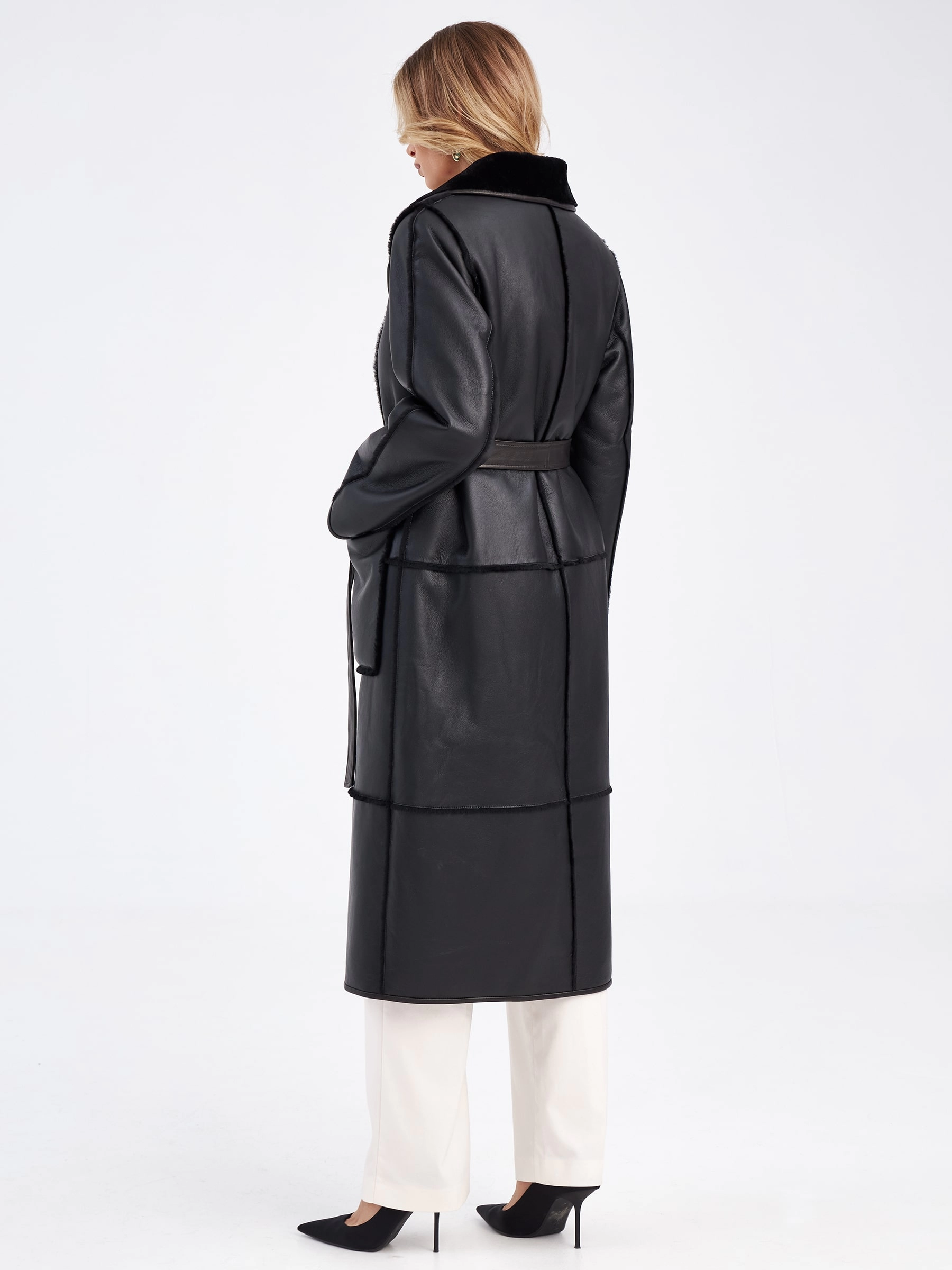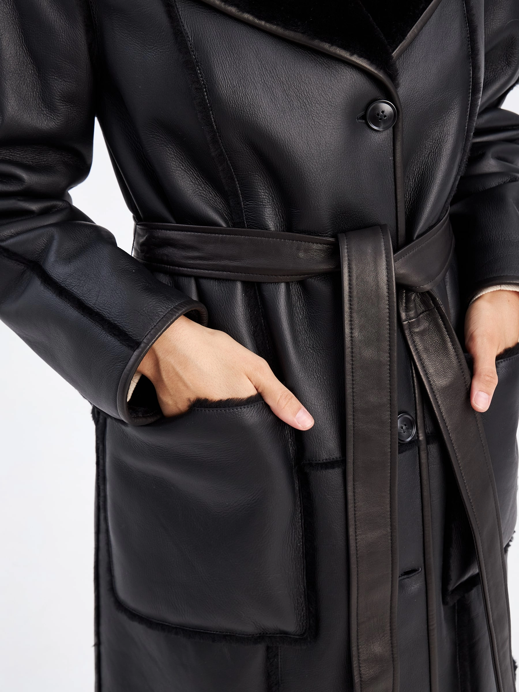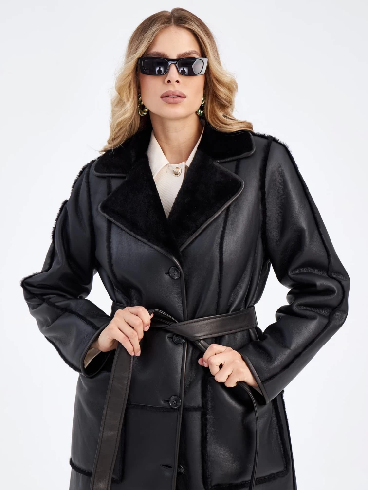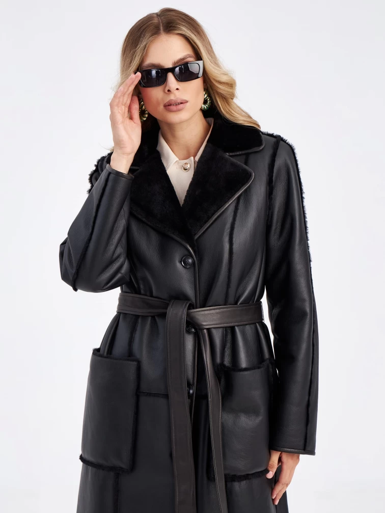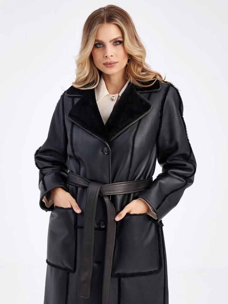 Очень лаконичная и выдержанная модель.Изделие с вывернутыми наружу швами выполнили из бережно выделанной овчины в черном цвете. Дубленка получилась максимально теплой, но при этом легкой и комфортной. Прямой крой, английский воротник, идеальная посадка по фигуре. Отсутствие декора, позволяет делать модель универсальной и всегда востребованной.Силуэт модели можно легко изменить при помощи длинного кожаного пояса.