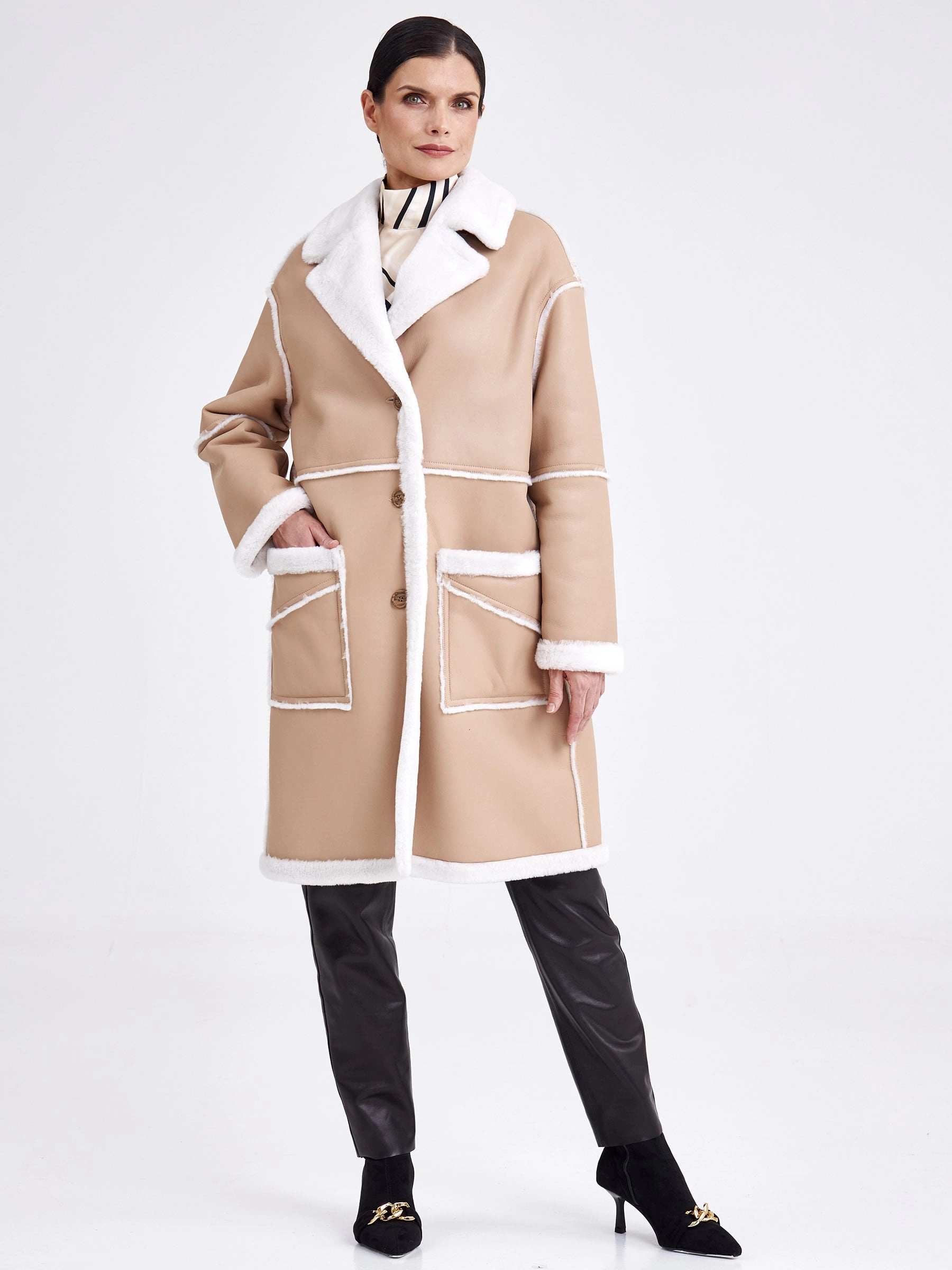 Товар удлиненная женская дубленка оверсайз премиум класса 2014, бежевая, размер 44, артикул 62710 выполнен из овчина "мерино" с застежкой пуговицы. Рассчитан на сезон: осень-зима. Длина изделия свыше 90 см, силуэт прямой.