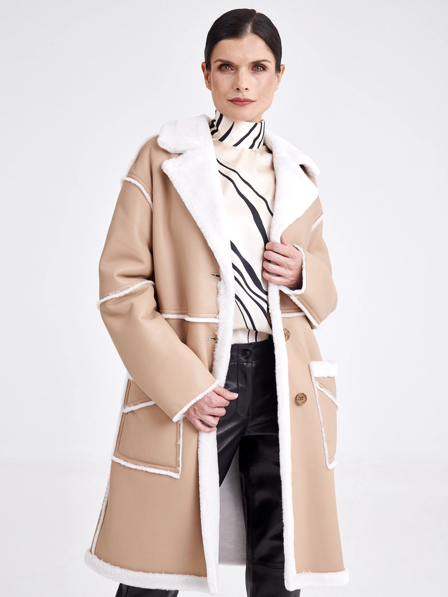 Удлиненная женская дубленка оверсайз премиум класса 2014, бежевая, размер 44, артикул 62710