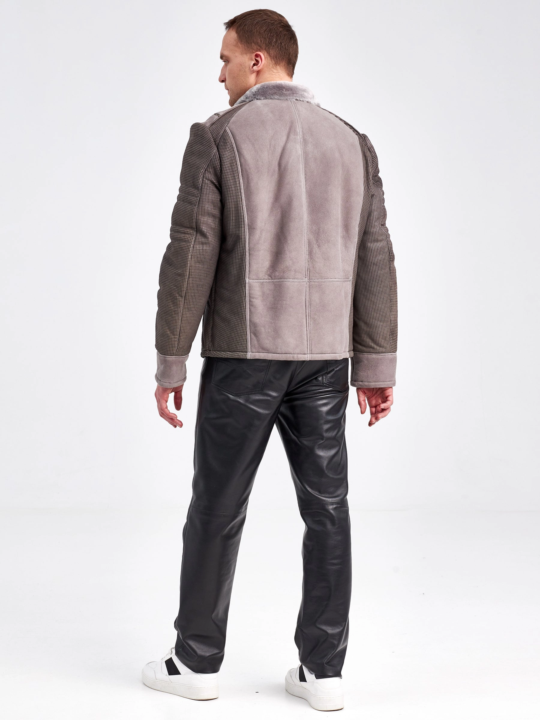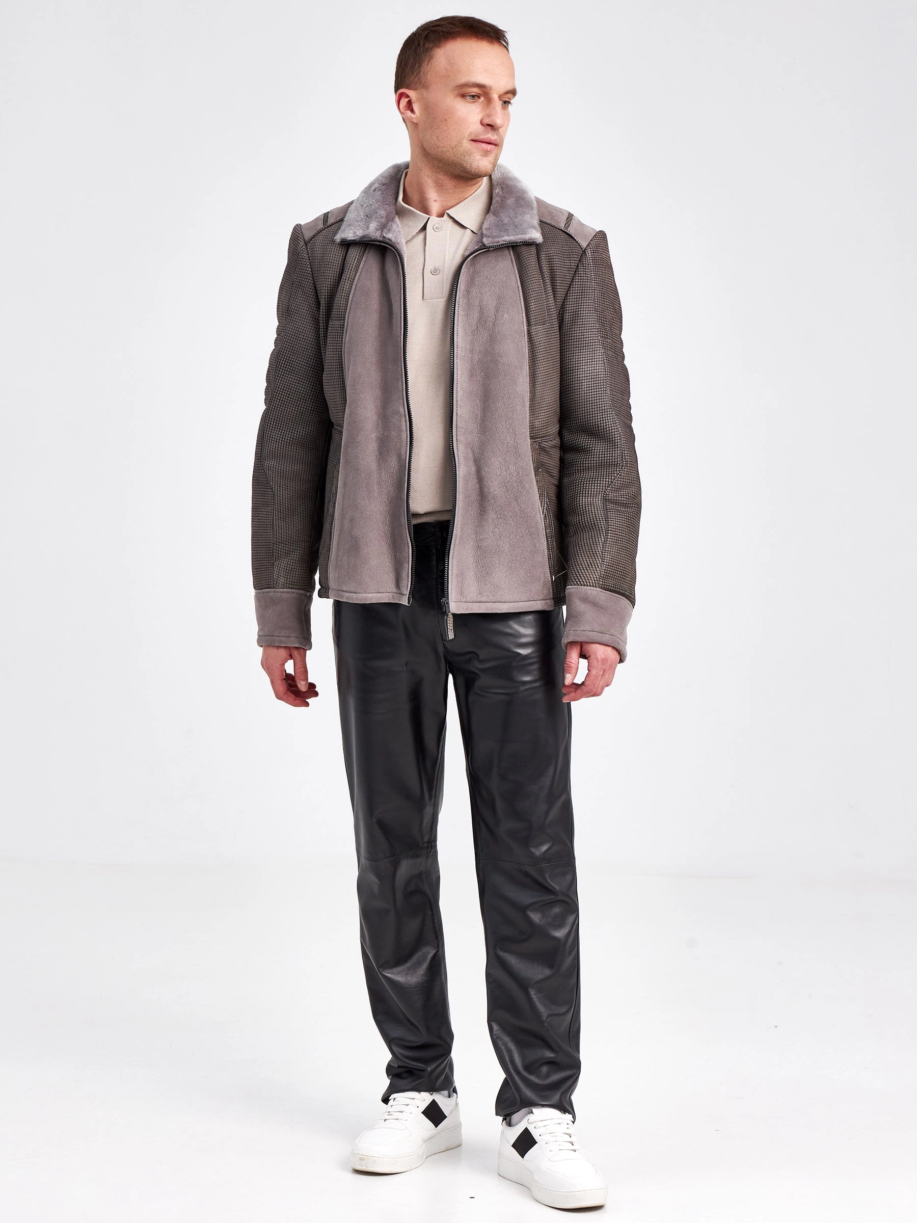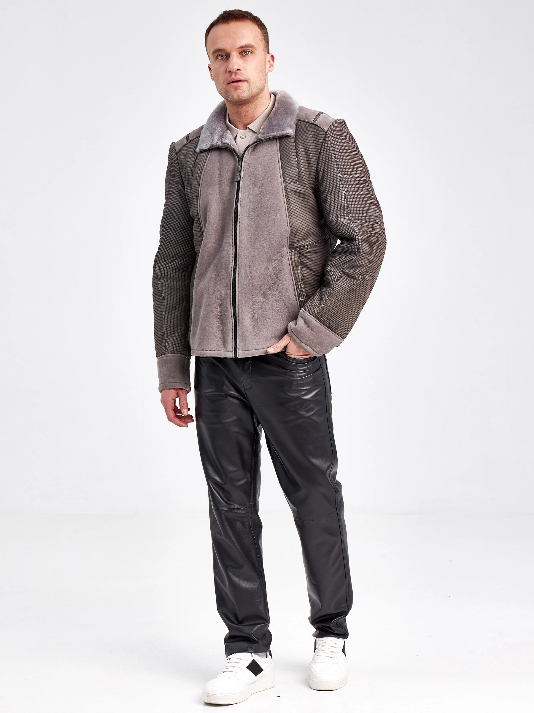 Комбинированная короткая мужская дубленка 40072, серая, короткая, размер 50, артикул 71240