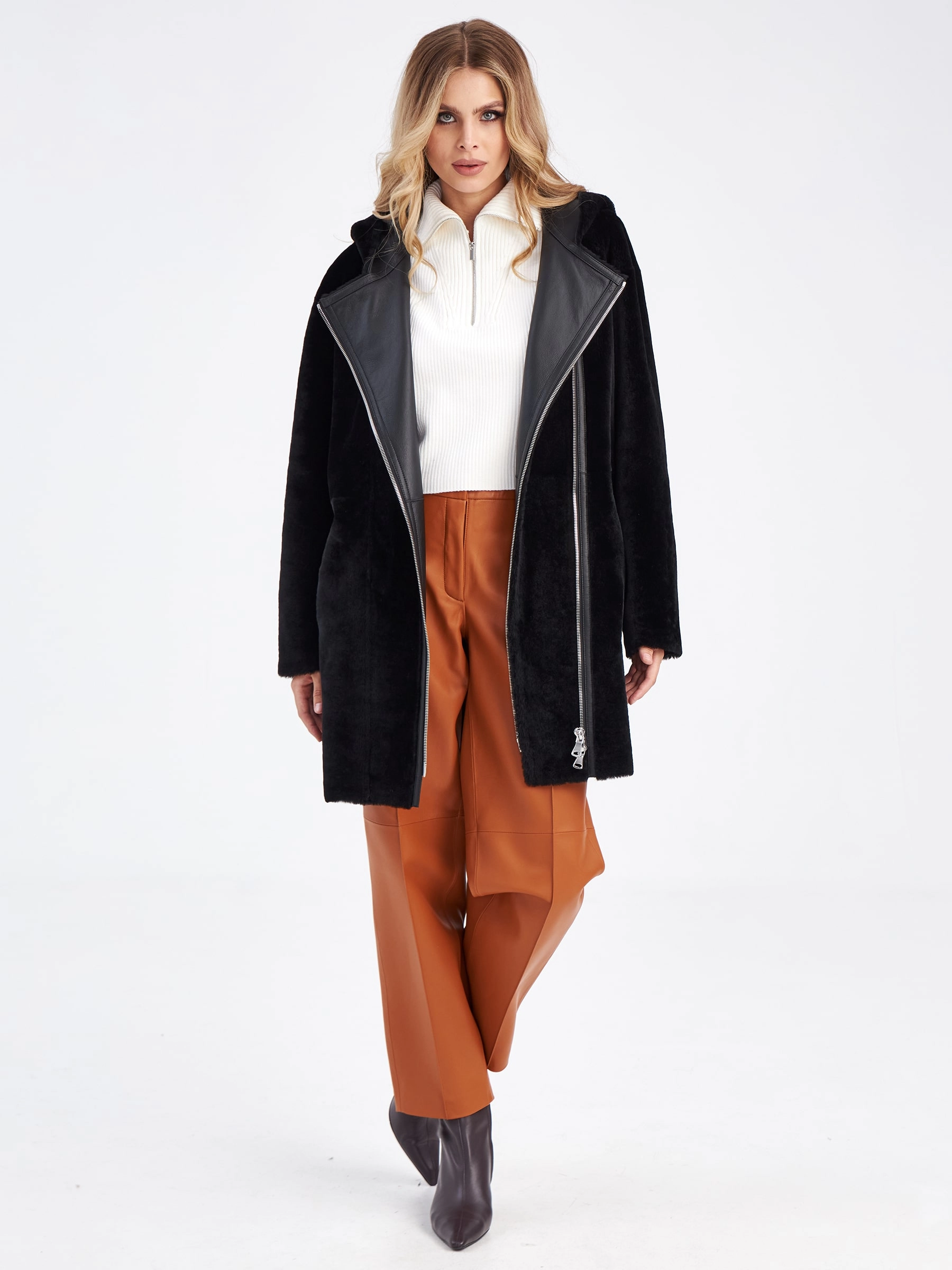 Товар женская двусторонняя дубленка косуха с капюшоном премиум класса 2012н, черная, размер 44, артикул 63200 выполнен из овчина "мерино" с застежкой молния. Рассчитан на сезон: осень-зима. Длина изделия 75-90 см, силуэт прямой.