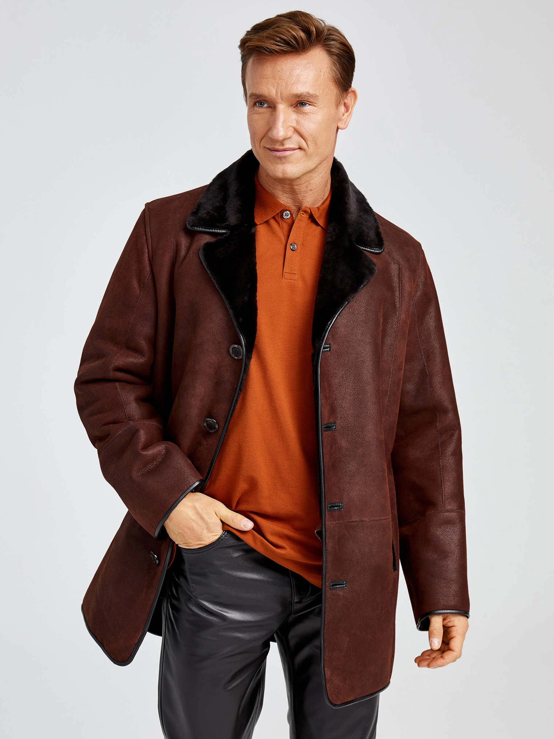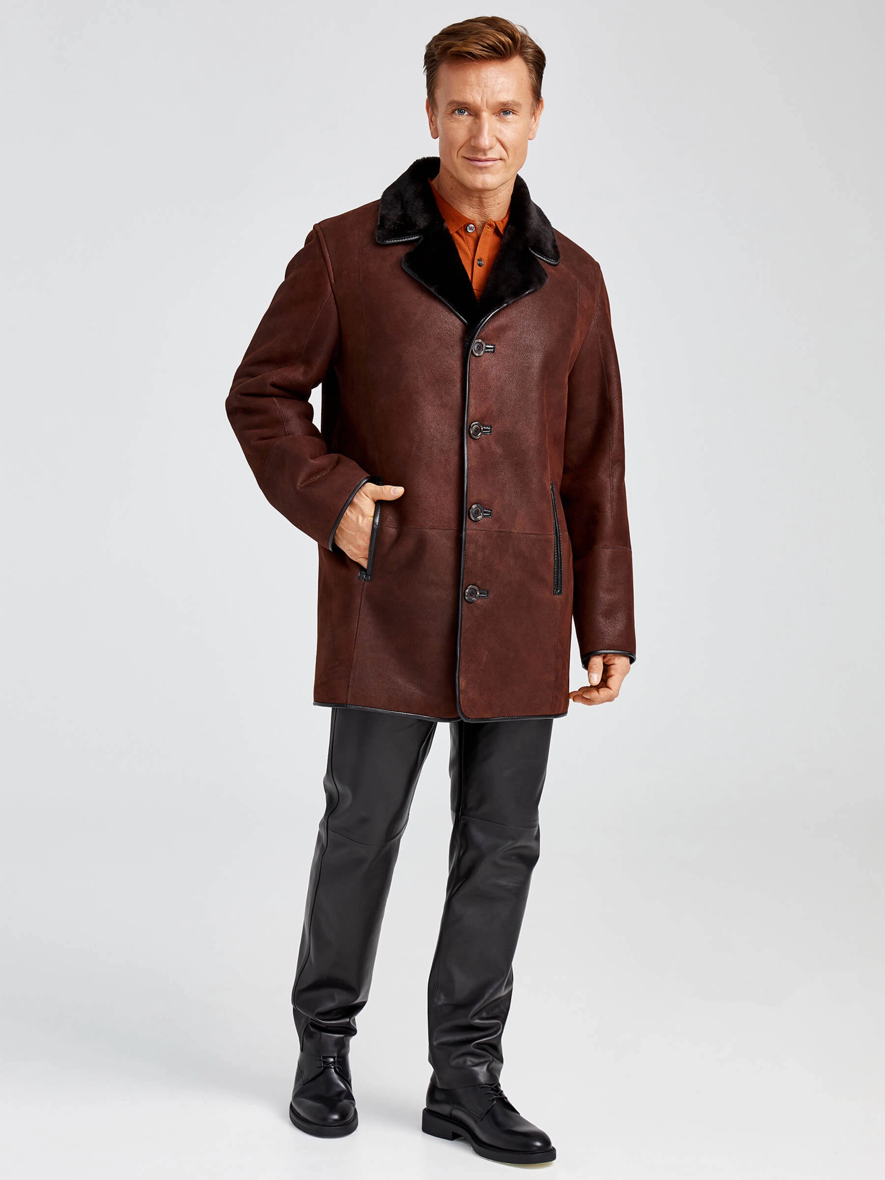 Товар зимний комплект мужской: дубленка 135 + брюки 01, виски/черный, р. 48, артикул 140460 выполнен из овчина "мерино". Рассчитан на сезон: зима.