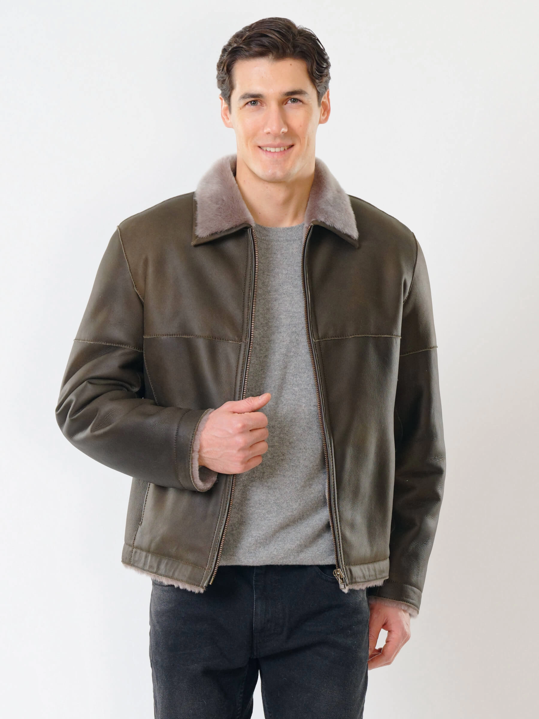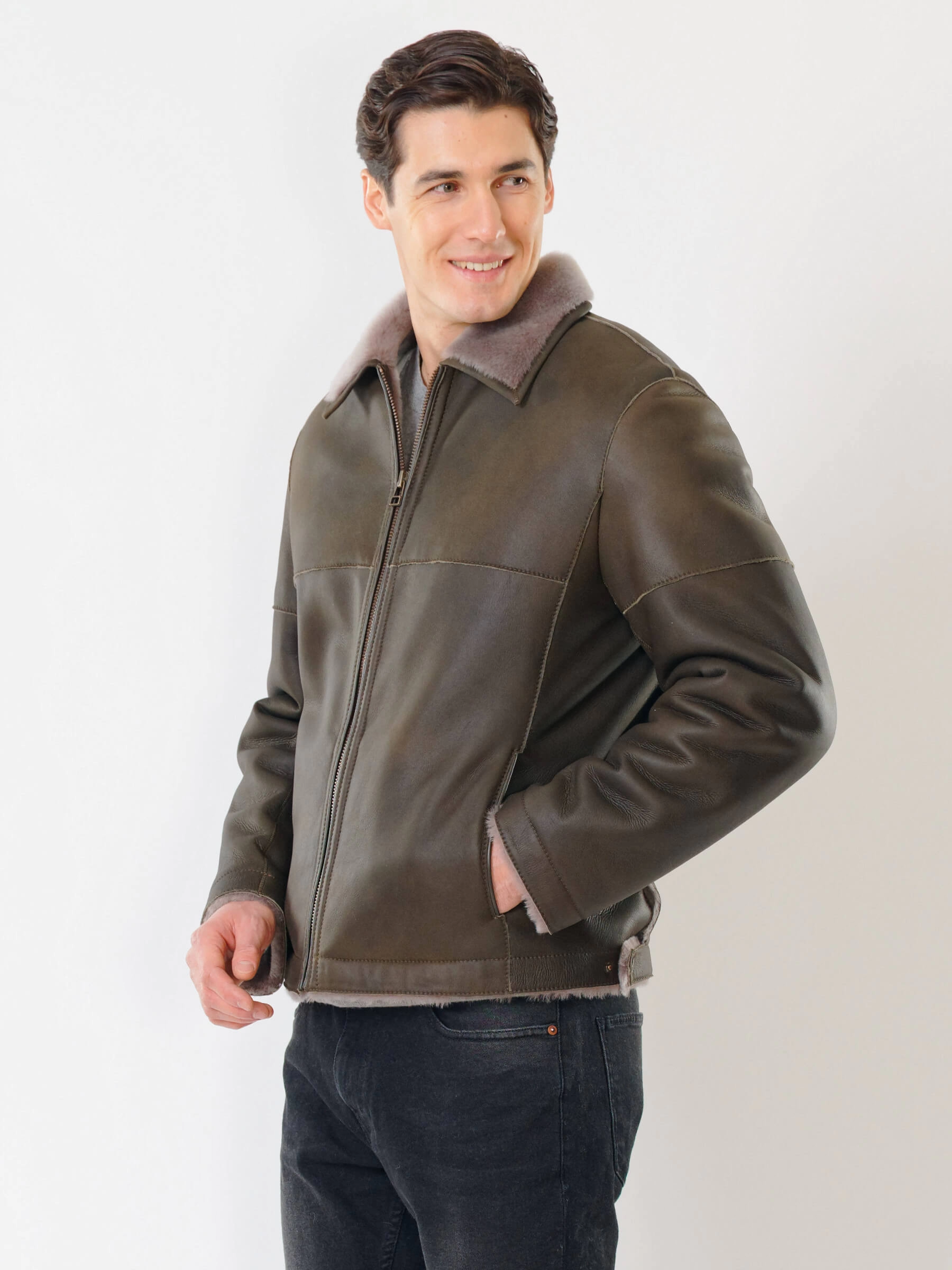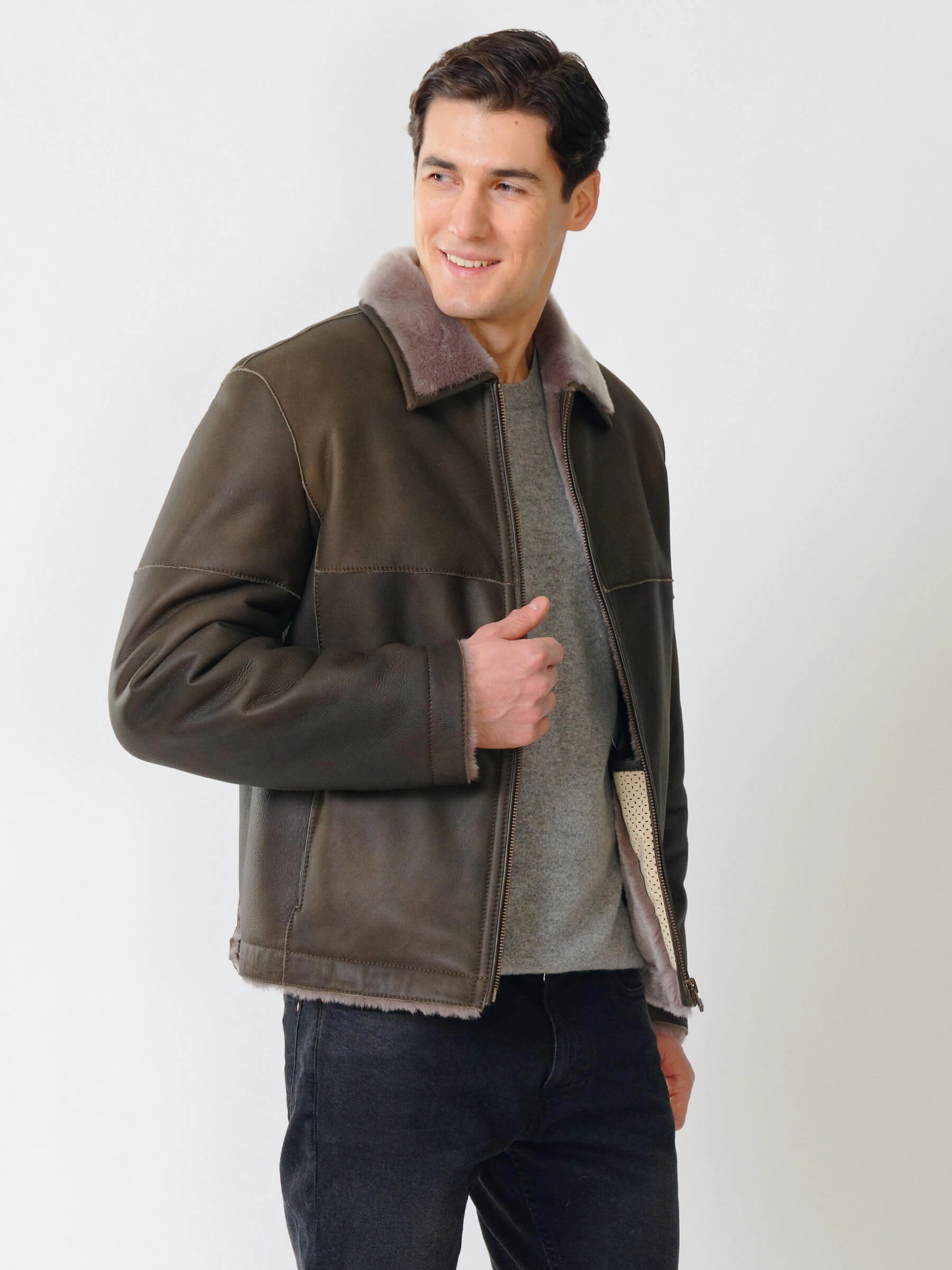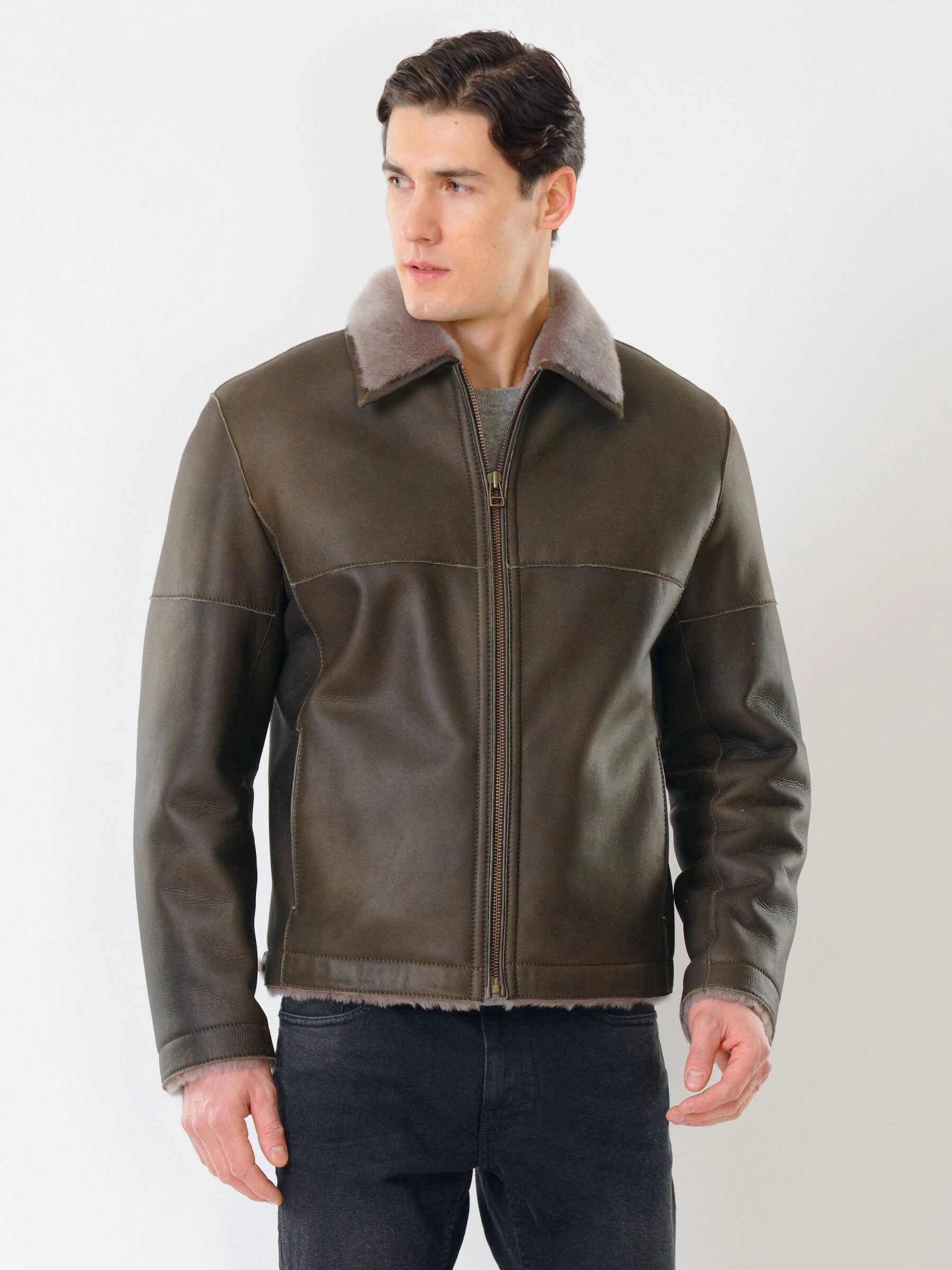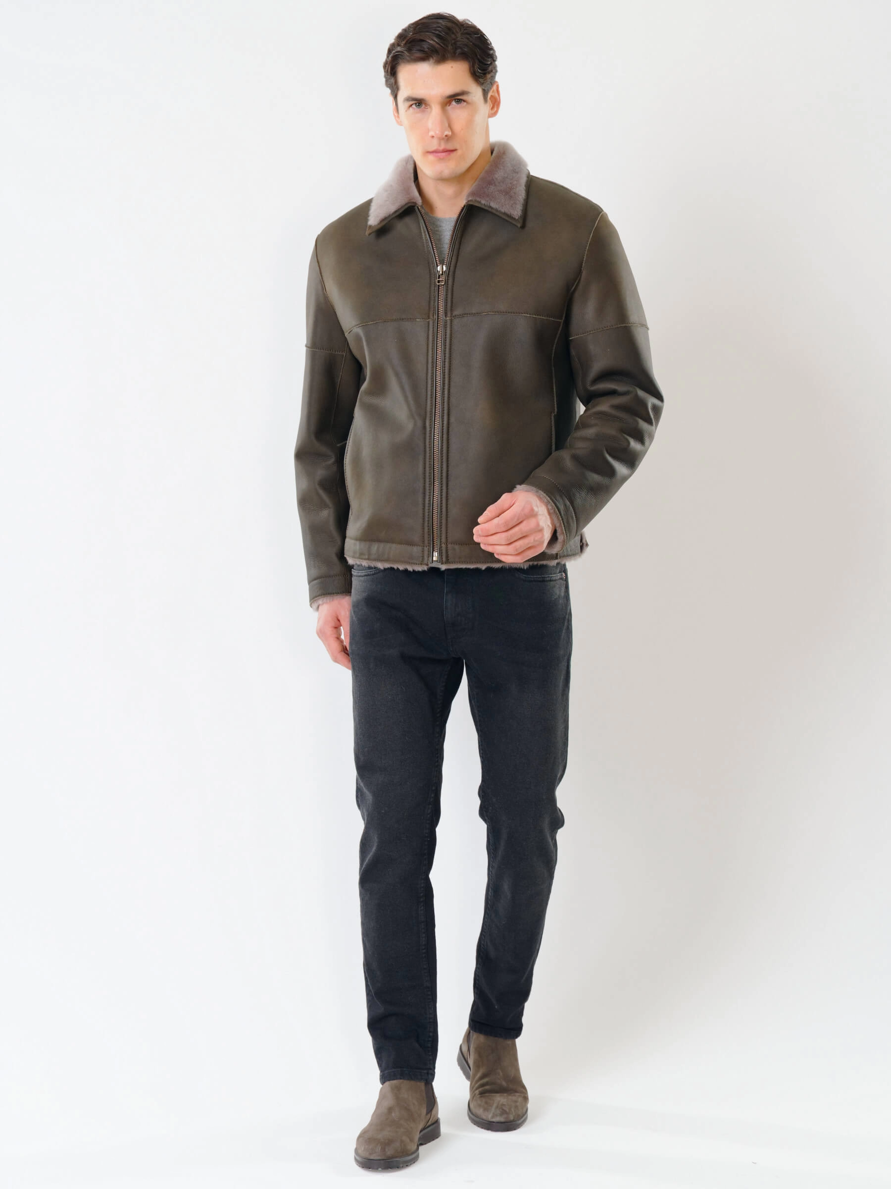 Товар короткая мужская дубленка 140, оливковая, размер 44, артикул 70381 выполнен из овчина "мерино" с застежкой молния. Рассчитан на сезон: осень-зима. Длина изделия 70 см, силуэт прямой.