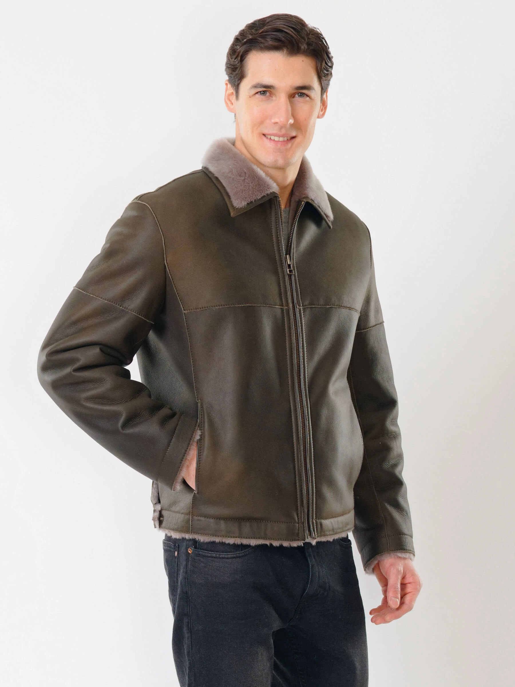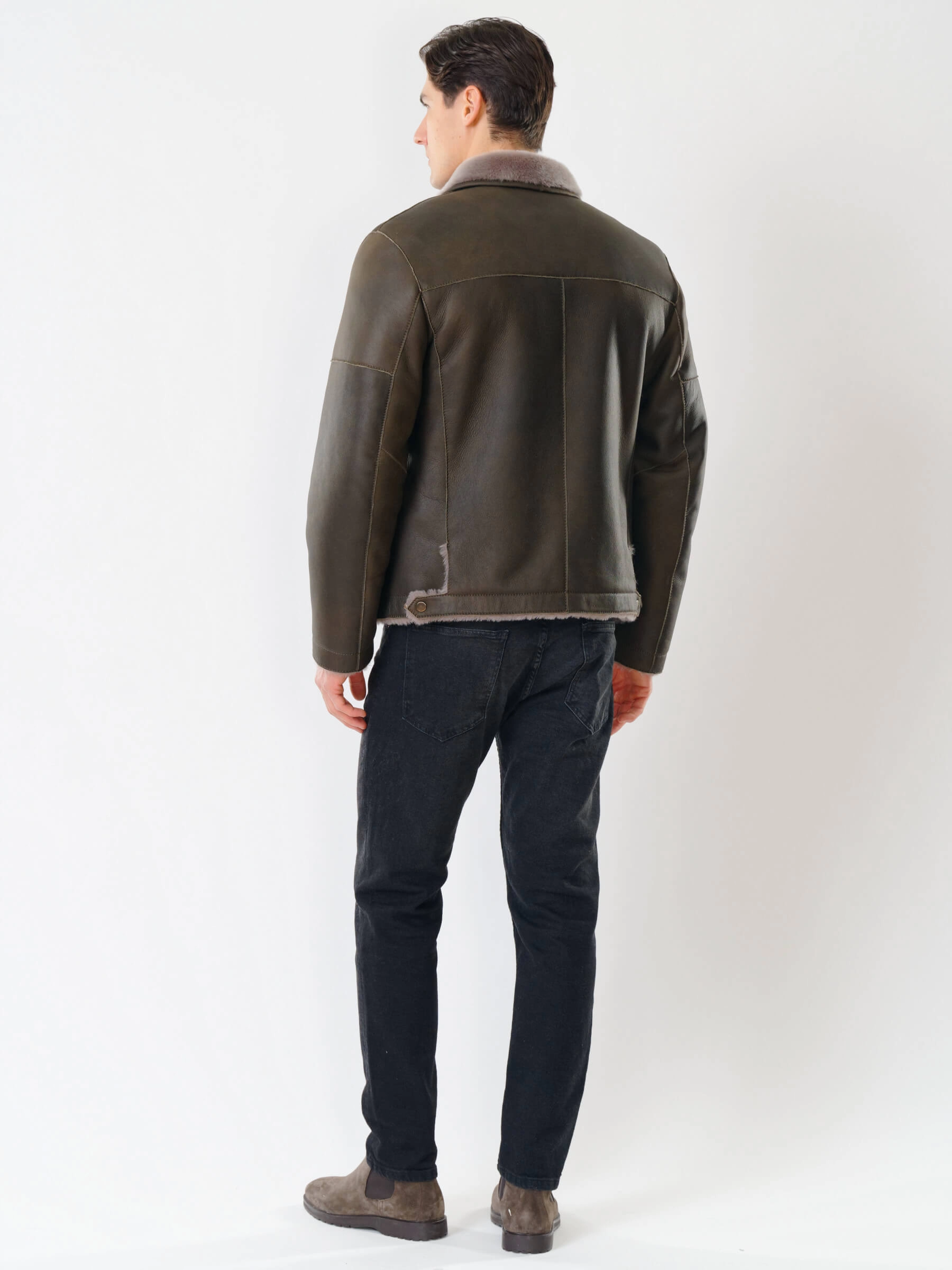 Короткая мужская дубленка 140, оливковая, размер 44, артикул 70381