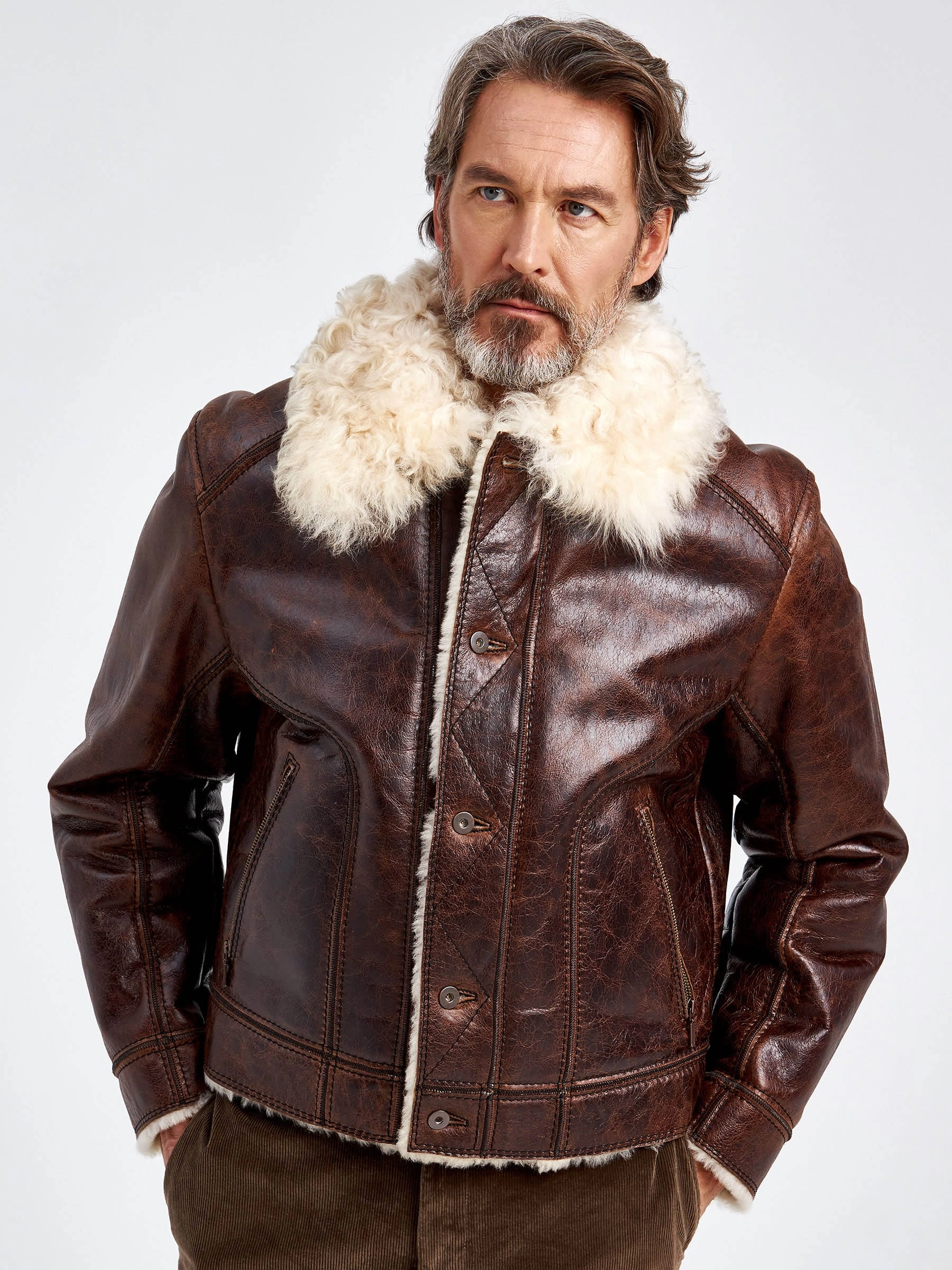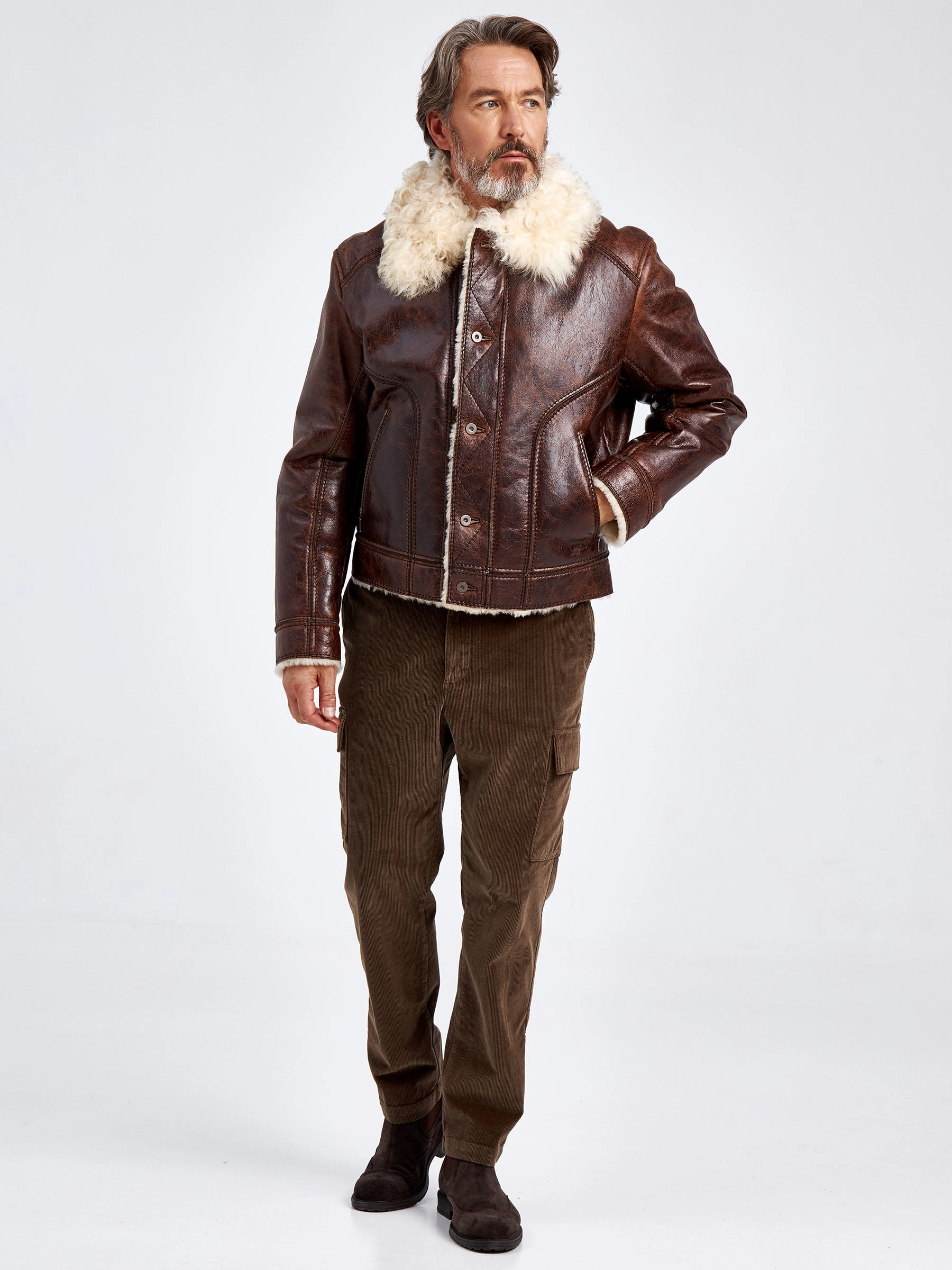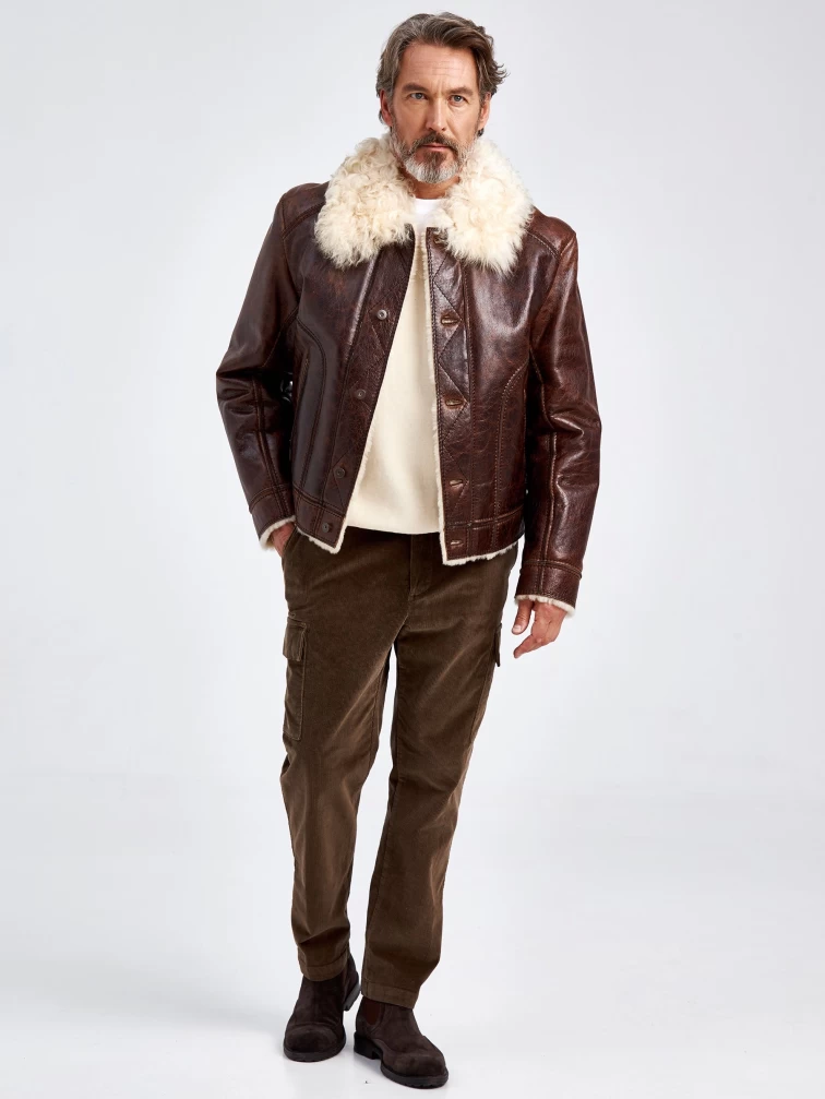 Товар зимняя мужская кожаная куртка на подкладке из овчины тиградо 151, коричневая, размер 52, артикул 70680 выполнен из овчина "мерино" с застежкой пуговицы. Рассчитан на сезон: осень-зима. Длина изделия 66 см, силуэт прямой.