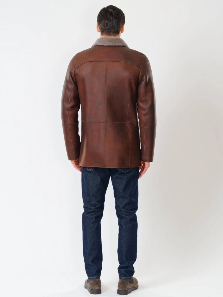 Современная мужская дублёнка, классической длины. Удобные карманы для ключей и документов. Новейшее защитное покрытие. Особо прочные нитки. Приятный на ощупь, максимально густой мех мериносной породы овец. Идеальные швы, продуманные и удобные элементы. Аккуратность во всей работе. Чёткая и очень удобная посадка по фигуре. Великолепная свобода движений. Абсолютный комфорт.