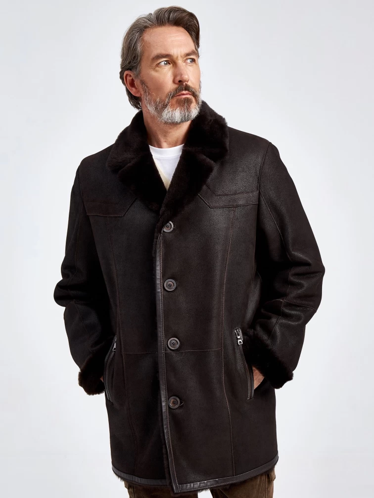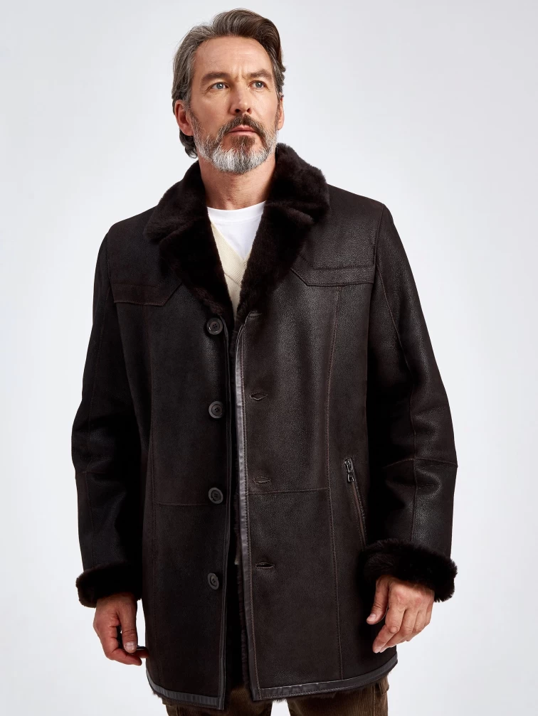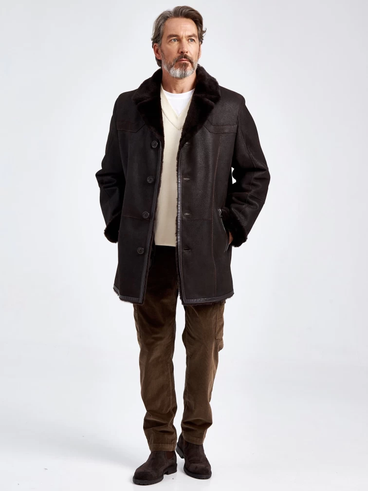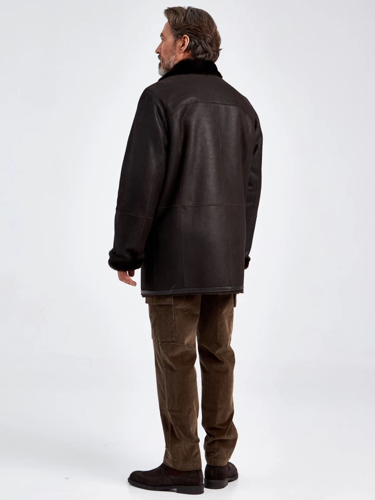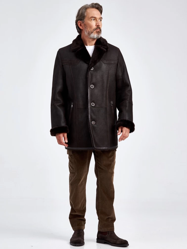 Современная мужская дублёнка, классической длины. Удобные карманы для ключей и документов. Верхняя застёжка закрывает горловину. Новейшее защитное покрытие. Особо прочные нитки. Приятный на ощупь, максимально густой мех мериносной породы овец. Идеальные швы, продуманные и удобные элементы. Аккуратность во всей работе. Чёткая и очень удобная посадка по фигуре. Великолепная свобода движений. Абсолютный комфорт.