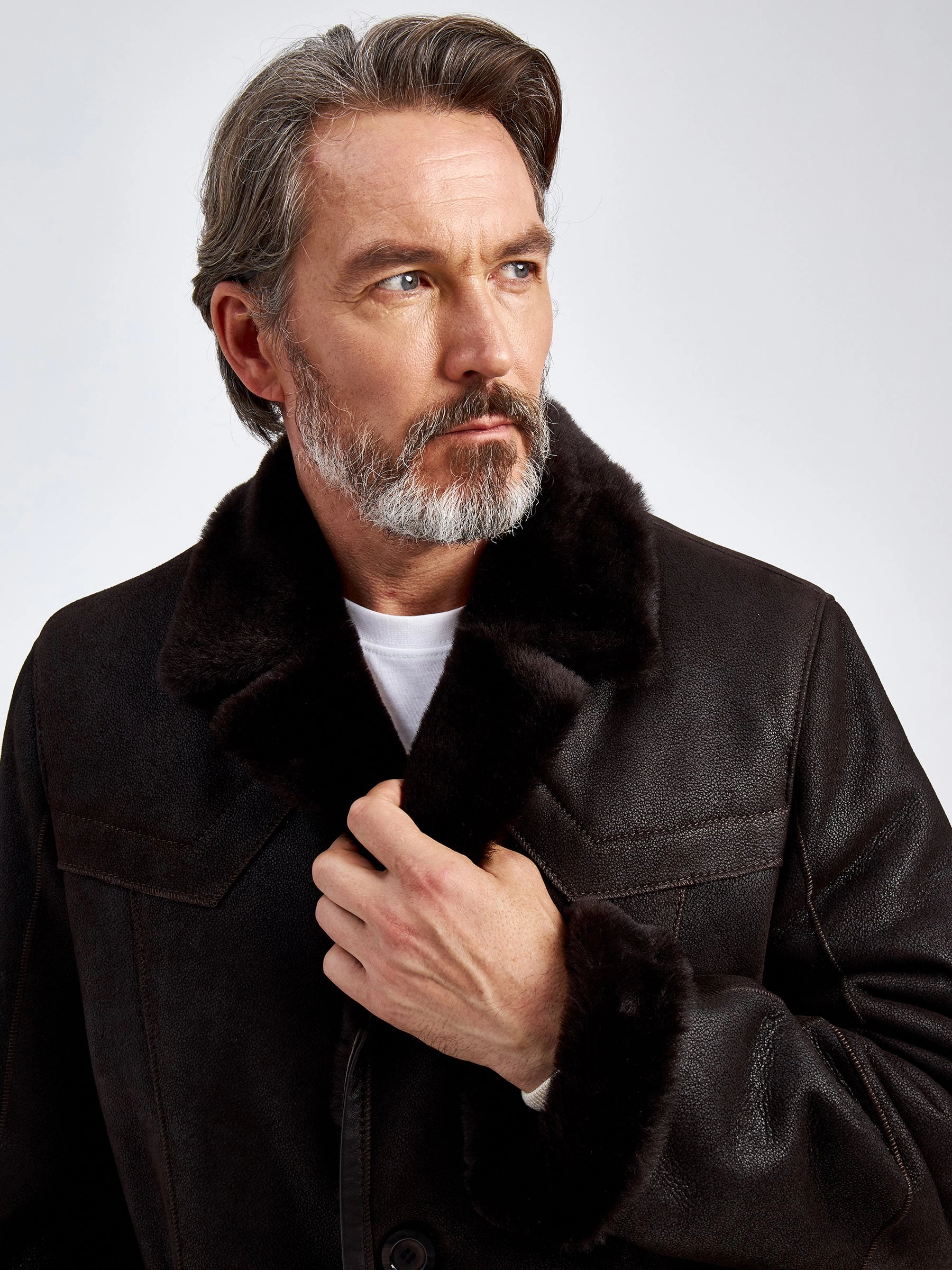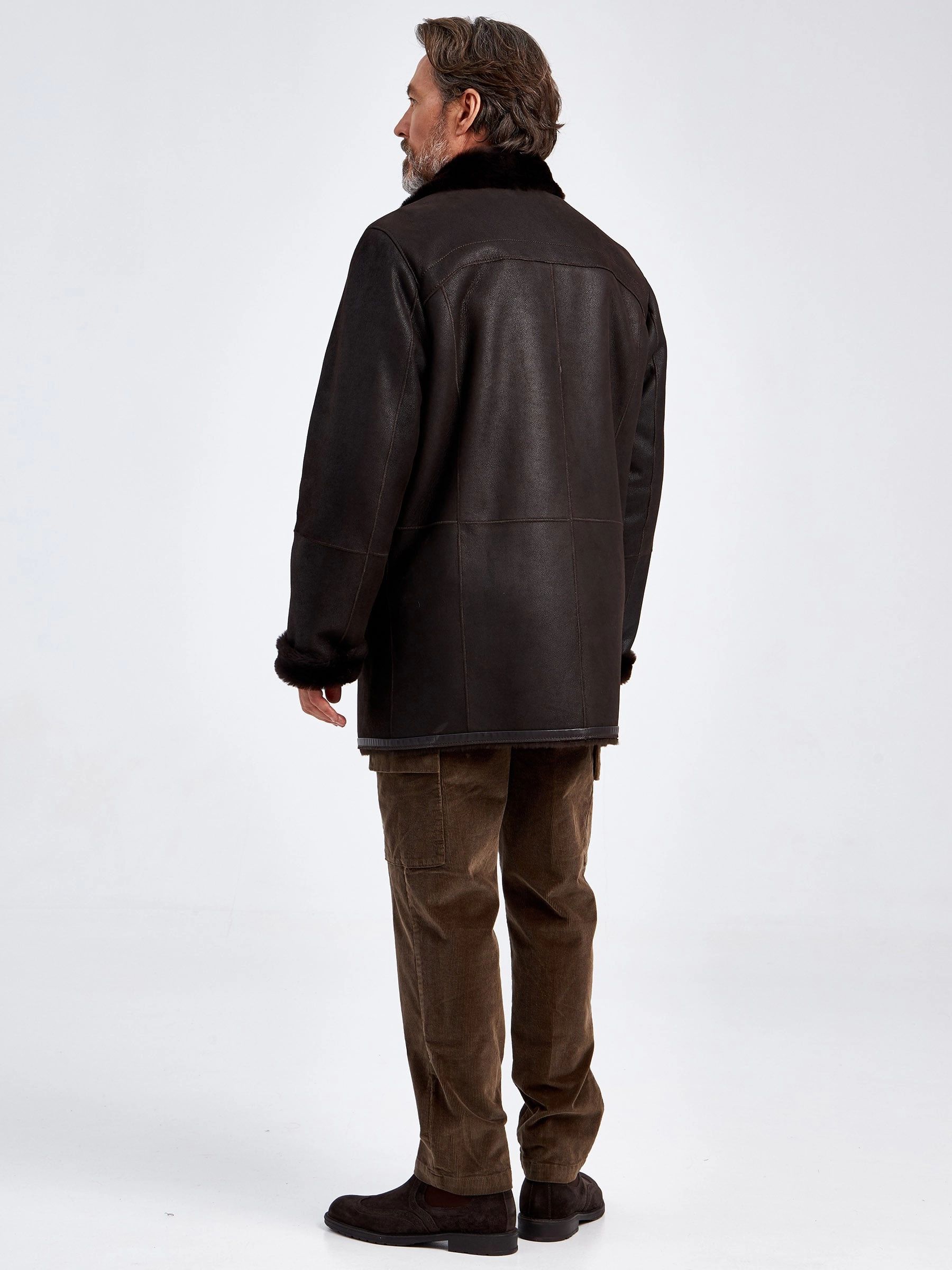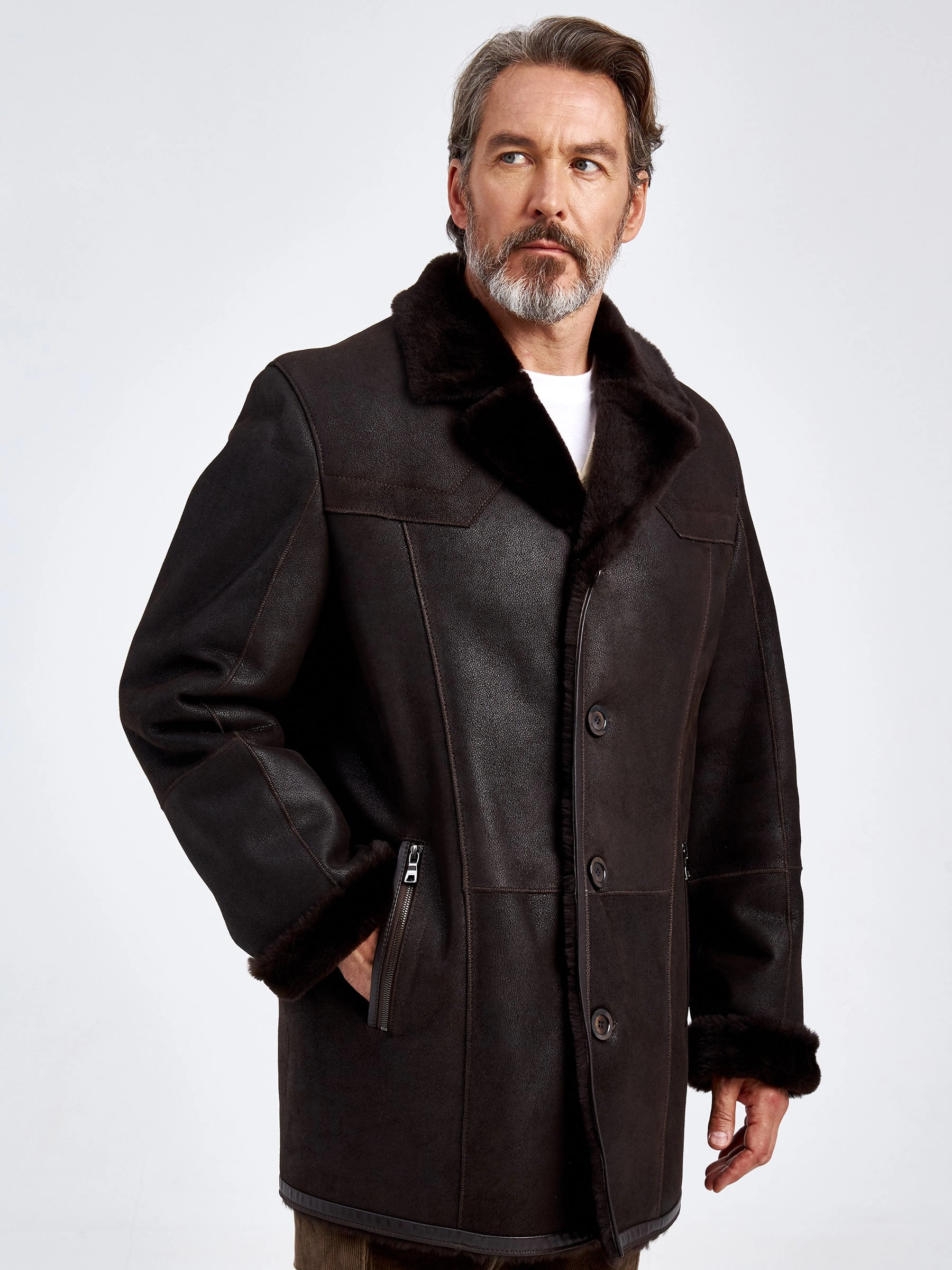 Современная мужская дублёнка, классической длины. Удобные карманы для ключей и документов. Верхняя застёжка закрывает горловину. Новейшее защитное покрытие. Особо прочные нитки. Приятный на ощупь, максимально густой мех мериносной породы овец. Идеальные швы, продуманные и удобные элементы. Аккуратность во всей работе. Чёткая и очень удобная посадка по фигуре. Великолепная свобода движений. Абсолютный комфорт.