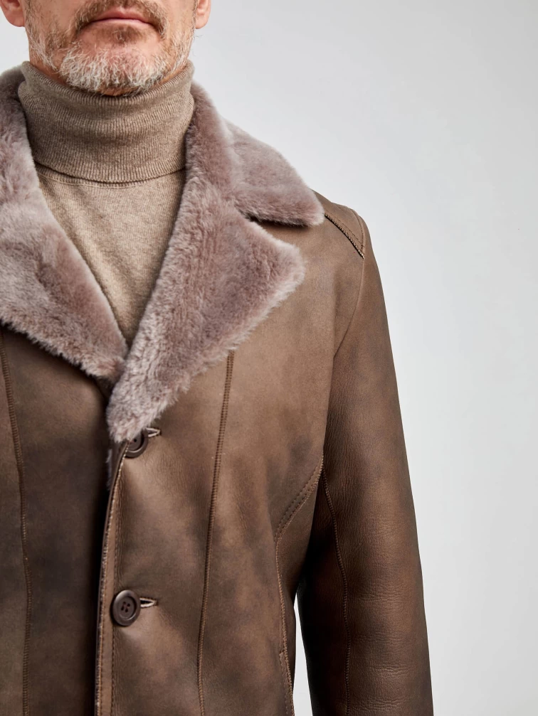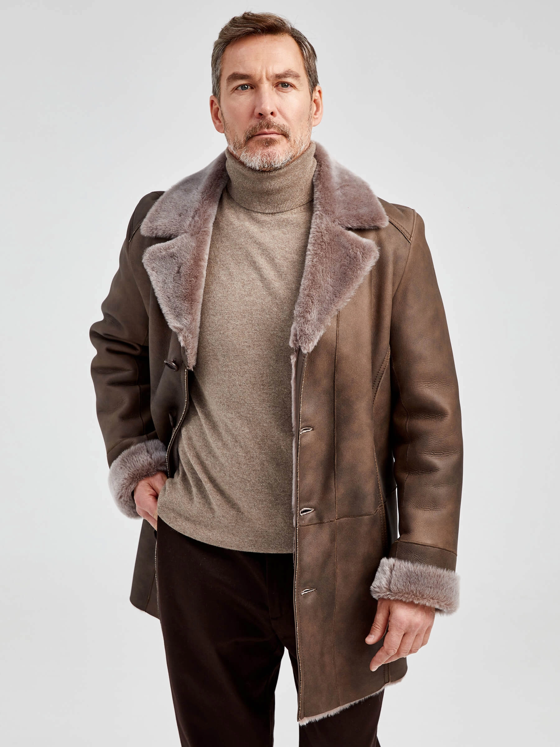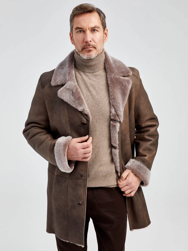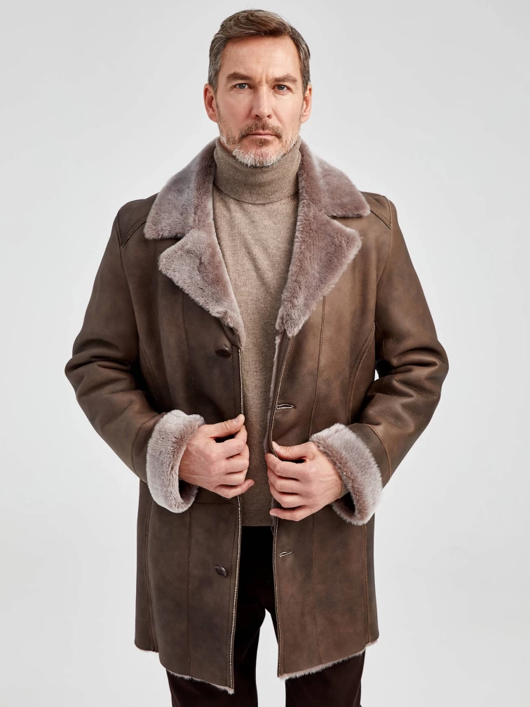 Современная мужская дублёнка классической длины. Удобные карманы для ключей и документов. Новейшее защитное покрытие. Особо прочные нитки. Приятный на ощупь, максимально густой мех мериносной породы овец. Идеальные швы, продуманные и удобные элементы. Аккуратность во всей работе. Чёткая и очень удобная посадка по фигуре. Великолепная свобода движений. Абсолютный комфорт.