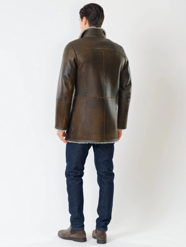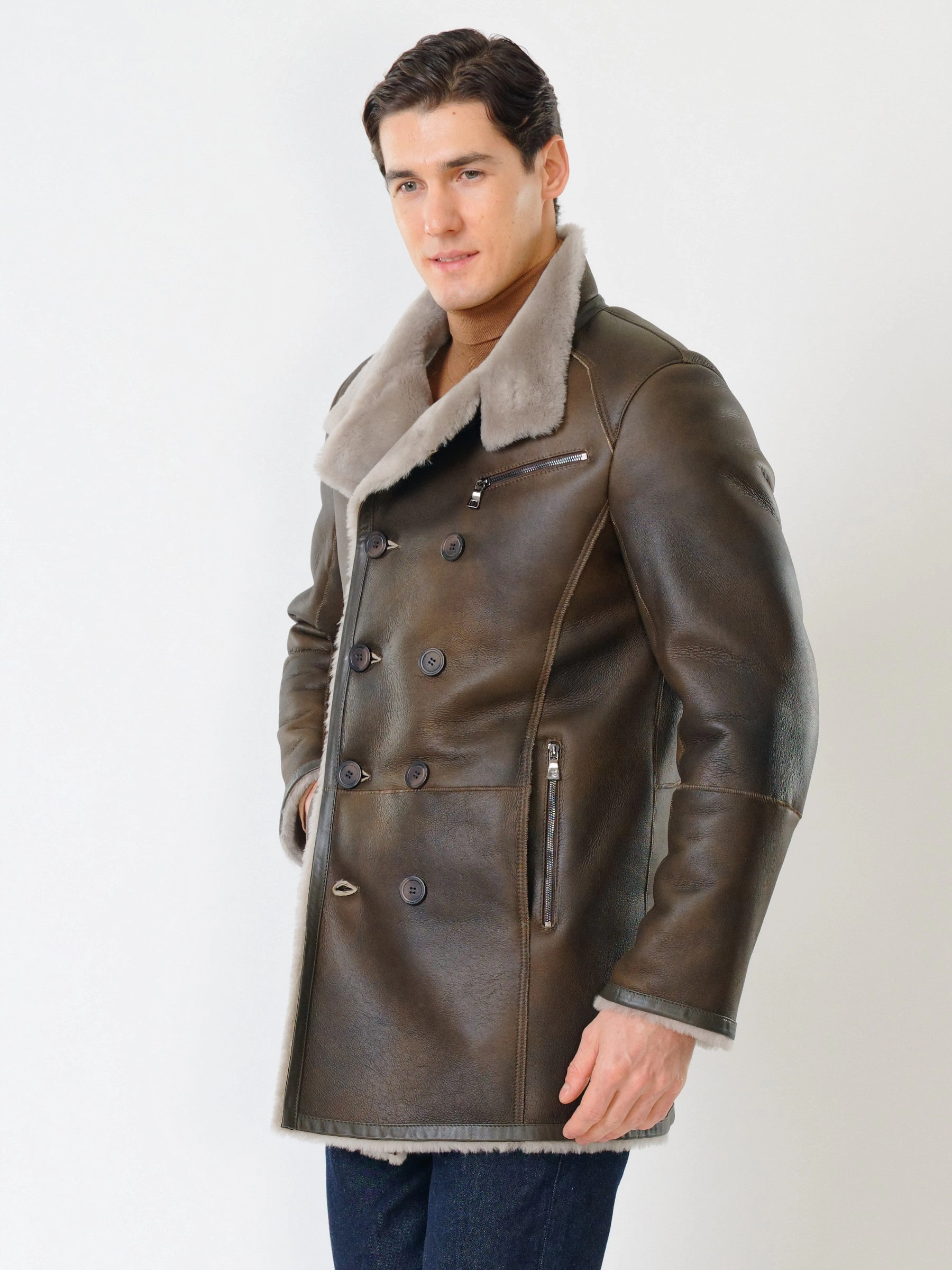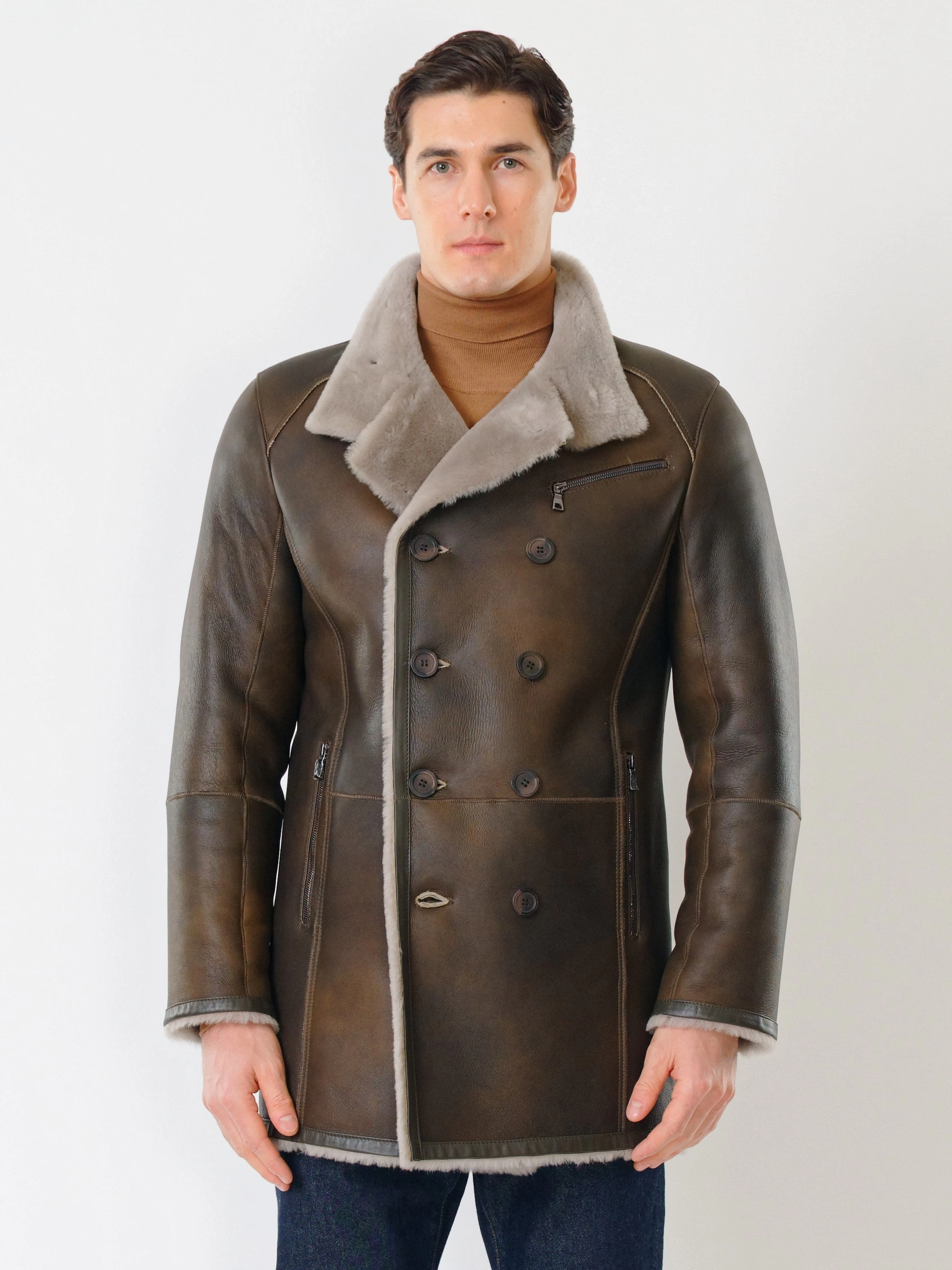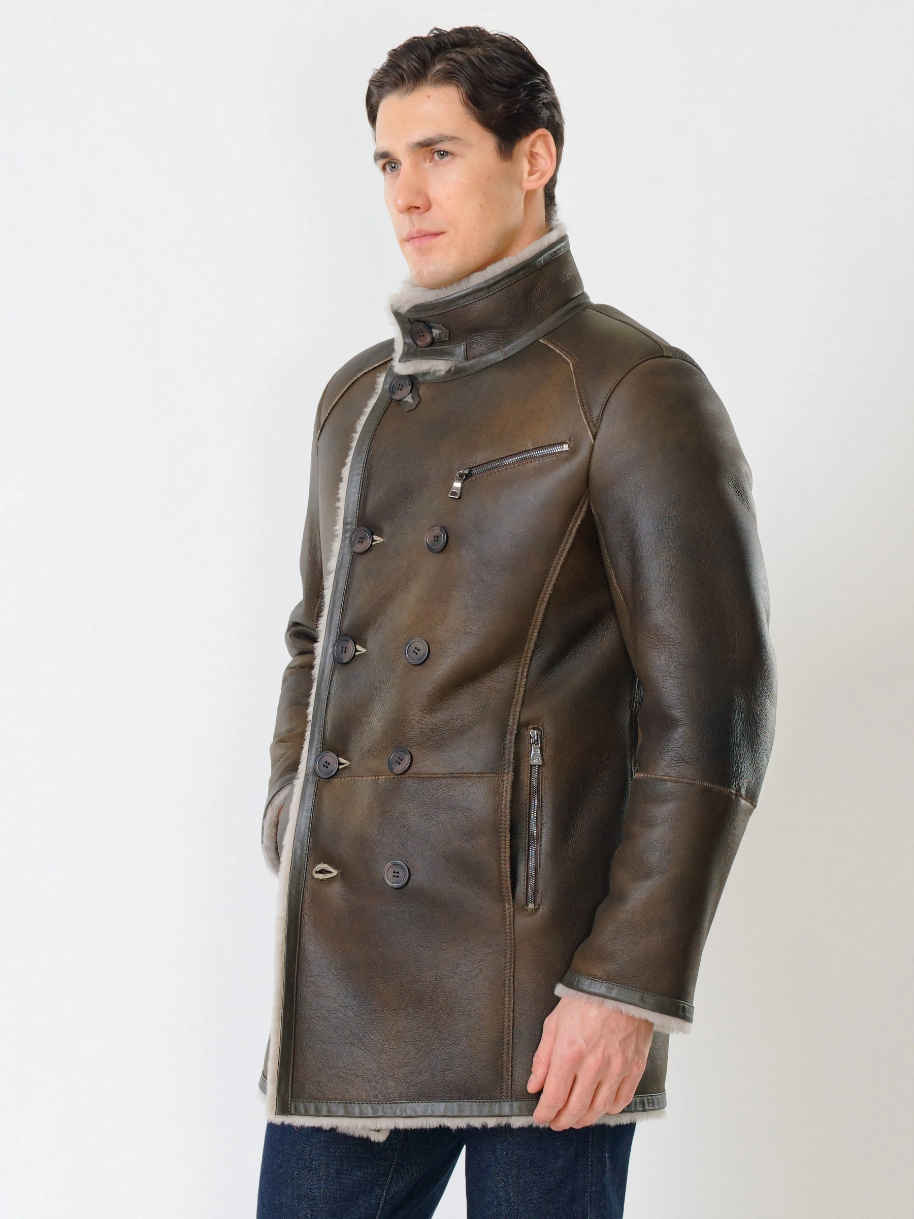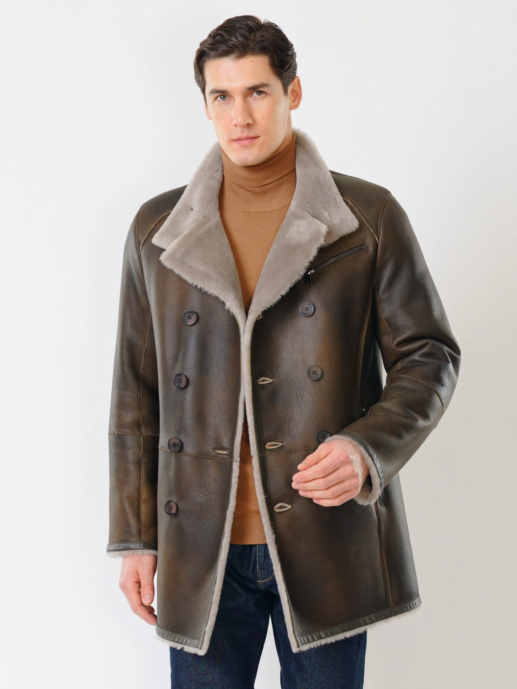 Классическая двубортная мужская дубленка 414, оливковая, размер 48, артикул 70460