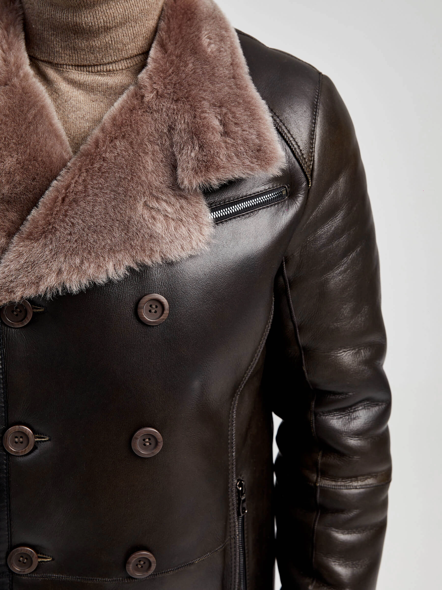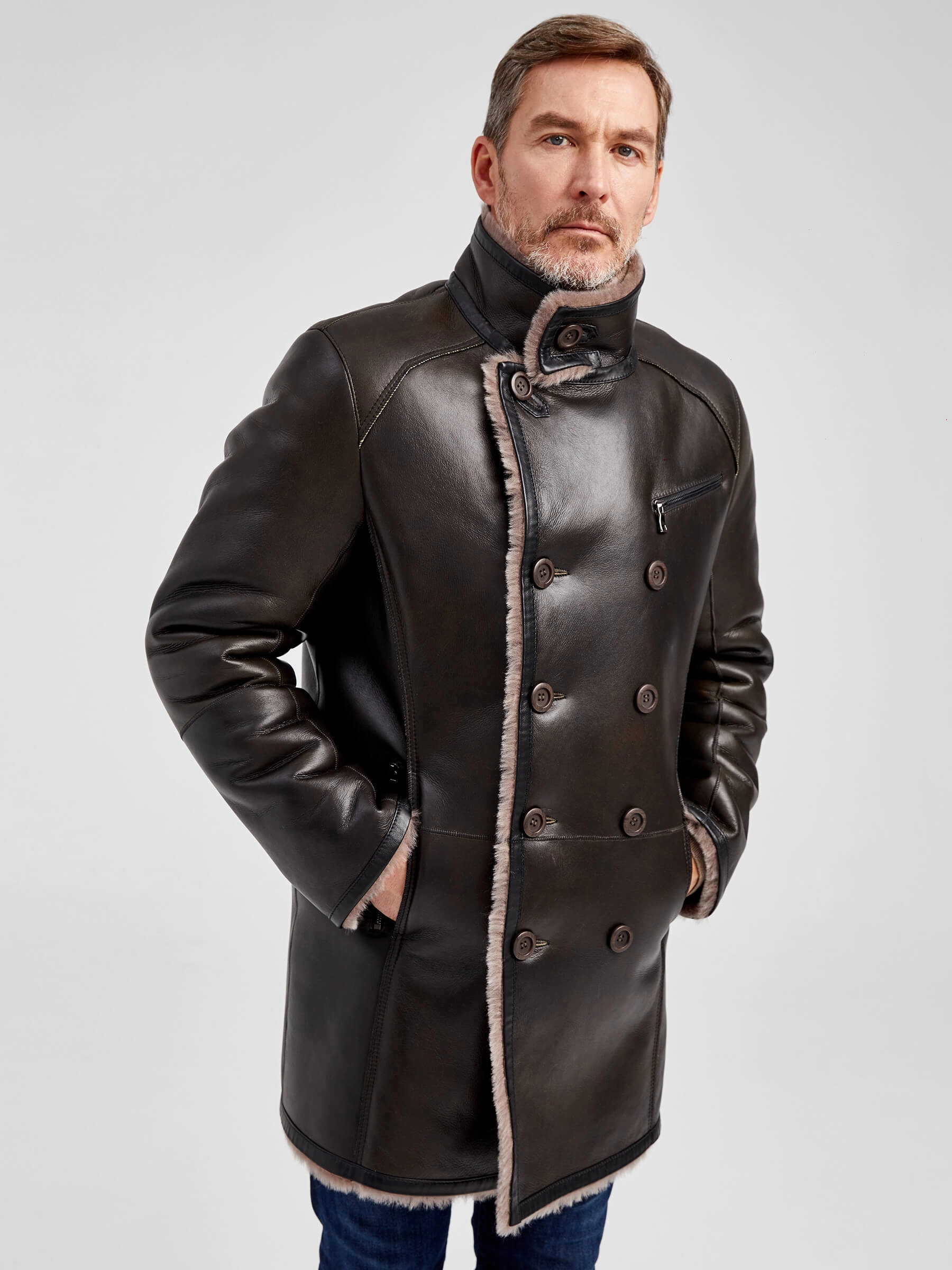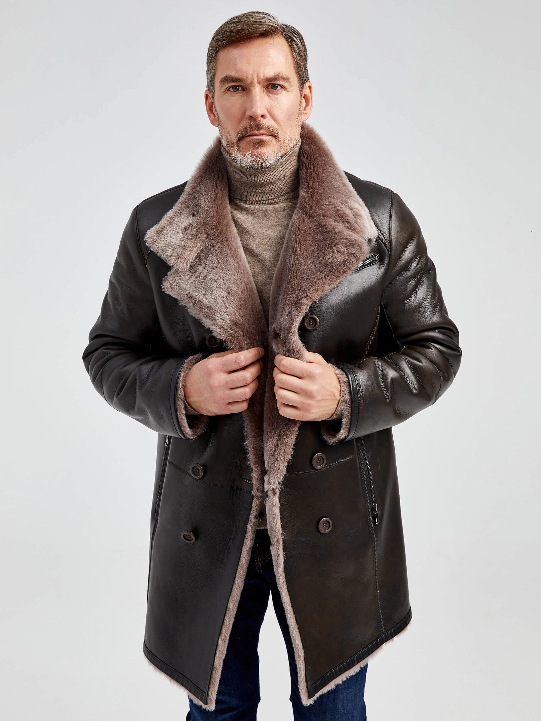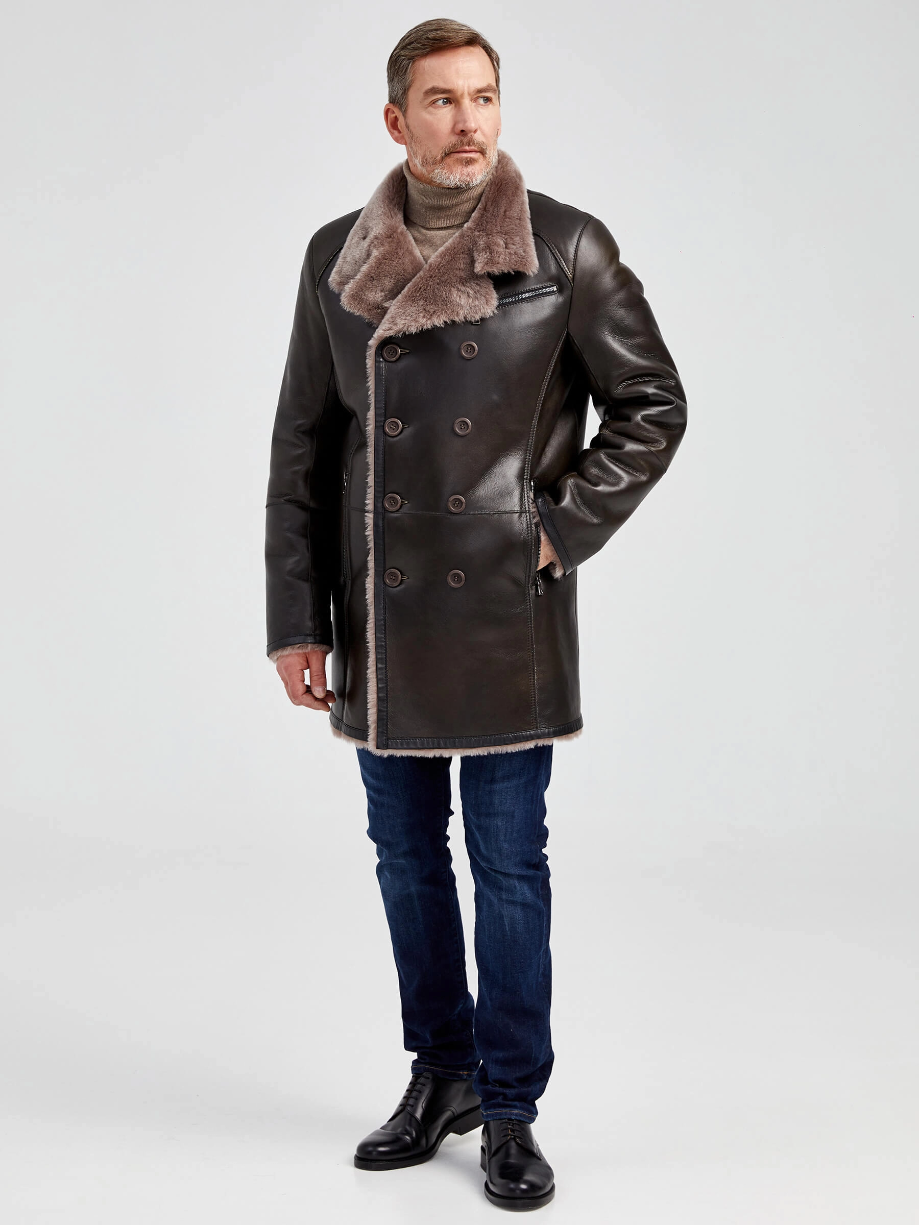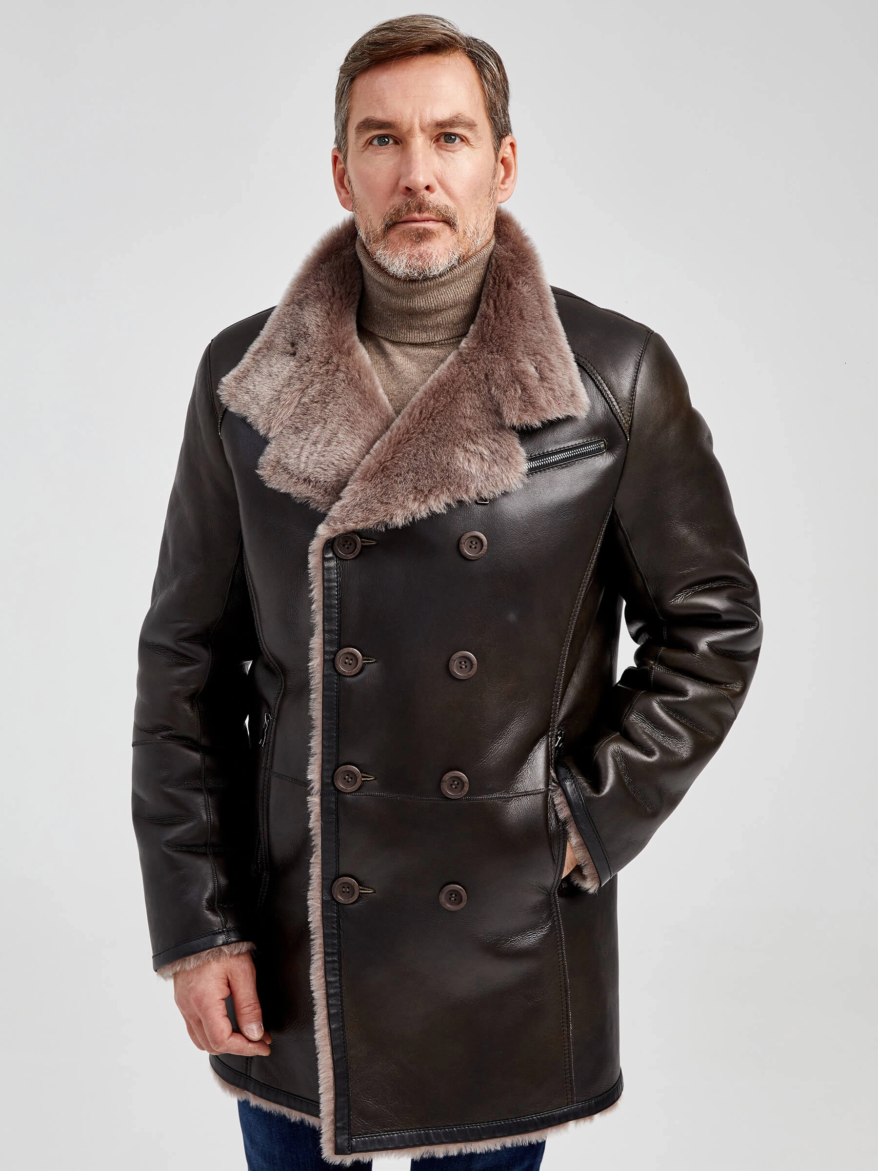 Стильная двубортная мужская дублёнка. Овчина мериносной породы овец высшего качества. Максимально густой мех прекрасно защитит от любого мороза. Новейшее устойчивое защитное покрытие. Воротник-трансформер. Удобные карманы для ключей и документов. Чёткая, выверенная посадка по фигуре. Безупречная работа наших портных.