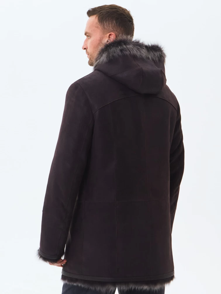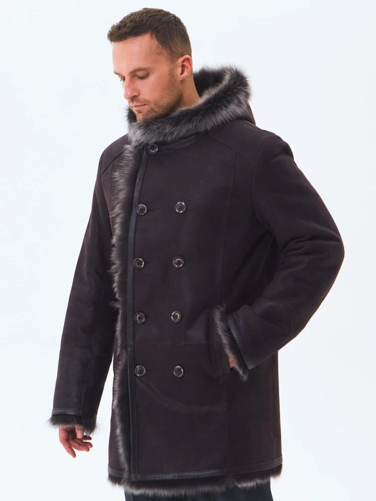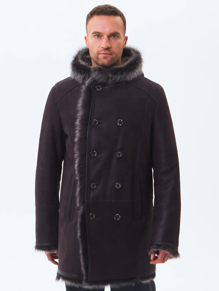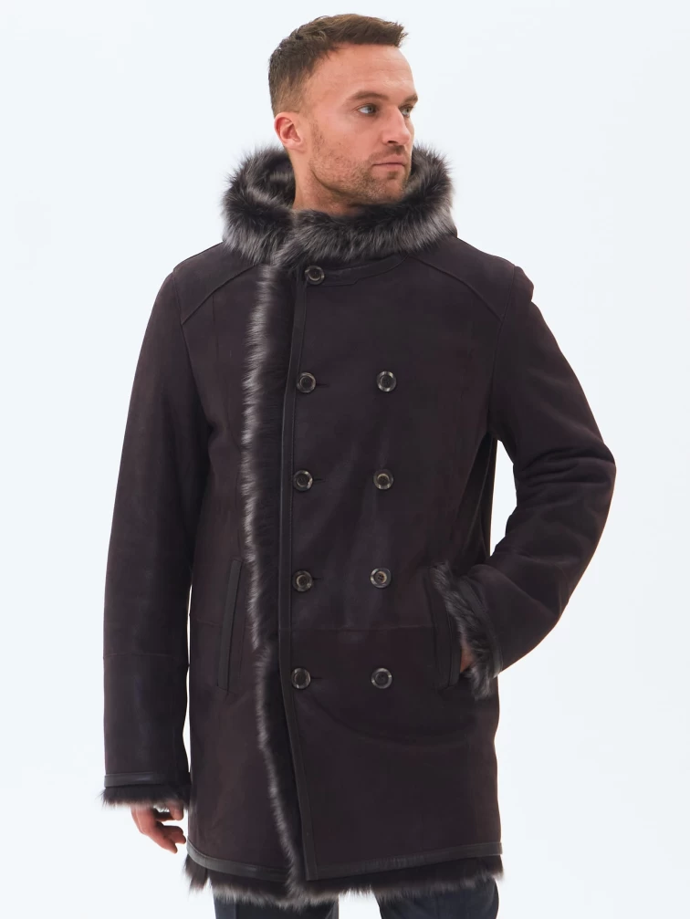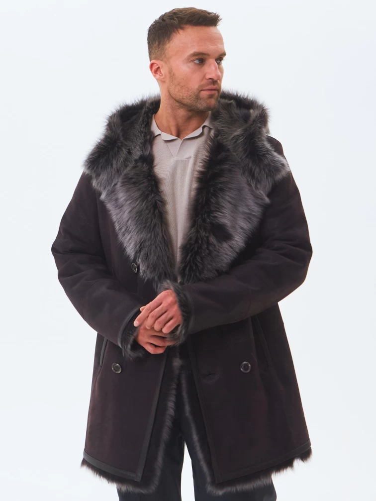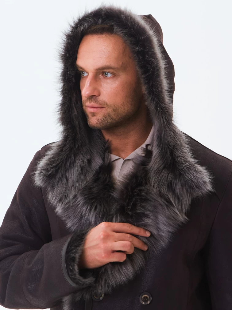Двубортная мужская дубленка из тосканы с капюшоном премиум класса 415, коричневая, размер 56, артикул 71600