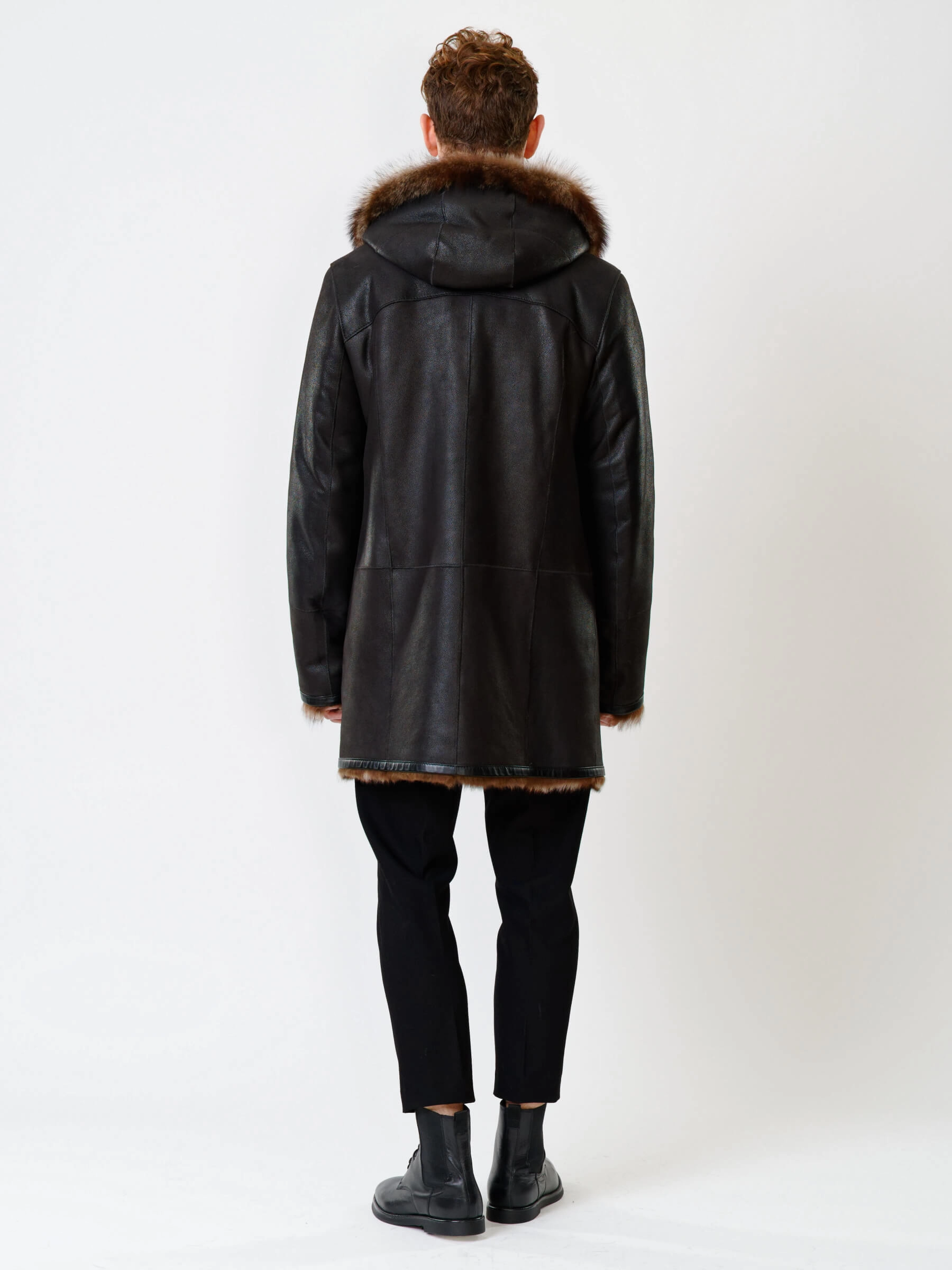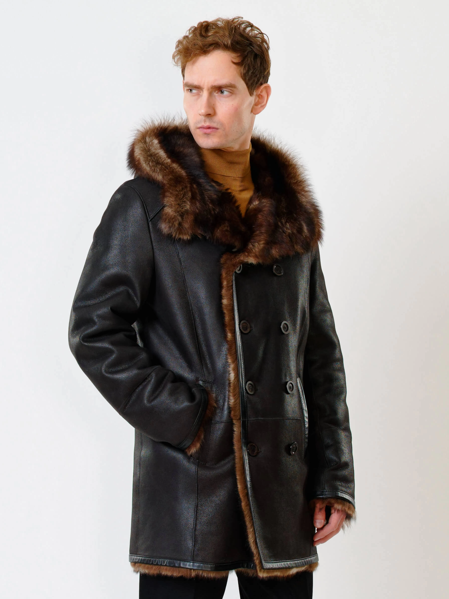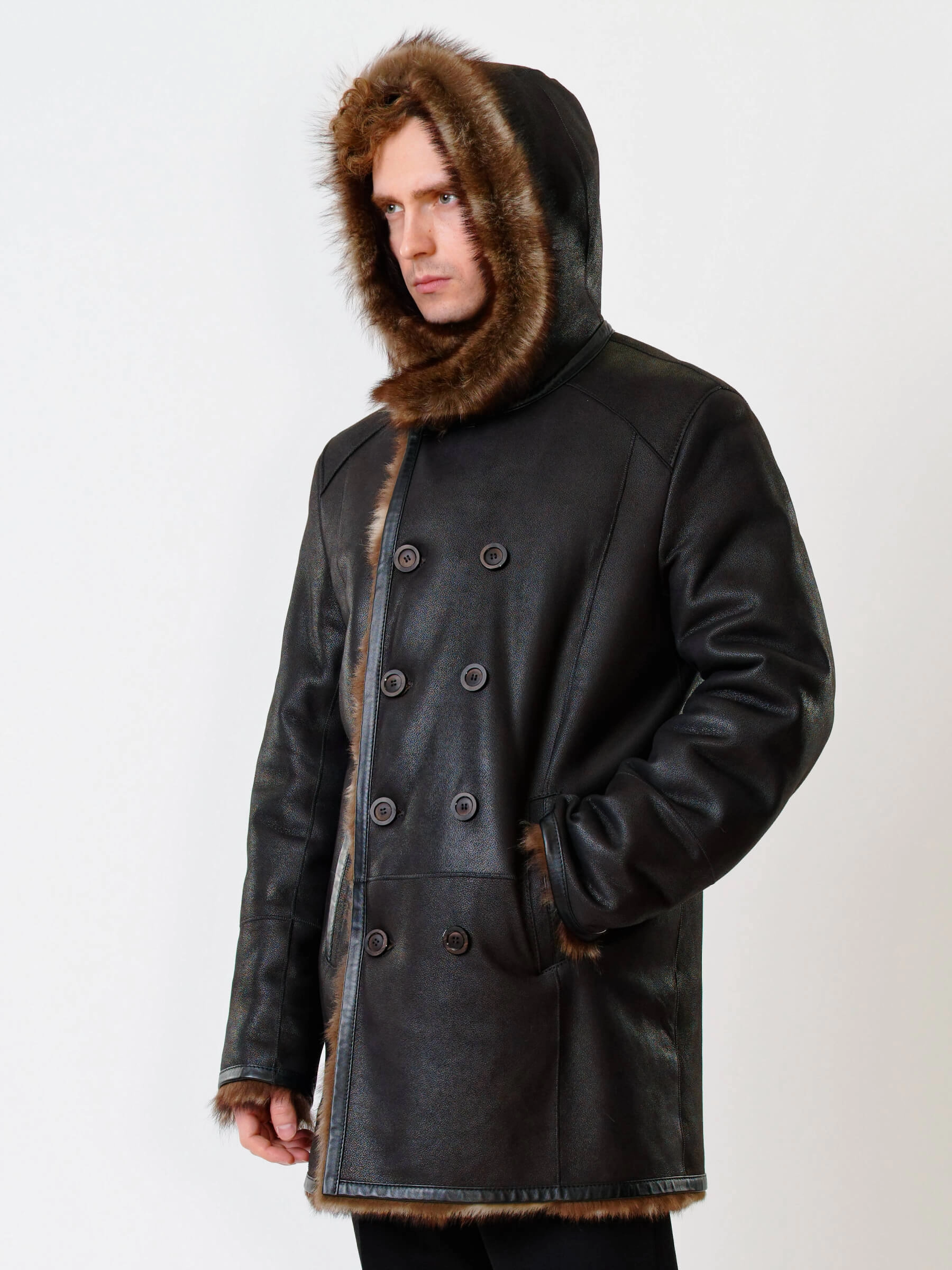 Великолепная двубортная мужская дублёнка из тосканской овчины. Удобный капюшон. Потрясающее качество материалов. Красивый мех очень густой и высокий, поэтому дублёнка великолепно греет в любой мороз. Новейшее износостойкое защитное покрытие. Минимальный вес. Идеальные швы, продуманные элементы. Аккуратность во всей работе. Чёткая и очень удобная посадка по фигуре. Премиальный уровень.