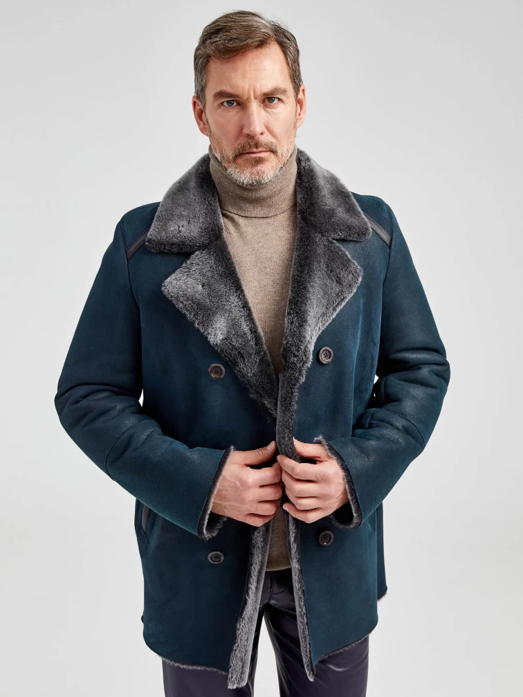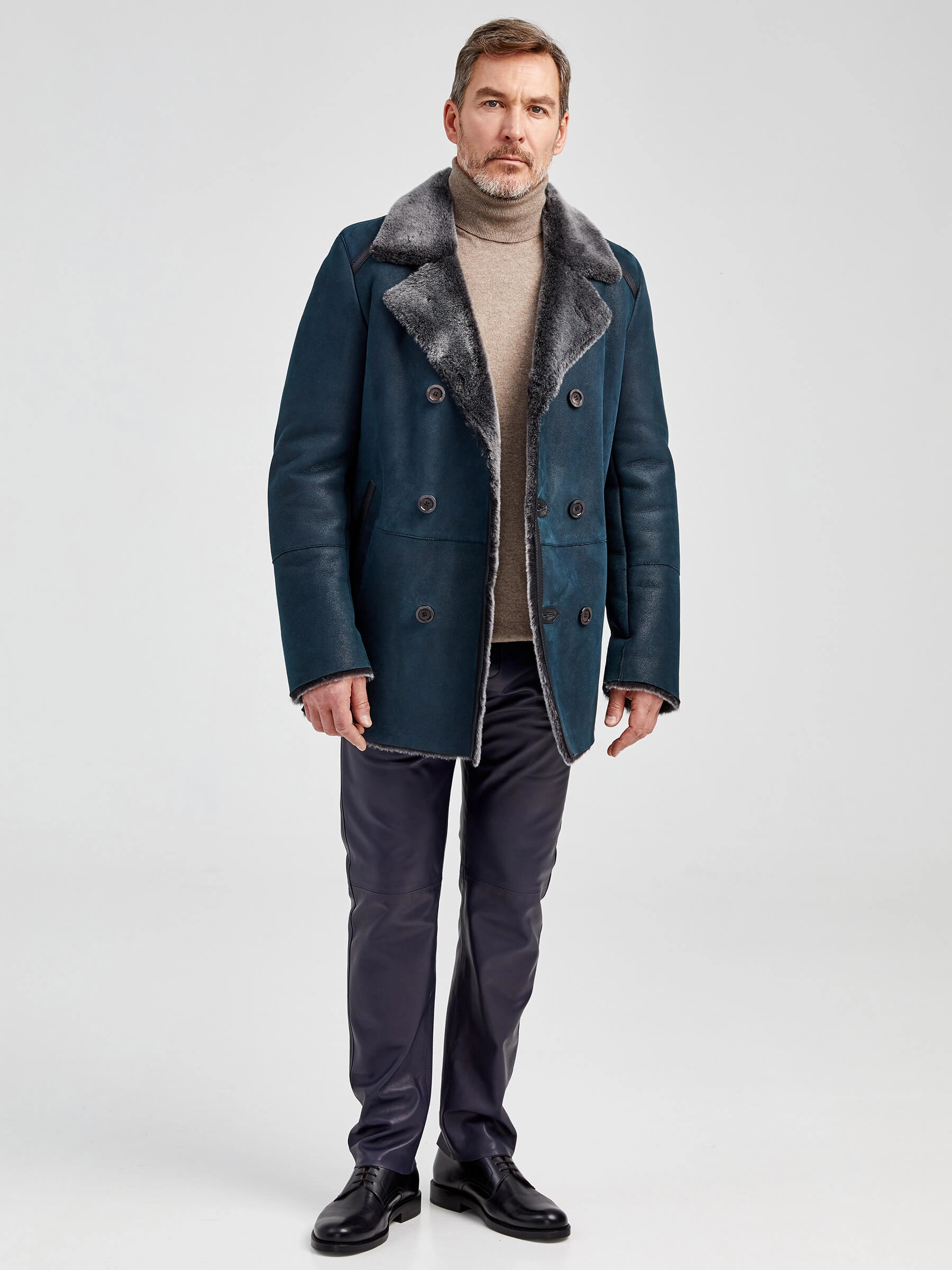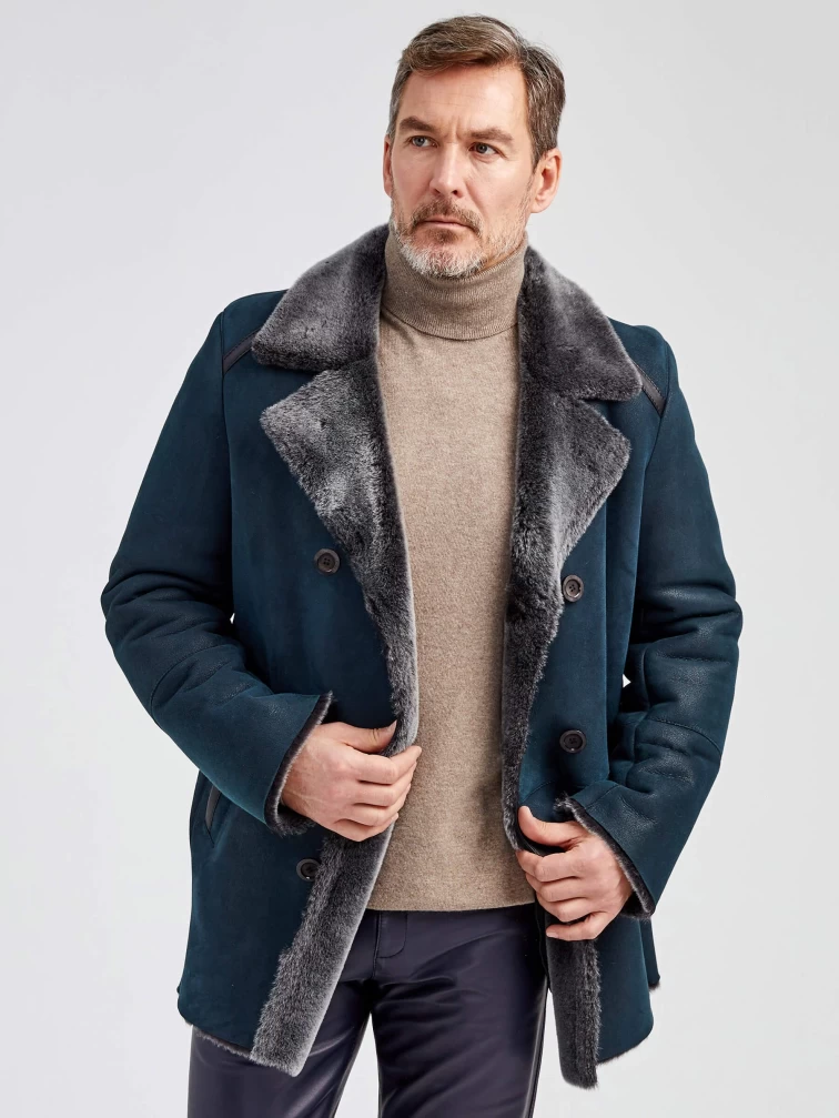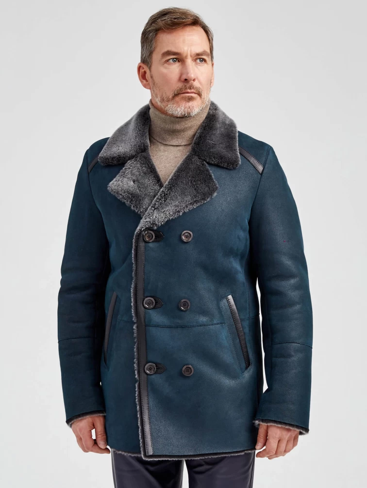 Дубленка двубортная классическая мужская 422, синяя, размер 60, артикул 70882
