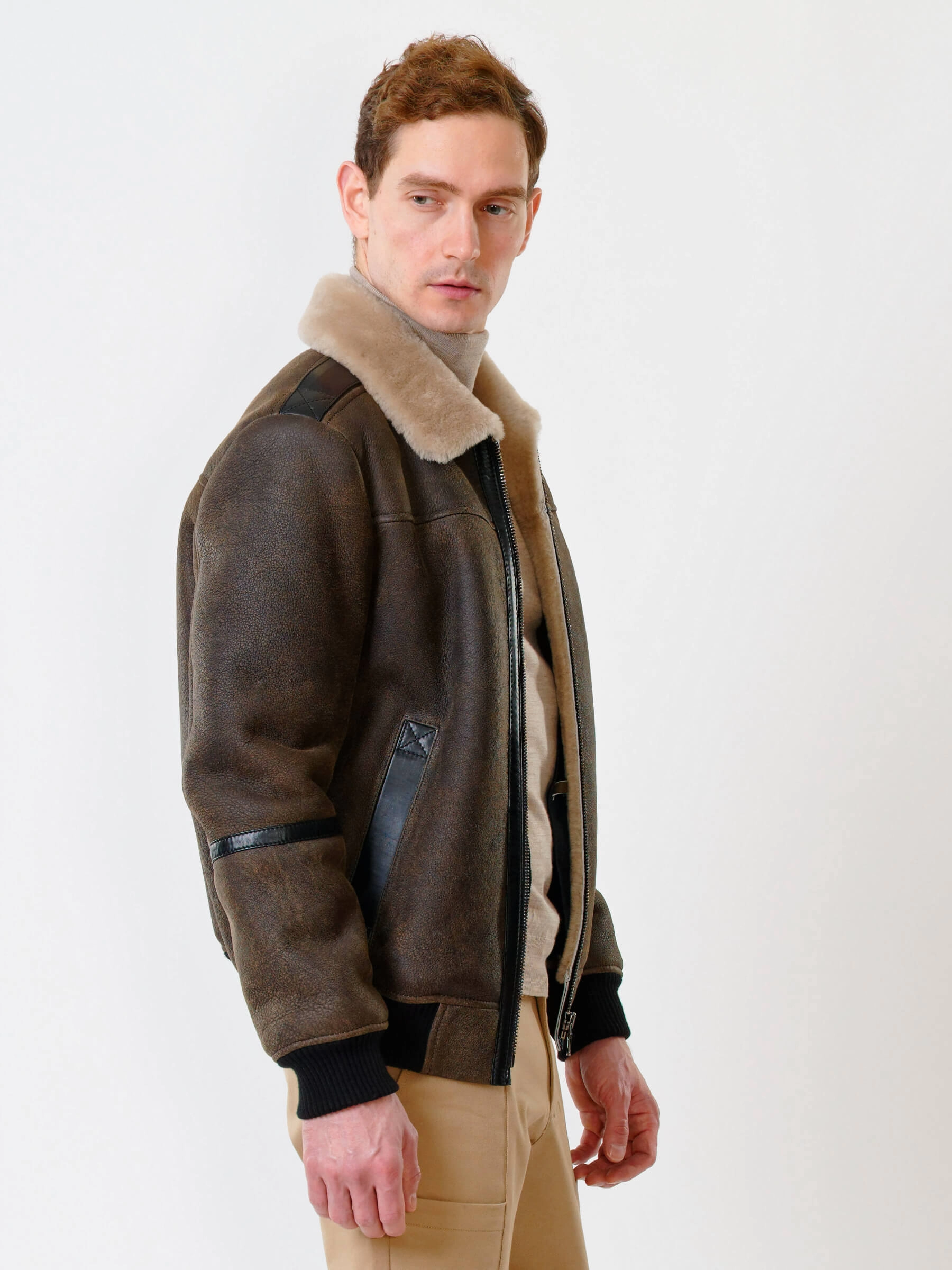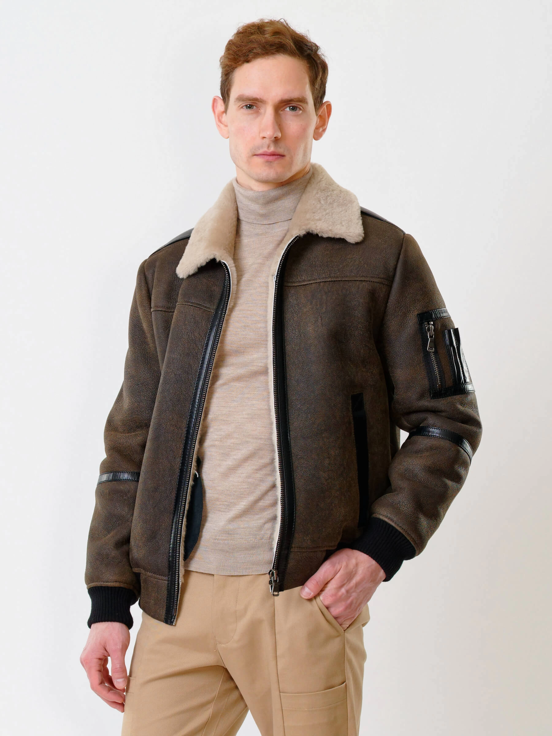 Дублёнка-авиатор. Специальная технология стирки овчины придает поверхности дублёнки повышенную износостойкость. Максимально густой мех. Минимальный вес. Предусмотрены внутренние карманы для документов. Безупречная работа наших портных. Комфортная посадка по фигуре. Великолепная свобода движений.