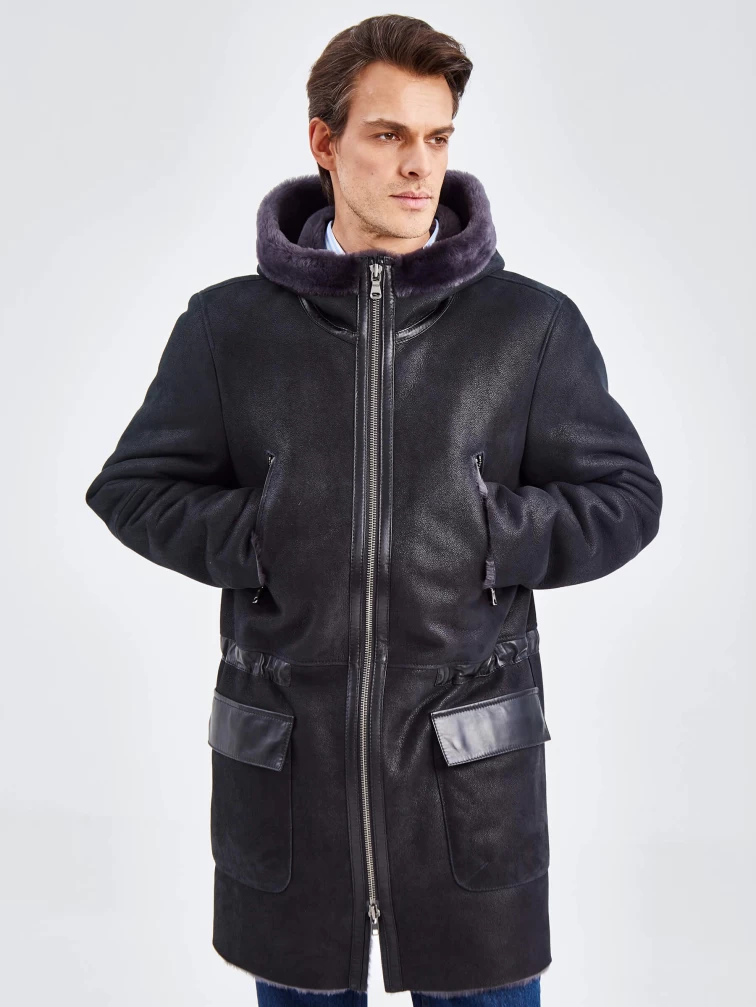 Товар длинная мужская дубленка с капюшоном премиум класса 429, черная, размер 48, артикул 71460 выполнен из овчина "мерино" с застежкой молния. Рассчитан на сезон: осень-зима. Длина изделия 92 см, силуэт прямой.