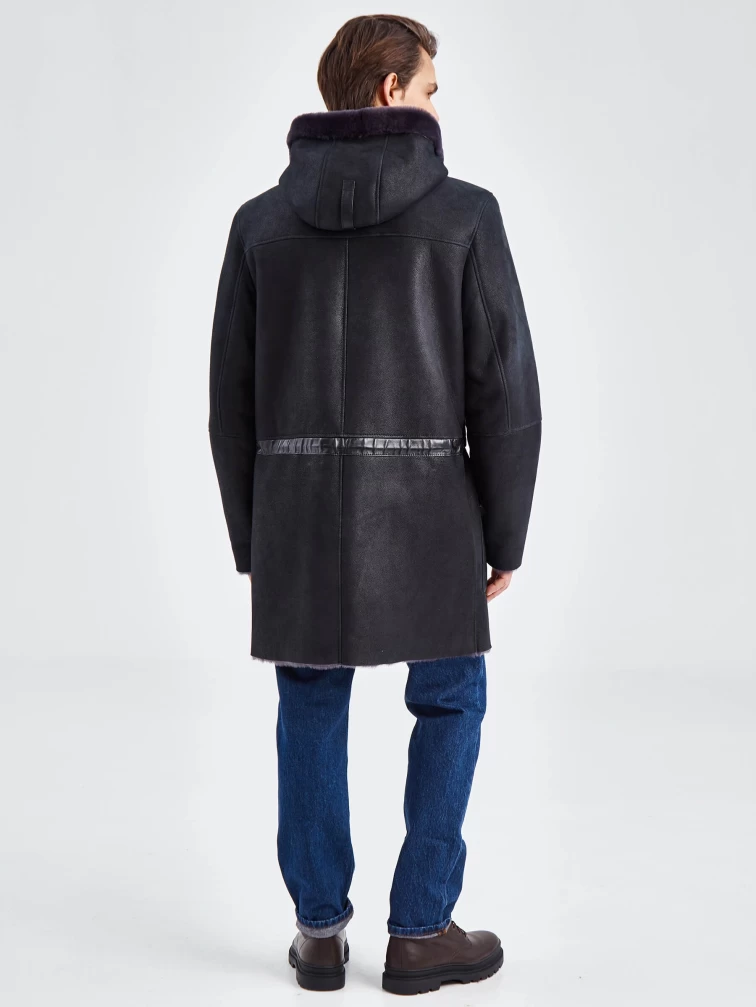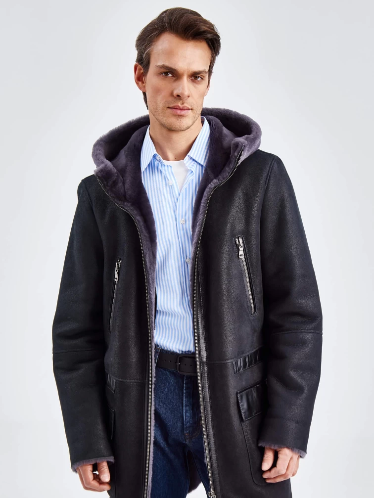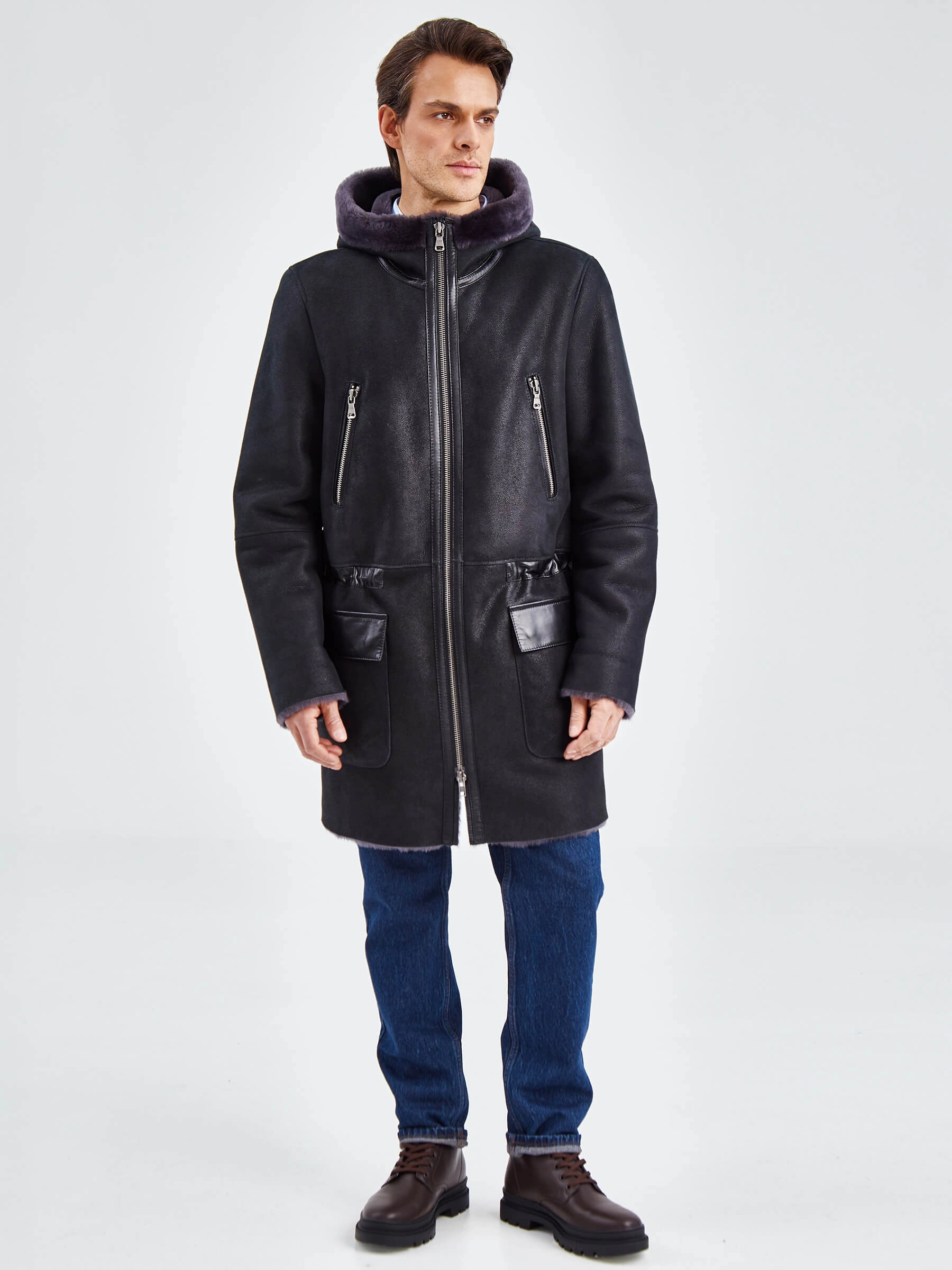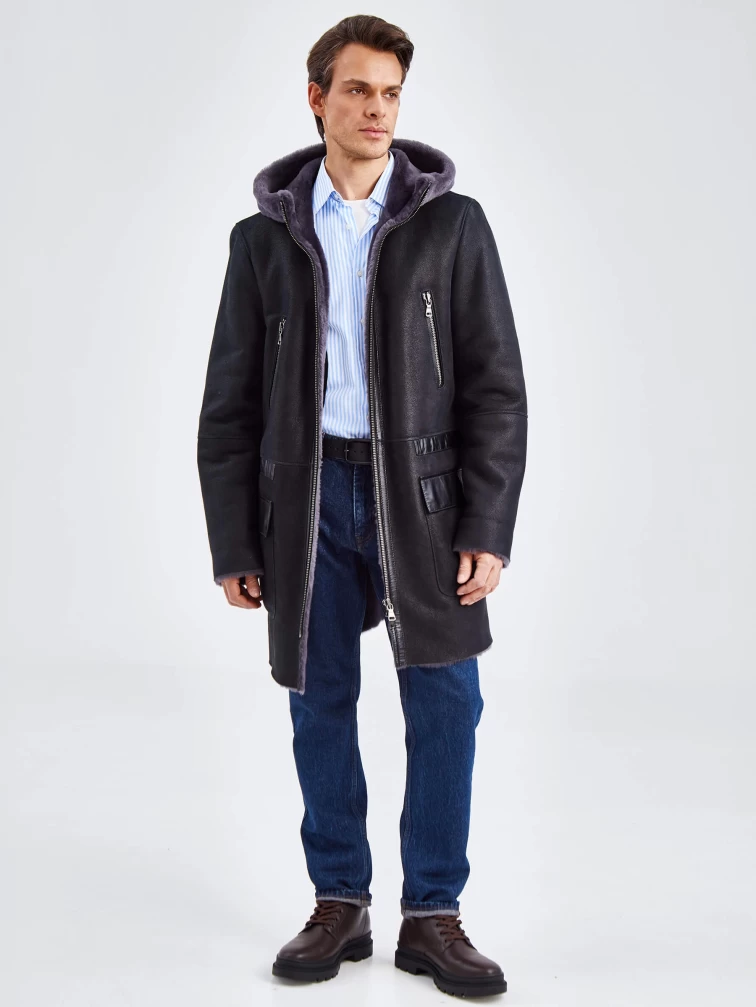 Длинная мужская дубленка с капюшоном премиум класса 429, черная, размер 48, артикул 71460