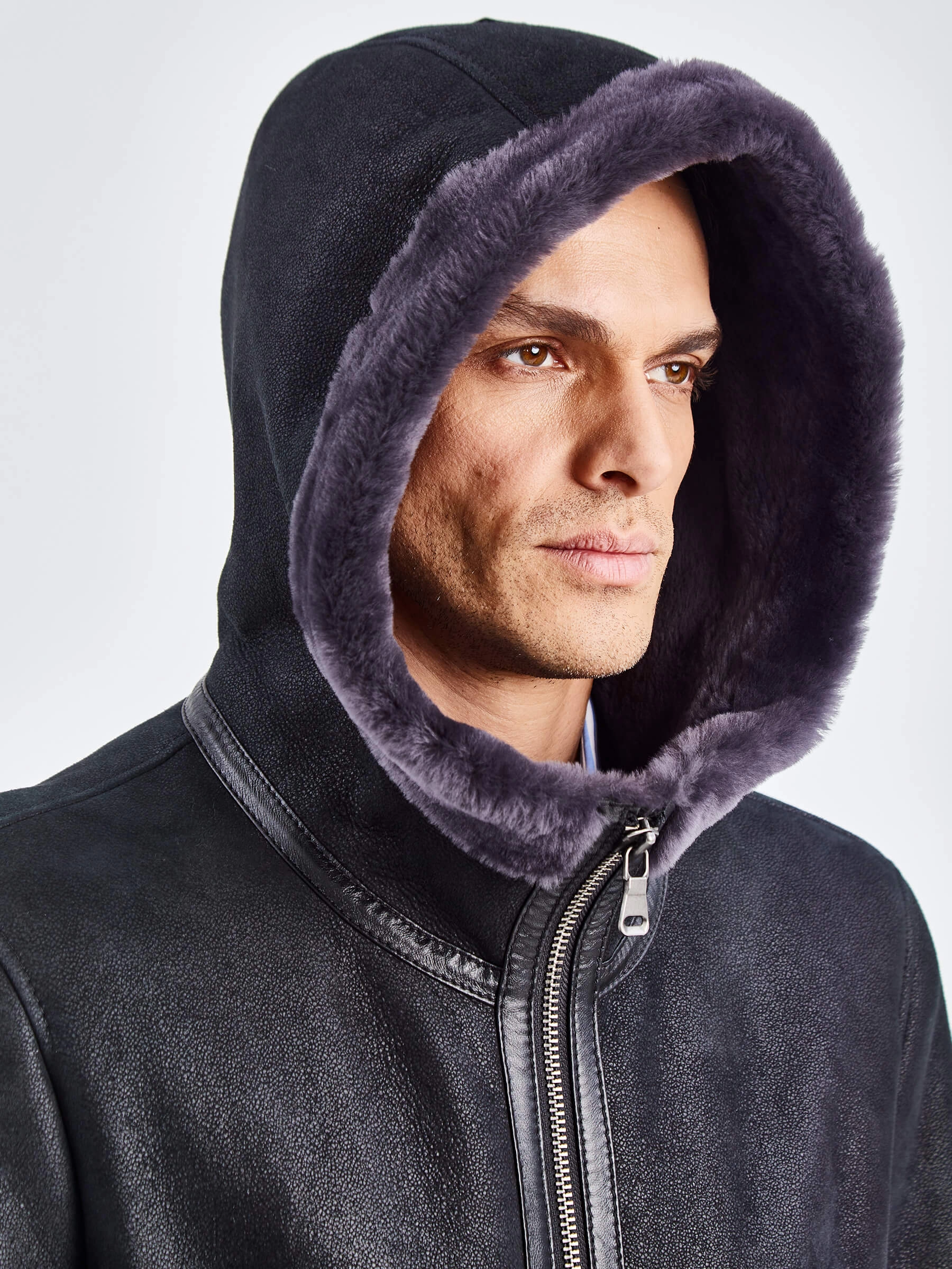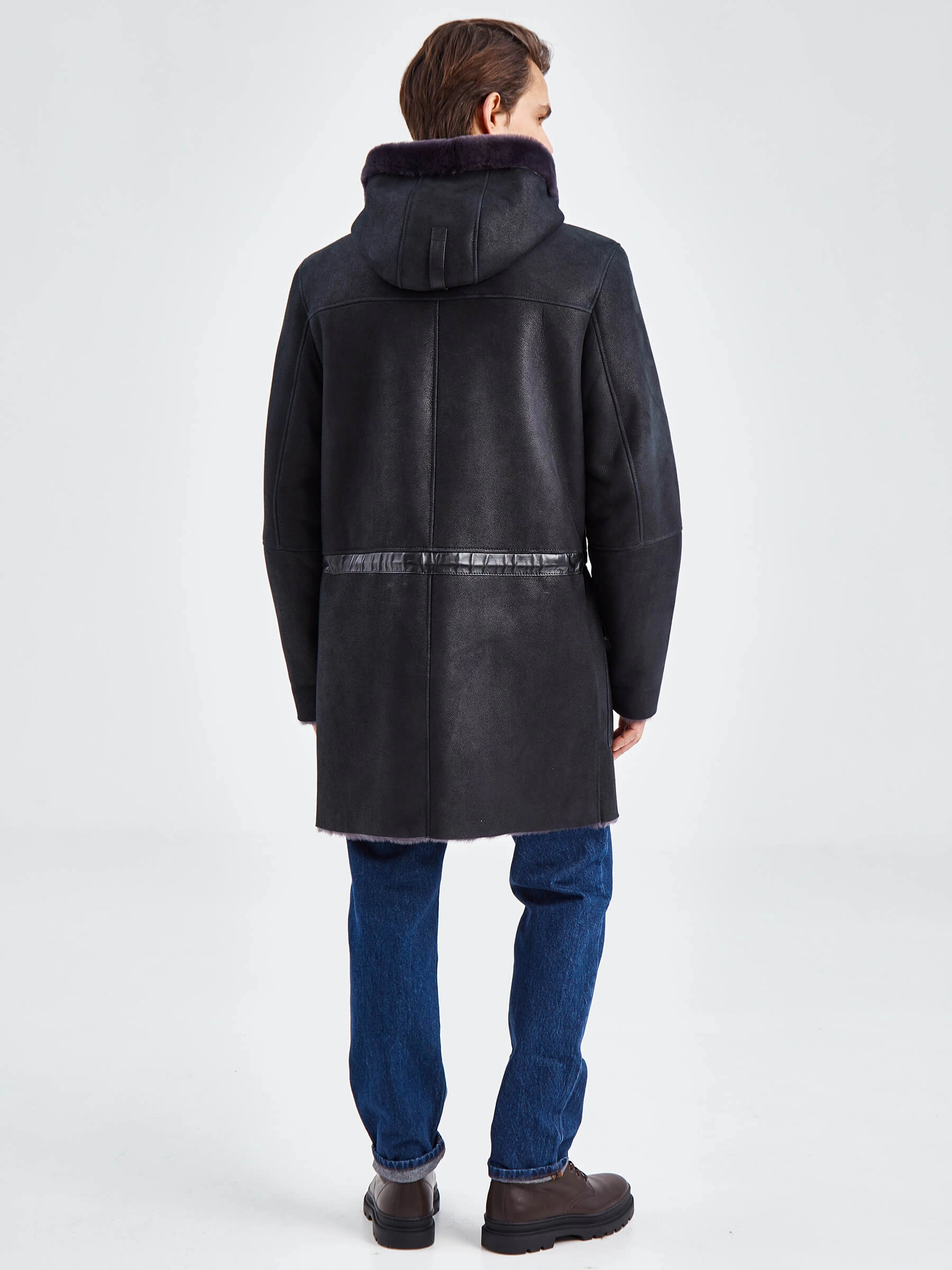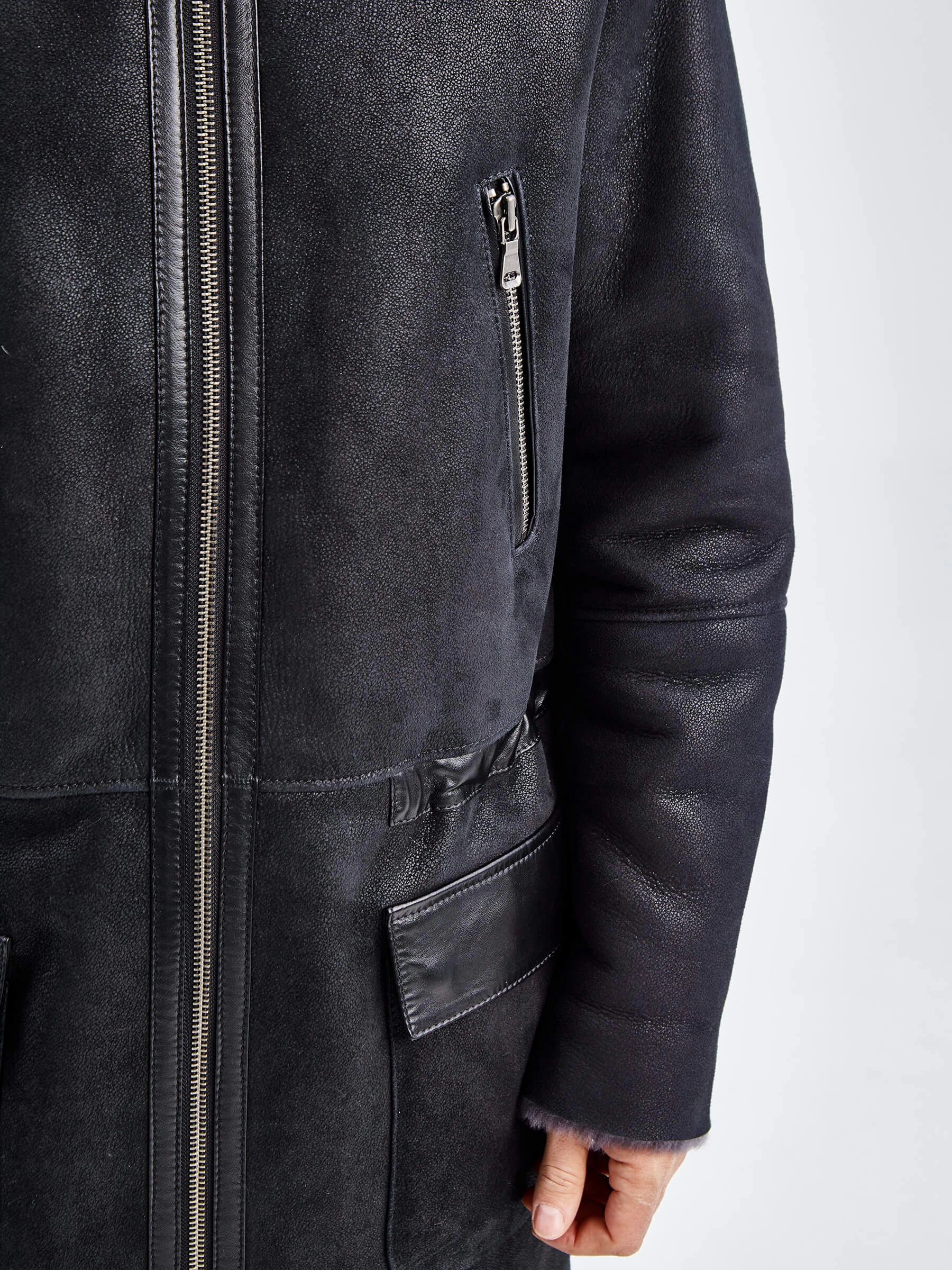 Длинная мужская дубленка с капюшоном премиум класса 429, черная, размер 48, артикул 71460