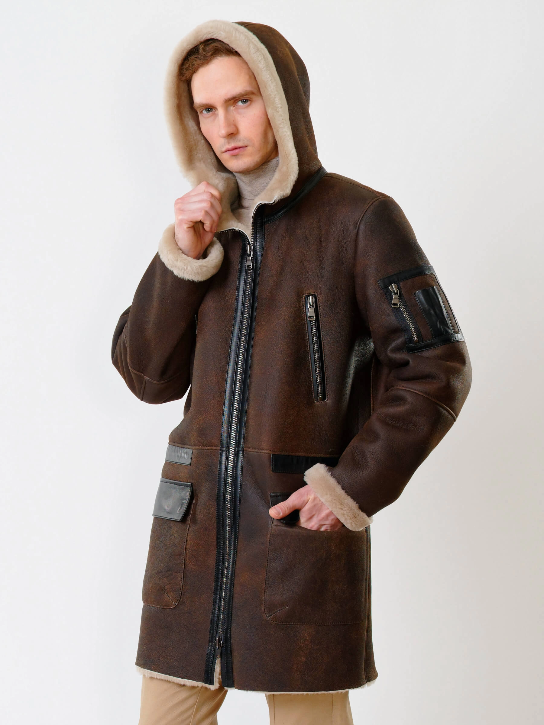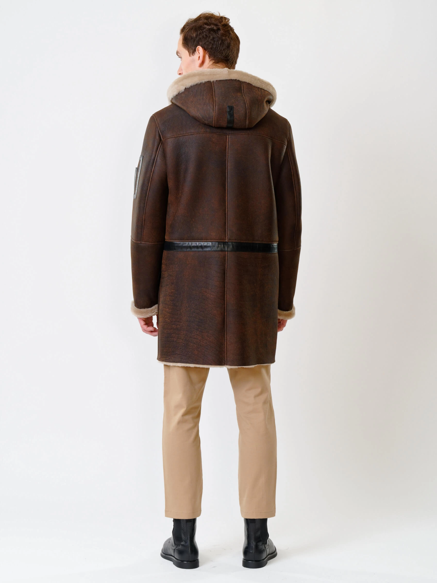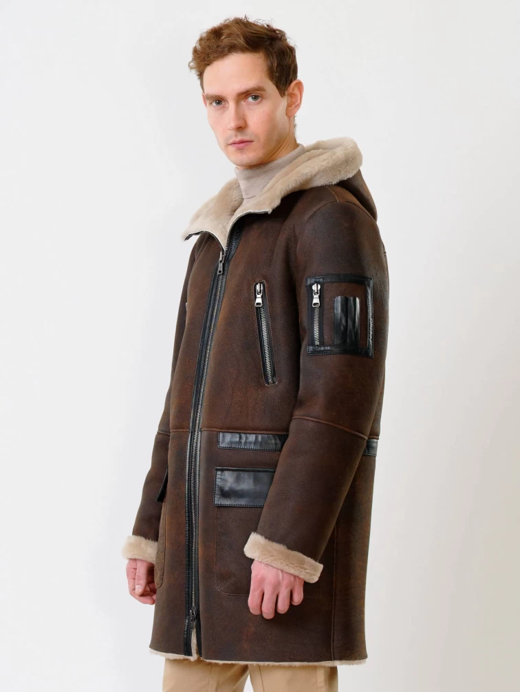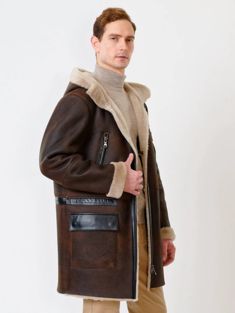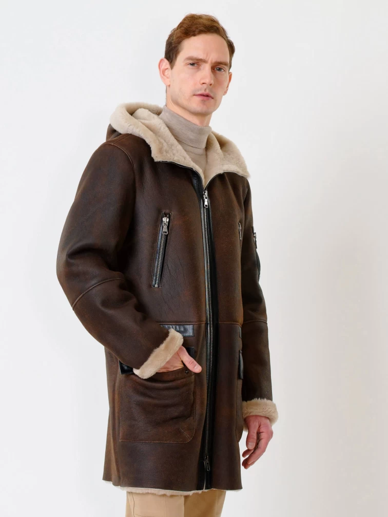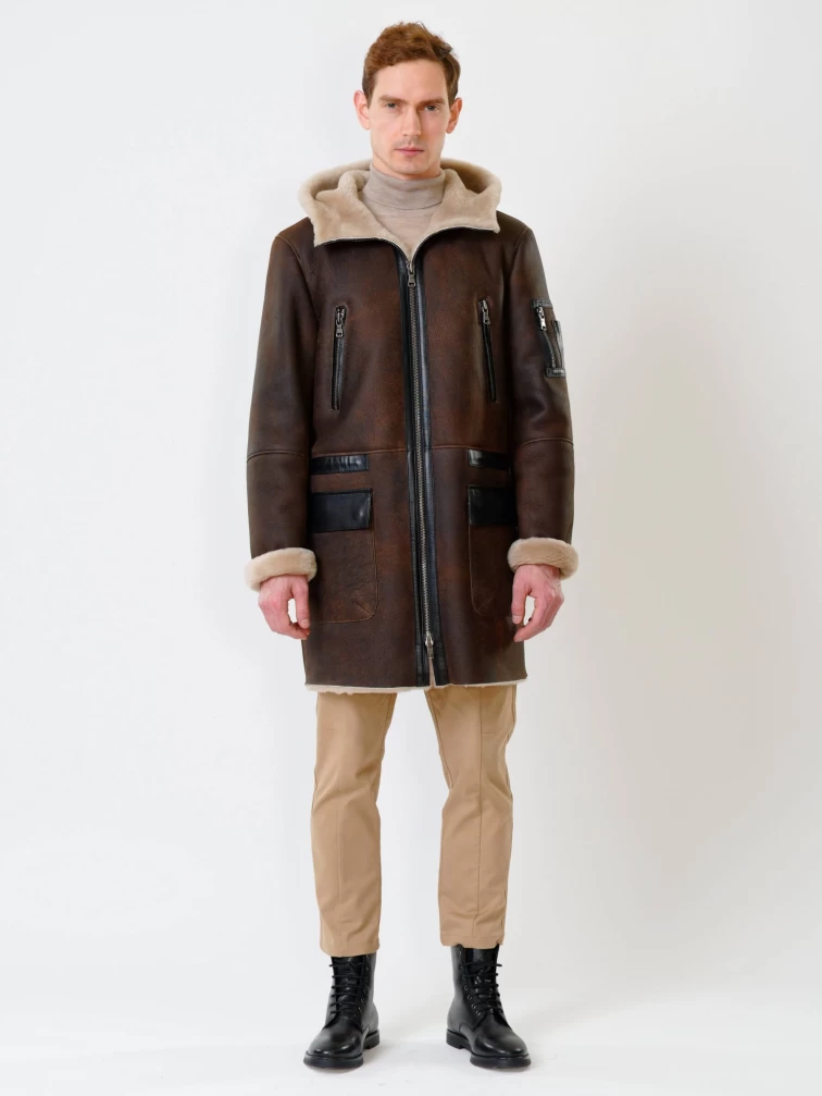 Длинная мужская дубленка с капюшоном премиум класса 429, коричневая, размер 50, артикул 70651